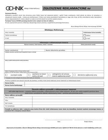 ZGŁOSZENIE REKLAMACYJNE nr sklep internetowy Szanowny Kliencie, dokładamy wszelkich starań aby otrzymany przez Ciebie towar był najwyższej jakości i spełnił Twoje oczekiwania. Jeżeli jednak się zdarzy, że zauważysz w zakupionym towarze wadę – możesz go zareklamować. O fakcie tym należy powiadomić Sprzedawcę w ciągu roku licząc od dnia stwierdzenia wady. Sprzedawca ponosi odpowiedzialność z tytułu rękojmi za wady w terminie dwóch lat od dnia wydania towaru. Pamiętaj! Towary OCHNIK posiadają dwuletni okres rękojmi od daty ich odbioru. W celu usprawnienia procesu reklamacji zakupionego towaru prosimy o wypełnienie poniższego formularza. Biuro Obsługi Klienta Sklepu internetowego OCHNIK Składający Reklamację Imię i nazwisko Preferowana forma kontaktu Telefon kontaktowy telefon E-mail e-mail Informacje o reklamowanym towarze Nazwa towaru, kod towaru, kolor i rozmiar Data powstania wady Numer dokumentu sprzedaży Numer zamówienia Dokładne określenie wad (lub innych niezgodności towaru z umową) Kiedy i w jakich okolicznościach zostały stwierdzone Żądanie Kupującego (należy zaznaczyć wybrane pole). Zgodnie z art. 560 i 561 ustawy – Kodeks cywilny z dnia 23 kwietnia 1964 r. usunięcie wady wymiana na towar wolny od wad odstąpienie od umowy (zwrot zapłaconej ceny)* obniżenie zapłaconej ceny * Kupujący nie może odstąpić od umowy, jeżeli wada jest nieistotna. Prosimy o podanie nam danych rachunku do przelewu, na który może zostać dokonany zwrot należności za reklamowany towar: Nazwa banku Numer konta bankowego Zlecenie odbioru przesyłki z reklamowanym towarem Jeśli sobie tego życzysz – możemy odebrać przesyłkę z reklamowanym przez Ciebie towarem. W tym celu należy wypełnić poniższe dane. Jeżeli chcesz samodzielnie odesłać reklamowany towar – poniższe pola pozostaw puste. Dane odbioru przesyłki Imię i nazwisko Ulica Kod i miasto Tel. kontaktowy Przesyłki są odbierane tylko i wyłącznie przez kuriera firmy GLS. Jeżeli reklamowany towar okaże się niewadliwy, kosztami wysłania zwracanego towaru, w wysokości 20 zł, obciążony zostanie Klient. Data Podpis Klienta Zapraszamy do kontaktu z Biurem Obsługi Klienta Sklepu internetowego OCHNIK pod numer infolinii 25 748 43 10 lub adresem e-mail: [email protected]