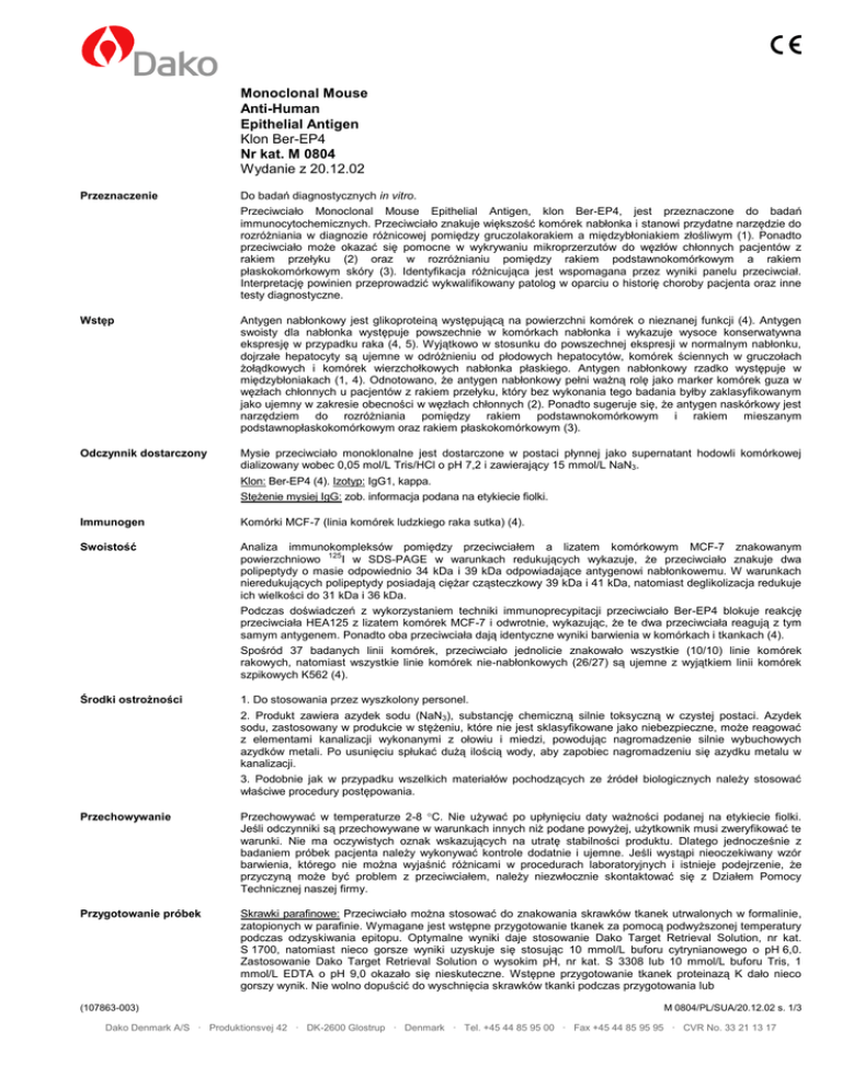 Monoclonal Mouse Anti-Human Epithelial Antigen Klon Ber-EP4 Nr kat. M 0804 Wydanie z 20.12.02 Przeznaczenie Do badań diagnostycznych in vitro. Przeciwciało Monoclonal Mouse Epithelial Antigen, klon Ber-EP4, jest przeznaczone do badań immunocytochemicznych. Przeciwciało znakuje większość komórek nabłonka i stanowi przydatne narzędzie do rozróżniania w diagnozie różnicowej pomiędzy gruczolakorakiem a międzybłoniakiem złośliwym (1). Ponadto przeciwciało może okazać się pomocne w wykrywaniu mikroprzerzutów do węzłów chłonnych pacjentów z rakiem przełyku (2) oraz w rozróżnianiu pomiędzy rakiem podstawnokomórkowym a rakiem płaskokomórkowym skóry (3). Identyfikacja różnicująca jest wspomagana przez wyniki panelu przeciwciał. Interpretację powinien przeprowadzić wykwalifikowany patolog w oparciu o historię choroby pacjenta oraz inne testy diagnostyczne. Wstęp Antygen nabłonkowy jest glikoproteiną występującą na powierzchni komórek o nieznanej funkcji (4). Antygen swoisty dla nabłonka występuje powszechnie w komórkach nabłonka i wykazuje wysoce konserwatywna ekspresję w przypadku raka (4, 5). Wyjątkowo w stosunku do powszechnej ekspresji w normalnym nabłonku, dojrzałe hepatocyty są ujemne w odróżnieniu od płodowych hepatocytów, komórek ściennych w gruczołach żołądkowych i komórek wierzchołkowych nabłonka płaskiego. Antygen nabłonkowy rzadko występuje w międzybłoniakach (1, 4). Odnotowano, że antygen nabłonkowy pełni ważną rolę jako marker komórek guza w węzłach chłonnych u pacjentów z rakiem przełyku, który bez wykonania tego badania byłby zaklasyfikowanym jako ujemny w zakresie obecności w węzłach chłonnych (2). Ponadto sugeruje się, że antygen naskórkowy jest narzędziem do rozróżniania pomiędzy rakiem podstawnokomórkowym i rakiem mieszanym podstawnopłaskokomórkowym oraz rakiem płaskokomórkowym (3). Odczynnik dostarczony Mysie przeciwciało monoklonalne jest dostarczone w postaci płynnej jako supernatant hodowli komórkowej dializowany wobec 0,05 mol/L Tris/HCl o pH 7,2 i zawierający 15 mmol/L NaN3. Klon: Ber-EP4 (4). Izotyp: IgG1, kappa. Stężenie mysiej IgG: zob. informacja podana na etykiecie fiolki. Immunogen Komórki MCF-7 (linia komórek ludzkiego raka sutka) (4). Swoistość Analiza immunokompleksów pomiędzy przeciwciałem a lizatem komórkowym MCF-7 znakowanym powierzchniowo 125I w SDS-PAGE w warunkach redukujących wykazuje, że przeciwciało znakuje dwa polipeptydy o masie odpowiednio 34 kDa i 39 kDa odpowiadające antygenowi nabłonkowemu. W warunkach nieredukujących polipeptydy posiadają ciężar cząsteczkowy 39 kDa i 41 kDa, natomiast deglikolizacja redukuje ich wielkości do 31 kDa i 36 kDa. Podczas doświadczeń z wykorzystaniem techniki immunoprecypitacji przeciwciało Ber-EP4 blokuje reakcję przeciwciała HEA125 z lizatem komórek MCF-7 i odwrotnie, wykazując, że te dwa przeciwciała reagują z tym samym antygenem. Ponadto oba przeciwciała dają identyczne wyniki barwienia w komórkach i tkankach (4). Spośród 37 badanych linii komórek, przeciwciało jednolicie znakowało wszystkie (10/10) linie komórek rakowych, natomiast wszystkie linie komórek nie-nabłonkowych (26/27) są ujemne z wyjątkiem linii komórek szpikowych K562 (4). Środki ostrożności 1. Do stosowania przez wyszkolony personel. 2. Produkt zawiera azydek sodu (NaN3), substancję chemiczną silnie toksyczną w czystej postaci. Azydek sodu, zastosowany w produkcie w stężeniu, które nie jest sklasyfikowane jako niebezpieczne, może reagować z elementami kanalizacji wykonanymi z ołowiu i miedzi, powodując nagromadzenie silnie wybuchowych azydków metali. Po usunięciu spłukać dużą ilością wody, aby zapobiec nagromadzeniu się azydku metalu w kanalizacji. 3. Podobnie jak w przypadku wszelkich materiałów pochodzących ze źródeł biologicznych należy stosować właściwe procedury postępowania. Przechowywanie Przechowywać w temperaturze 2-8 C. Nie używać po upłynięciu daty ważności podanej na etykiecie fiolki. Jeśli odczynniki są przechowywane w warunkach innych niż podane powyżej, użytkownik musi zweryfikować te warunki. Nie ma oczywistych oznak wskazujących na utratę stabilności produktu. Dlatego jednocześnie z badaniem próbek pacjenta należy wykonywać kontrole dodatnie i ujemne. Jeśli wystąpi nieoczekiwany wzór barwienia, którego nie można wyjaśnić różnicami w procedurach laboratoryjnych i istnieje podejrzenie, że przyczyną może być problem z przeciwciałem, należy niezwłocznie skontaktować się z Działem Pomocy Technicznej naszej firmy. Przygotowanie próbek Skrawki parafinowe: Przeciwciało można stosować do znakowania skrawków tkanek utrwalonych w formalinie, zatopionych w parafinie. Wymagane jest wstępne przygotowanie tkanek za pomocą podwyższonej temperatury podczas odzyskiwania epitopu. Optymalne wyniki daje stosowanie Dako Target Retrieval Solution, nr kat. S 1700, natomiast nieco gorsze wyniki uzyskuje się stosując 10 mmol/L buforu cytrynianowego o pH 6,0. Zastosowanie Dako Target Retrieval Solution o wysokim pH, nr kat. S 3308 lub 10 mmol/L buforu Tris, 1 mmol/L EDTA o pH 9,0 okazało się nieskuteczne. Wstępne przygotowanie tkanek proteinazą K dało nieco gorszy wynik. Nie wolno dopuścić do wyschnięcia skrawków tkanki podczas przygotowania lub (107863-003) M 0804/PL/SUA/20.12.02 s. 1/3 Dako Denmark A/S · Produktionsvej 42 · DK-2600 Glostrup · Denmark · Tel. +45 44 85 95 00 · Fax +45 44 85 95 95 · CVR No. 33 21 13 17 następującej po nim procedury barwienia immunocytochemicznego. Skrawki zamrożone i przygotowanie komórek: Przeciwciało można stosować do znakowania zamrożonych skrawków utrwalonych w acetonie oraz do preparatów komórkowych (4). Procedura barwienia Rozcieńczanie: Przeciwciało Monoclonal Mouse Anti-Human Epithelial Antigen, nr kat. M 0804, można rozcieńczać w zakresie 1:200-1:400 w prz