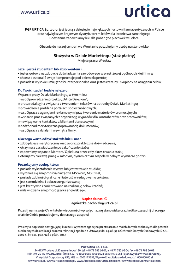 PGF URTICA Sp. z o.o. jest jedną z dziesięciu największych hurtowni farmaceutycznych w Polsce oraz największym krajowym dystrybutorem leków dla lecznictwa zamkniętego. Codziennie zapewniamy leki dla ponad 700 placówek w Polsce. Obecnie do naszej centrali we Wrocławiu poszukujemy osobę na stanowisko: Stażysta w Dziale Marketingu (staż płatny) Miejsce pracy: Wrocław Jeżeli jesteś studentem lub absolwentem i …: • jesteś gotowy na zdobycie doświadczenia zawodowego w prestiżowej ogólnopolskiej firmie; • chcesz doskonalić swoje kompetencje pod okiem ekspertów; • posiadasz wysokie umiejętności interpersonalne oraz jesteś rzetelny i skupiony na osiąganiu celów. Do Twoich zadań będzie należało: Wsparcie pracy Działu Marketingu, w tym m.in.: • współprowadzenie projektu „Urtica Dzieciom”; • praca redakcyjna związana z tworzeniem tekstów na potrzeby Działu Marketingu; • prowadzenie profili na portalach społecznościowych; • współpraca z agencjami reklamowymi przy tworzeniu materiałów promocyjnych; • wsparcie prac związanych z organizacją wyjazdów dla kontrahentów oraz pracowników; • nawiązywanie kontaktów z klientami biznesowymi; • nadzór nad merytoryczną poprawnością dokumentów; • współpraca z działami wewnątrz firmy. Dlaczego warto odbyć staż właśnie u nas? • zdobędziesz merytoryczną wiedzę oraz praktyczne doświadczenie; • otrzymasz zaświadczenie po zakończeniu stażu; • zapewnimy wsparcie Mentora/ Opiekuna przez cały okres trwania stażu; • oferujemy ciekawą pracę w młodym, dynamicznym zespole w pełnym wymiarze godzin. Poszukujemy osobę, która: • posiada wykształcenie wyższe lub jest w trakcie studiów; • wyróżnia się znajomością narzędzia MS Word, MS Excel; • posiada zdolności graficzne i łatwość w redagowaniu tekstów; • jest samodzielna i dobrze zorganizowana; • jest kreatywna i zorientowana na realizację celów i zadań; • mile widziana znajomość języka angielskiego. Napisz do nas! ☺ [email protected] Prześlij nam swoje CV w tytule wiadomości wpisując nazwę stanowiska oraz krótko uzasadnij dlaczego właśnie Ciebie potrzebujemy do naszego zespołu! Prosimy o dopisanie następującej klauzuli: Wyrażam zgodę na przetwarzanie moich danych osobowych dla potrzeb niezbędnych do realizacji procesu rekrutacji zgodnie z Ustawą z dn. 29.08.97 o Ochronie Danych Osobowych (Dz. U. 2002 r., Nr 101, poz. 926 z późn. zm.).