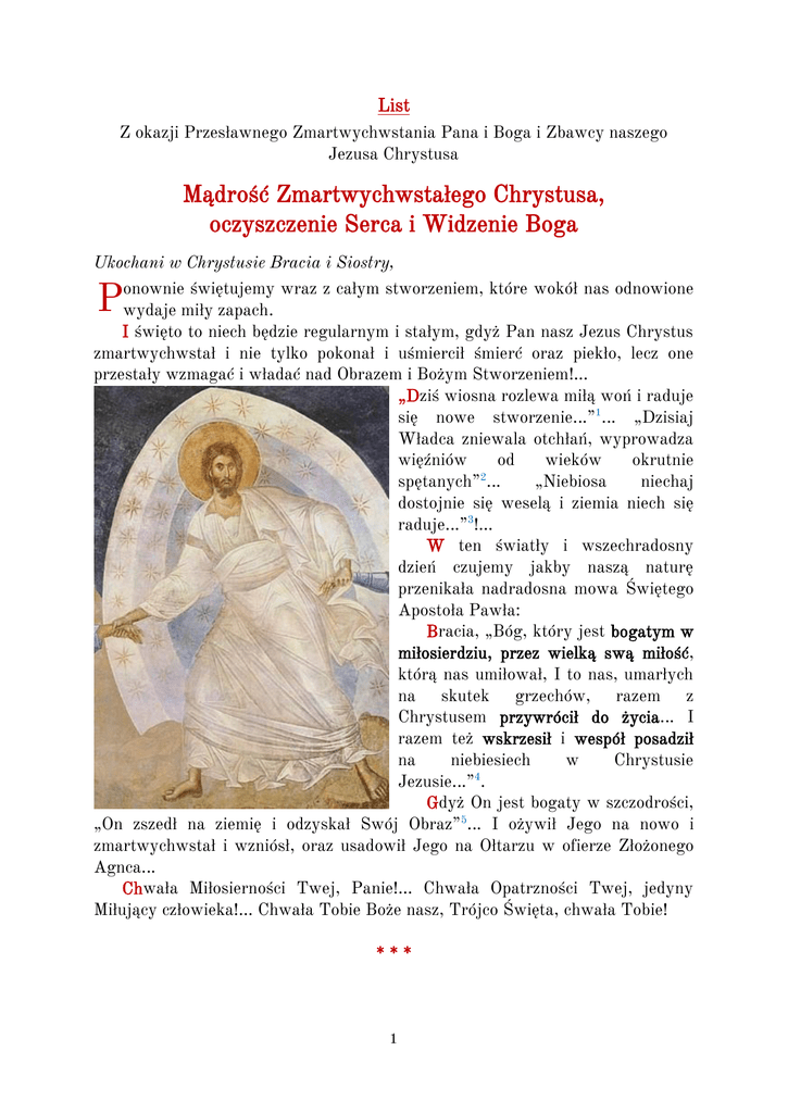 List Z okazji Przesławnego Zmartwychwstania Pana i Boga i Zbawcy naszego Jezusa Chrystusa Mądrość Zmartwychwstałego Chrystusa, oczyszczenie Serca i Widzenie Boga Ukochani w Chrystusie Bracia i Siostry, świętujemy wraz z całym stworzeniem, które wokół nas odnowione Ponownie wydaje miły zapach. I święto to niech będzie regularnym i stałym, gdyż Pan nasz Jezus Chrystus zmartwychwstał i nie tylko pokonał i uśmiercił śmierć oraz piekło, lecz one przestały wzmagać i władać nad Obrazem i Bożym Stworzeniem!... „Dziś wiosna rozlewa miłą woń i raduje się nowe stworzenie…”1… „Dzisiaj Władca zniewala otchłań, wyprowadza więźniów od wieków okrutnie 2 spętanych” … „Niebiosa niechaj dostojnie się weselą i ziemia niech się raduje…”3!... W ten światły i wszechradosny dzień czujemy jakby naszą naturę przenikała nadradosna mowa Świętego Apostoła Pawła: Bracia, „Bóg, który jest bogatym w miłosierdziu, przez wielką swą miłość, którą nas umiłował, I to nas, umarłych na skutek grzechów, razem z Chrystusem przywrócił do życia… I razem też wskrzesił i wespół posadził na niebiesiech w Chrystusie 4 Jezusie…” . Gdyż On jest bogaty w szczodrości, „On zszedł na ziemię i odzyskał Swój Obraz”5… I ożywił Jego na nowo i zmartwychwstał i wzniósł, oraz usadowił Jego na Ołtarzu w ofierze Złożonego Agnca… Chwała Miłosierności Twej, Panie!... Chwała Opatrzności Twej, jedyny Miłujący człowieka!... Chwała Tobie Boże nasz, Trójco Święta, chwała Tobie! *** 1 Ukochani Bracia i Siostry w Chrystusie, „Czymś wielkim jest człowiek!”, słyszy się z głębi wieków od rozumnego Mędrca Starego Testamentu6. To Boże stworzenie, które nazywa się Człowiek, rzeczywiście wielkie! On – najlepszym stworzeniem, zwieńczeniem stworzenia, Obrazem Bożym… I właśnie ze względu na swoją wielkość, on powinien – ożywiony, oswobodzony i odnowiony, – znów znaleźć swą poprzednią chwałę, swoją pierwszą piękność w chwale Świętej Trójcy, aby widzieć Boga!... Chrystusowe Zmartwychwstanie odnawia, daje początek okresowi możności widzenia Boga… To łaskawe Dobrodziejstwo Widzenia Boga będzie nam w pełni dane w Ostatnim Dniu, przy Odnowieniu Stworzenia, gdy „ujrzymy Jego jako jest”7… Wtedy słudzy Boży ujrzą Oblicze Jego: a Imię Jego na ich czołach”8. Lecz ucieleśniony i ukrzyżowany i zmartwychwstały Pan i Bóg nasz uważa szczęśliwymi i w rzeczy samej szczęśliwi ci ludzie, którzy w tym życiu będą posiadać czystą i dziewiczą duszę, gdyż oni ujrzą Boga: „Błogosławieni czystego serca; albowiem oni Boga ujrzą”9. *** Ukochani w Chrystusie Bracia i Siostry, Widzenie Boga wymaga, jak my wszyscy wiemy, zmiany nastawienia: przestańmy zajmować i troszczyć się o siebie samych, aby przyswoić i przeniknąć w Rozumowanie Zmartwychwstałego Chrystusa; to znaczy Rozum, nastawienie, sposób myślenia pełen samoofiarności i troski za innych, ofiarnej pokory i posłuszeństwa. Bracia, Święty Apostoł Paweł napomina nas, „aby każdy upatrywał, nie tylko co swego jest, ale tego, co drugich. Albowiem to w sobie rozważajcie, co i w Chrystusie Jezusie”10. Bóg stał się człowiekiem aby nam przekazać Swą Mądrość. Ta Mądrość przywodzi nas ku Miłości i Miłosierdziu... I da nam Czystość Serca… I wtedy, otrzymamy wielki Dar Widzenia Boga. „Czystość serca”, mówi abba Izaak Syryjczyk, „to – miłość ku słabym, którzy upadają”… I kontynuując: „Jeśli zobaczysz brata twego, który zgrzeszył, okryj jego plecy szatą twej miłości”11. Na tyle świetlista miłość wypływa tylko od Mądrości Zmartwychwstałego Chrystusa… Ta Miłość w rzeczy samej jawi się oczyszczającą, twórczą i działającą, gdyż „Ona jest dana z natury rzeczy”12, jak zapewnia nas święty arcypasterz Jan Złotousty. Miłość ta bezpiecznie prowadzi nas ku Widzeniu Boga w Światłości Zmartwychwstania i chwały Świętej Trójcy. Tak więc, „czymś wielkim jest człowiek!”, lecz jeszcze cenniejszym jest człowiek miłosierny: „i inną (drogocenniejszą rzeczą) mąż czyniący miłosierdzie”13! *** 2 Modlitwy naszego szczególnie szanowanego starca i metropolity, władyki Cypriana, Łaska Zmartwychwstania naszego Zbawiciela Jezusa Chrystusa i Orędownictwo Bogarodzicy niech umocnią nas, moi Bracia, w trudzie zmienienia sposobu myślenia, abyśmy stali się prawdziwie miłosiernymi, oraz aby nasze serca oczyściły się i abyśmy dostąpili zaszczytu Widzenia Boga, teraz i zawsze i na wieki wieków. Amen! Chrystus Zmartwychwstał! Zaiste Zmartwychwstał! † Święte Zmartwychwstanie Pana naszego Jezusa Chrystusa 2013 roku Wasz pokorny orędownik przed Zmartwychwstałym Chrystusem, † Cyprian Biskup Orejski Zastępca Przewodniczącego Świątobliwego Synodu Przeciwstawiających się (Grecka Starostylna Cerkiew Prawosławna) 1 «Днесь весна благоухаетъ и новая тварь ликуетъ...» (Ексапостиларій недѣли Антипасхи). «Днесь Владыка плѣни ада, воздвигнувый юзники, яже отъ вѣка имяше лютѣ одержимыя...» (Стихъ 8-ой Пѣсни изъ Канона Пасхи). 3 «Небеса убо достойно да веселятся. земля же да радуется…» (Тропарь 1-ой Пѣсни изъ Канона Пасхи). 4 Ef 2, 4-6. 5 Mikołaj Kabasilas, T. 150, 504В, O Życiu w Chrystusie, Słowo 30, § 18. 6 Prz 20, 6. 7 1 J 3, 2. 8 Ap 22, 6. 9 Mt 5, 8. 10 Filip 2, 4-5. 11 Prepodobny Izaak Syryjczyk, Słowo 58, str. 239 (wyd. greckie). 12 Święty arcypasterz Jan Złotousty, T. 61, 274, Słowo 32 na Pierwszy List do Koryntian, § 6. 13 Prz 20, 6. 2 3