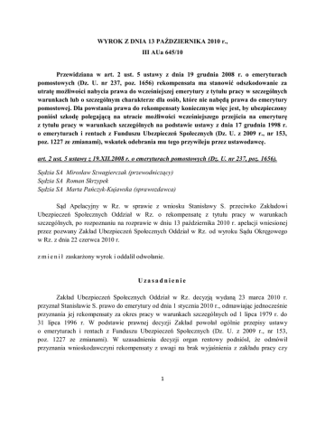 WYROK Z DNIA 13 PAŹDZIERNIKA 2010 r., III AUa 645/10 Przewidziana w art. 2 ust. 5 ustawy z dnia 19 grudnia 2008 r. o emeryturach pomostowych (Dz. U. nr 237, poz. 1656) rekompensata ma stanowić odszkodowanie za utratę możliwości nabycia prawa do wcześniejszej emerytury z tytułu pracy w szczególnych warunkach lub o szczególnym charakterze dla osób, które nie nabędą prawa do emerytury pomostowej. Dla powstania prawa do rekompensaty koniecznym więc jest, by ubezpieczony poniósł szkodę polegającą na utracie możliwości wcześniejszego przejścia na emeryturę z tytułu pracy w warunkach szczególnych na podstawie ustawy z dnia 17 grudnia 1998 r. o emeryturach i rentach z Funduszu Ubezpieczeń Społecznych (Dz. U. z 2009 r., nr 153, poz. 1227 ze zmianami), wskutek odebrania mu tego przywileju przez ustawodawcę. art. 2 ust. 5 ustawy z 19.XII.2008 r. o emeryturach pomostowych (Dz. U. nr 237, poz. 1656). Sędzia SA Mirosław Szwagierczak (przewodniczący) Sędzia SA Roman Skrzypek Sędzia SA Marta Pańczyk-Kujawska (sprawozdawca) Sąd Apelacyjny w Rz. w sprawie z wniosku Stanisławy S. przeciwko Zakładowi Ubezpieczeń Społecznych Oddział w Rz. o rekompensatę z tytułu pracy w warunkach szczególnych, po rozpoznaniu na rozprawie w dniu 13 października 2010 r. apelacji wniesionej przez pozwany Zakład Ubezpieczeń Społecznych Oddział w Rz. od wyroku Sądu Okręgowego w Rz. z dnia 22 czerwca 2010 r. z m i e n i ł zaskarżony wyrok i oddalił odwołanie. U za sa dnienie Zakład Ubezpieczeń Społecznych Oddział w Rz. decyzją wydaną 23 marca 2010 r. przyznał Stanisławie S. prawo do emerytury od dnia 1 stycznia 2010 r., odmawiając jednocześnie przyznania jej rekompensaty za okres pracy w warunkach szczególnych od 1 lipca 1979 r. do 31 lipca 1996 r. W podstawie prawnej decyzji Zakład powołał ogólnie przepisy ustawy o emeryturach i rentach z Funduszu Ubezpieczeń Społecznych (Dz. U. z 2009 r., nr 153, poz. 1227 ze zmianami). W uzasadnieniu decyzji organ rentowy podniósł, że odmówił przyznania wnioskodawczyni rekompensaty z uwagi na brak wyjaśnienia z zakładu pracy czy 1 odwołująca stale przebywała przy stanowiskach robotniczych i czy wykonywała inne prace administracyjno-biurowe będąc zatrudniona jako kierownik budowy. W odwołaniu skierowanym do Sądu Okręgowego Sądu Pracy i Ubezpieczeń Społecznych w Rz. Stanisława S. podniosła, że przedstawiła Zakładowi świadectwo wykonywania pracy w warunkach szczególnych wystawione zgodnie z przepisami obowiązującymi w okresie jej zatrudnienia w warunkach szczególnych. W odpowiedzi na odwołanie, pozwany organ rentowy wniósł o jego oddalenie, w uzasadnieniu podając tę samą argumentację, która legła u podstaw zaskarżonej decyzji. Sąd Okręgowy w Rz. po rozpoznaniu sprawy z wniosku Stanisławy S. wyrokiem z 22 czerwca 2010 r. zmienił zaskarżoną decyzję w ten sposób, że przyznał wnioskodawczyni rekompensatę z tytułu zatrudnienia w szczególnych warunkach w okresie od 1 listopada 1979 r. do 31 lipca 1996 r. Rozpoznając odwołanie Sąd I instancji wskazał w pierwszej kolejności, na niekwestionowane przez strony okoliczności, dotyczące daty urodzenia wnioskodawczyni, przebiegu jej zatrudnienia, pobierania przez nią świadczenia przedemerytalnego od dnia 1 czerwca 2001 r. oraz przyznania jej prawa do emerytury w dniu 19 sierpnia 2004 r. Dalej Sąd Okręgowy przytaczając ogólnie regulacje ustawy z 19 grudnia 2008 r. o emeryturach pomostowych (Dz. U. nr 237, poz. 1656) stwierdził, iż ubezpieczonym urodzonym po 31 grudnia 1948 r. którzy legitymują się 15-letnim stażem pracy w warunkach szczególnych lub szczególnym charakterze przysługuje prawo do rekompensaty, o ile okresy pracy w warunkach szczególnych lub szczególnym charakterze przypadają przed 1 stycznia 2009 r. Sąd I instancji powołał następnie art. 32 ust. 4 ustawy o emeryturach i rentach z FUS oraz § 4 ust. 1 rozporządzenia Rady Ministrów z 7 lutego 1983 r. w sprawie wieku emerytalnego pracowników zatrudnionych w szczególnych warunkach lub w szczególnym charakterze (Dz. U. nr 8, poz. 43 ze zmianami) i uznał, że istotne dla rozstrzygnięcia sprawy jest ustalenie, czy wnioskodawczyni wykonywała prace równoznaczne z pracami wymienionymi w załączniku do rozporządzenia Rady Ministrów i czy prace te wykonywała stale i w pełnym wymiarze czasu pracy. Dalej Sąd ustalił, iż Stanisława S. pracując w „I. – Rz.” jako majster budowy od 1 listopada 1979 r. do 31 stycznia 1982 r. oraz jako kierownik budowy od 1 lutego 1982 r. do 31 lipca 1996 r. wykonywała stale i w pełnym wymiarze czasu pracę w szczególnych warunkach wymienioną w załączniku do rozporządzenia Rady Ministrów w sprawie wieku emerytalnego pracowników zatrudnionych w szczególnych warunkach lub w szczególnym charakterze w wykazie A, dziale XIV, pod poz. 24. Wobec powyższych ustaleń Sąd Okręgowy uznał, iż wnioskodawczyni należy się rekompensata, stanowiąca świadczenie odszkodowawcze z tytułu utraty przez nią prawa do wcześniejszej emerytury ze względu na szczególne warunki wykonywanej przez nią przez 15 lat pracy i zmienił zaskarżoną decyzję po myśli art. 477 14 § 2 kpc. 2 Wyrok powyższy apelacją do Sądu II instancji zaskarżył pozwany organ rentowy i zarzucił naruszenie: art. 32 ust. 4 ustawy o emeryturach i rentach z FUS w zw. z § 2 ust. 1 rozporządzenia Rady Ministrów z 7 lutego 1983 r. w sprawie wieku emerytalnego pracowników zatrudnionych w szczególnych warunkach lub w szczególnym charakterze i wykazem A, działem XIV, poz. 24 stanowiącym załącznik do w/w rozporządzenia w zw. z § 2 zarządzenia nr 9 Ministra Budownictwa i Przemysłu Materiałów Budowlanych z 1 sierpnia 1983 r. w sprawie wykazu stanowisk pracy w zakładach pracy nadzorowanych przez MBiPMB, na których są wykonywane prace w szczególnych warunkach, uprawniające do wcześniejszego przejścia na emeryturę (Dz. Urz. nr