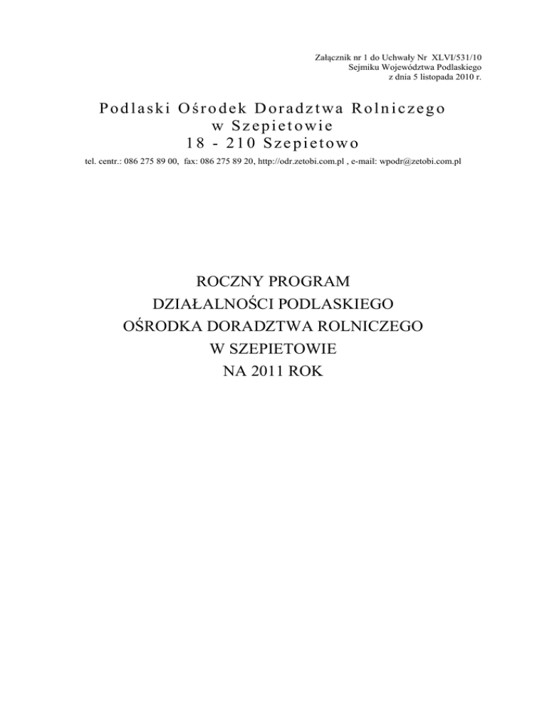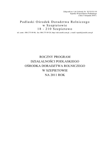 Załącznik nr 1 do Uchwały Nr XLVI/531/10 Sejmiku Województwa Podlaskiego z dnia 5 listopada 2010 r. Podlaski Ośrodek Doradztwa Rolniczego w Szepietowie 18 - 210 Szepietowo tel. centr.: 086 275 89 00, fax: 086 275 89 20, http://odr.zetobi.com.pl , e-mail: [email protected] ROCZNY PROGRAM DZIAŁALNOŚCI PODLASKIEGO OŚRODKA DORADZTWA ROLNICZEGO W SZEPIETOWIE NA 2011 ROK I. Wstęp Roczny program działalności Podlaskiego Ośrodka Doradztwa Rolniczego w Szepietowie na 2011 rok stanowi uszczegółowienie zadań, jakie na doradztwo rolnicze nakłada ustawa z dnia 22 października 2004 r. o jednostkach doradztwa rolniczego (Dz. U. 2004 nr 251 poz. 2507 z późn. zm.), ustawa z dnia 7 marca 2007 r. o wspieraniu rozwoju obszarów wiejskich z udziałem środków Europejskiego Funduszu Rolnego na rzecz Rozwoju Obszarów Wiejskich (Dz. U. 2007 nr 64 poz. 427) oraz statut nadany Podlaskiemu Ośrodkowi Doradztwa Rolniczego w Szepietowie zarządzeniem Wojewody Podlaskiego Nr 6/09 z dnia 20 stycznia 2009 roku. Z punktu widzenia doradztwa rolniczego, jego organizację i zadania w perspektywie lat 2007 - 2013 określają następujące dokumenty rangi unijnej: – Rozporządzenie Rady (WE) Nr 1782/2003 z dnia 29 września 2003 r. ustanawiające wspólne zasady dla systemów wsparcia bezpośredniego w ramach wspólnej polityki rolnej i ustanawiające określone systemy wsparcia dla rolników. Prawodawstwo wspólnotowe wprowadza zasadę wzajemnej zgodności „cross-compliance” w odniesieniu do podstawowych wymogów w zakresie zarządzania gospodarstwem w obszarach: zdrowie publiczne, zdrowie zwierząt oraz zdrowotność roślin, ochrona środowiska, dobrostan zwierząt. – Rozporządzenie Rady (WE) Nr 1783/2003 z dnia 29 września 2003 r. zmieniające rozporządzenie (WE) nr 1257/1999 w sprawie wsparcia rozwoju obszarów wiejskich z Europejskiego Funduszu Orientacji i Gwarancji Rolnej (EFOGR). – Rozporządzenie Rady (WE) Nr 1698/2005 z dnia 20 września 2005 r. w sprawie wsparcia rozwoju obszarów wiejskich przez Europejski Fundusz Rolny na rzecz Rozwoju Obszarów Wiejskich (EFRROW). Rozporządzenie określa zasady wsparcia w ramach EFRROW zasady programowania, oceny i monitorowania programów. – Rozporządzenie Rady (WE) Nr 1290/2005 z dnia 21 czerwca 2005 r. w sprawie finansowania z budżetu wspólnotowego wydatków na Wspólną Politykę Rolną i wydatków na Rozwój Obszarów Wiejskich w latach 2007-2013, tworzy odpowiednie ramy prawne do realizacji tego celu. – Rozporządzenie Komisji (WE) Nr 1974/2006 z dnia 15 grudnia 2006 r. ustanawiające szczegółowe zasady stosowania rozporządzenia Rady (WE) nr 1698/2005 w sprawie wsparcia rozwoju obszarów wiejskich przez Europejski Fundusz Rolny na rzecz Rozwoju Obszarów Wiejskich (EFRROW). W odniesieniu do rozwoju obszarów wiejskich i rolnictwa w perspektywie lat 2007 – 2013 oraz funkcjonowania doradztwa rolniczego kluczowe znaczenie mają następujące dokumenty rangi krajowej: – Strategia Rozwoju Obszarów Wiejskich i Rolnictwa na lata 2007-2013 (z elementami prognozy do roku 2020). Dokument przyjęty przez Radę Ministrów w dniu 29 czerwca 2005 r. Ministerstwo Rolnictwa i Rozwoju Wsi. Warszawa, czerwiec 2005 r. – Krajowy Plan Strategiczny Rozwoju Obszarów Wiejskich na lata 2007-2013. Ministerstwo Rolnictwa i Rozwoju Wsi. Warszawa, lipiec 2007 r. – Założenia do Krajowego Programu Rozwoju Wsi. Ministerstwo Rolnictwa i Rozwoju Wsi. Warszawa, 27 luty 2006 r. 2 – Program Rozwoju Obszarów Wiejskich na lata 2007-2013 (PROW 2007-2013). Ministerstwo Rolnictwa i Rozwoju Wsi. Warszawa, lipiec 2007 r., z uwzględnieniem zmian merytorycznych zaakceptowanych przez KE w dniu 22 czerwca 2009 r. – Krajowa Strategia Rozwoju Regionalnego 2010-2020: Regiony, Miasta, Obszary Wiejskie. Dokument przyjęty przez Radę Ministrów w dniu 13 lipiec 2010 r. Ministerstwo Rozwoju Regionalnego. Warszawa, lipiec 2010 r. Z punktu widzenia rozwoju regionalnego, a także rozwoju województwa podlaskiego istotne są następujące dokumenty: – Strategia rozwoju społeczno – gospodarczego Polski Wschodniej do roku 2020 przyjęta przez Radę Ministrów Nr 278/2008 w dnia 30 grudnia 2008 r. – Strategia Rozwoju Województwa Podlaskiego do 2020 roku. Urząd Marszałkowski Województwa Podlaskiego. Białystok, styczeń 2006 r. – Regionalny Program Operacyjny Województwa Podlaskiego na lata 2007-2013. Urząd Marszałkowski Województwa Podlaskiego. Białystok, listopad 2007 r. 1. Metodologia prac nad programem Roczny program działalności PODR w Szepietowie na 2011 rok sformułowany został w oparciu o istniejące dokumenty, posiadaną wiedzę oraz rozeznanie sytuacji w rolnictwie i na obszarach wiejskich Podlasia. Opracowanie programu działalności doradczej poprzedzone zostało szeregiem wcześniejszych działań, umożliwiających określenie preferencji i priorytetów mieszkańców wsi - między innymi poprzez zbieranie opinii w formie ankietowej, konsultacje z samorządami i liderami społeczności lokalnej. W procesie programowania zadań uczestniczyli pracownicy merytoryczni wszystkich komórek organizacyjnych Ośrodka. Podstawą do opracowania programu Podlaskiego Ośrodka Doradztwa Rolniczego były roczne programy działalności powiatowych zespołów doradztwa rolniczego. Program niniejszy, stanowi zatem syntezę programów 14 powiatowych zespołów doradztwa rolniczego, opracowanych na podstawie indywidualnych programów poszczególnych specjalistów. 2. Główne problemy mieszkańców podlaskiej wsi Województwo podlaskie należy do regionów o wysokiej dynamice rozwoju produkcji rolniczej. Dotyczy to w szczególności produkcji i przetwórstwa mleka. Wyzwaniem dla podlaskich rolników jest: dostosowanie gospodarstw do wymagań wynikających z zasady wzajemnej zgodności „cross – compliance”, a zwłaszcza standardów obowiązujących w produkcji zwierzęcej, zwiększenie udziału dochodów z działalności pozarolniczej w gospodarstwach