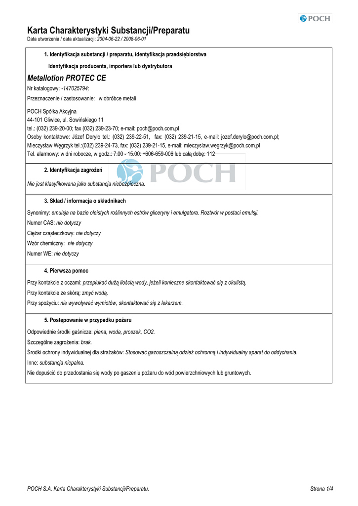 Karta Charakterystyki Substancji/Preparatu Data utworzenia / data aktualizacji: 2004-06-22 / 2008-06-01 1. Identyfikacja substancji / preparatu, identyfikacja przedsiębiorstwa Identyfikacja producenta, importera lub dystrybutora Metallotion PROTEC CE Nr katalogowy: -147025794; Przeznaczenie / zastosowanie: w obróbce metali POCH Spółka Akcyjna 44-101 Gliwice, ul. Sowińskiego 11 tel.: (032) 239-20-00; fax (032) 239-23-70; e-mail: [email protected] Osoby kontaktowe: Józef Deryło tel.: (032) 239-22-51, fax: (032) 239-21-15, e-mail: [email protected]; Mieczysław Węgrzyk tel.:(032) 239-24-73, fax: (032) 239-21-15, e-mail: [email protected] Tel. alarmowy: w dni robocze, w godz.: 7.00 - 15.00: +606-659-006 lub całą dobę: 112 2. Identyfikacja zagrożeń Nie jest klasyfikowana jako substancja niebezpieczna. 3. Skład / informacja o składnikach Synonimy: emulsja na bazie oleistych roślinnych estrów gliceryny i emulgatora. Roztwór w postaci emulsji. Numer CAS: nie dotyczy Ciężar cząsteczkowy: nie dotyczy Wzór chemiczny: nie dotyczy Numer WE: nie dotyczy 4. Pierwsza pomoc Przy kontakcie z oczami: przepłukać dużą ilością wody, jeżeli konieczne skontaktować się z okulistą. Przy kontakcie ze skórą: zmyć wodą. Przy spożyciu: nie wywoływać wymiotów, skontaktować się z lekarzem. 5. Postępowanie w przypadku pożaru Odpowiednie środki gaśnicze: piana, woda, proszek, CO2. Szczególne zagrożenia: brak. Środki ochrony indywidualnej dla strażaków: Stosować gazoszczelną odzież ochronną i indywidualny aparat do oddychania. Inne: substancja niepalna. Nie dopuścić do przedostania się wody po gaszeniu pożaru do wód powierzchniowych lub gruntowych. POCH S.A. Karta Charakterystyki Substancji/Preparatu. Strona 1/4 Metallotion PROTEC CE 6. Postępowanie w przypadku niezamierzonego uwolnienia do środowiska Uwaga! rozlana substancja stwarza poważne zagrożenie poślizgnięcia się. Zebrać przy pomocy substancji absorbującej ciecze, przekazać do likwidacji. Oczyścić zanieczyszczony teren (spłukać wodą). Nie dopuścić do dostania się do wód, ścieków i gleby. 7. Postępowanie z substancją / preparatem i jej / jego magazynowanie Obchodzenie się z substancją: Zapewnić skuteczną wymianę powietrza (wentylacja). Postępować zgodnie z zasadami dobrej praktyki przemysłowej oraz ogólnymi zasadami bezpieczeństwa i higieny pracy z substancjami chemicznymi. Stosować środki ochrony osobistej zgodnie z pkt.8. Nie opróżniać do kanalizacji. Magazynowanie: temperatura pokojowa (zalecana +15 do+25°C), maksymalna temperatura składowania +50°C. Chronić przed mrozem. Okres przechowywania średnio 6 miesięcy. Rozporządzenie Ministra Zdrowia z dnia 14 marca 2003 r. w sprawie sposobu oznakowania miejsc, rurociągów oraz pojemników i zbiorników służących do przechowywania lub zawierających substancje niebezpieczne lub preparaty niebezpieczne (Dz.U.03.61.552) 8. Kontrola narażenia i środki ochrony indywidualnej Paramerty kontroli (NDS, NDSCh, NDSP): nie ustalone. Stosować odpowiednią wentylację wywiewną, miejscową i ogólną zapewniającą utrzymanie stężenia produktu w powietrzu poniżej określonych limitów. Zaleca się wyposażenie miejsca pracy w wodny natrysk do płukania oczu oraz prysznic. Środki ochrony indywidualnej powinny być tak zaprojektowane i wykonane aby wykluczały zagrożenie i inne niedogodności w przewidywanych warunkach użytkowania, chroniące przed chemikaliami. Środki ochrony indywidualnej: ochrona dróg oddechowych: konieczna - respirator ochrona oczu: konieczna - okulary ochronne typu gogle ochrona rąk: konieczna - rękawice ochronne odporne na działanie chemikaliów wykonane z gumy nitrylowej lub inne dopuszczone przez producenta rękawic do kontaktu z tym produktem. Czas wytrzymałości materiału określa producent rękawic. ochrona ciała: konieczna - ubranie ochronne środki ochronne i higieny: zmienić zanieczyszczone ubranie, wymyć ręce po pracy z tą substancją. Rozporządzenie Ministra Zdrowia z dnia 30 grudnia 2004 r. w sprawie bezpieczeństwa i higieny pracy związanej z występowaniem w miejscu pracy czynników chemicznych (Dz.U.05.11.86). Rozporządzenie Ministra Pracy i Polityki Społecznej z dnia 30 sierpnia 2007 (Dz. U. nr 161, poz. 1142) 9. Właściwości fizyczne i chemiczne Forma: ciecz lepkość dynamiczna: Kolor: mleczna, żółtozielona lepkość kinematyczna: Zapach: słaby cytrynowy Ciśnienie par: brak danych pH: 7,0 - 7,1 (20°C) Gęstość: 0,977 g/cm3 (20°C) Temperatura topnienia: -3°C (temperatura płynności) Ciężar nasypowy: nie dotyczy Temperatura wrzenia: około 100°C Rozpuszczalność: Temperatura samozapłonu: nie dotyczy w wodzie: tworzy emulsje Temperatura zapłonu: nie dotyczy w rozpuszczalnikach organicznych: brak danych Granice wybuchowości: nie dotyczy log P(w/o): dolna: górna: POCH S.A. Karta Charakterystyki Substancji/Preparatu. Strona 2/4 Metallotion PROTEC CE 10. Stabilność i reaktywność Warunki których należy unikać: brak. Materiały których należy unikać: brak. Niebezpieczne produkty rozkładu: brak. Następne dane: brak. 11. Informacje toksykologiczne Informacje toksykologiczne: brak danych ilościowych. Pozostałe dane: w warunkach przemysłowych nie stwarza zagrożenia. 12. Informacje ekologiczne Brak danych ilościowych. Przy fachowym i ostrożnym posługiwaniu się substancją nie powinny wystąpić problemy ekologiczne. 13. Postępowanie z odpadami POCH S.A. przyjmuje do likwidacji substancje chemiczne zakupione w POCH S.A. oraz opakowania po tych substancjach. Dostawy substancji i opakowań należy każdorazowo uzgadniać z POCH S.A. Utylizacją odpadów powinny zająć się wyspecjalizowane firmy. Opakowanie jenorazowego użytku traktować jak odpad i przekazać odbiorcy odpadów. Sposób likwidacji zebranych odpadów uzgodnić z właściwym terenowo wydziałem ochrony środowiska. Ustawy z dnia 27.04.2001 (Dz.U. nr 62, poz. 628), z dnia 
