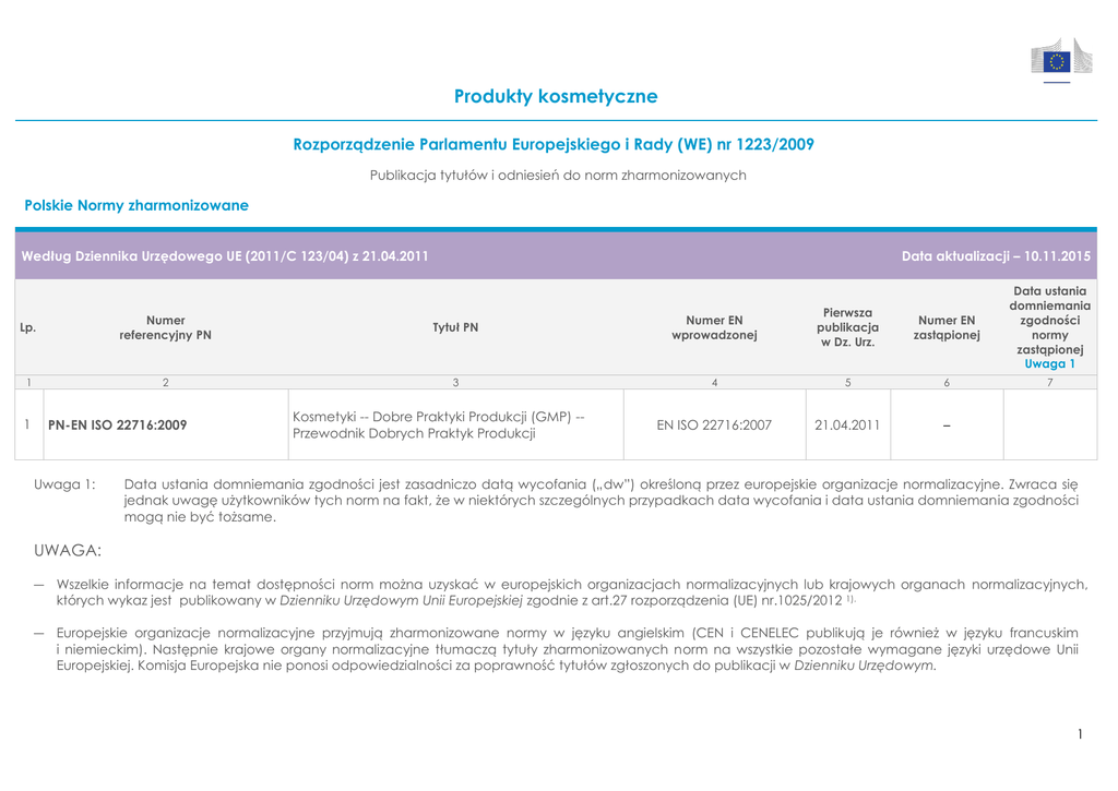 Produkty kosmetyczne Rozporządzenie Parlamentu Europejskiego i Rady (WE) nr 1223/2009 Publikacja tytułów i odniesień do norm zharmonizowanych Polskie Normy zharmonizowane Według Dziennika Urzędowego UE (2011/C 123/04) z 21.04.2011 Data aktualizacji – 10.11.2015 Lp. Numer referencyjny PN Tytuł PN Numer EN wprowadzonej Pierwsza publikacja w Dz. Urz. Numer EN zastąpionej Data ustania domniemania zgodności normy zastąpionej Uwaga 1 1 2 3 4 5 6 7 EN ISO 22716:2007 21.04.2011 – 1 PN-EN ISO 22716:2009 Uwaga 1: Kosmetyki -- Dobre Praktyki Produkcji (GMP) -Przewodnik Dobrych Praktyk Produkcji Data ustania domniemania zgodności jest zasadniczo datą wycofania („dw”) określoną przez europejskie organizacje normalizacyjne. Zwraca się jednak uwagę użytkowników tych norm na fakt, że w niektórych szczególnych przypadkach data wycofania i data ustania domniemania zgodności mogą nie być tożsame. UWAGA: ― Wszelkie informacje na temat dostępności norm można uzyskać w europejskich organizacjach normalizacyjnych lub krajowych organach normalizacyjnych, których wykaz jest publikowany w Dzienniku Urzędowym Unii Europejskiej zgodnie z art.27 rozporządzenia (UE) nr.1025/2012 1). ― Europejskie organizacje normalizacyjne przyjmują zharmonizowane normy w języku angielskim (CEN i CENELEC publikują je również w języku francuskim i niemieckim). Następnie krajowe organy normalizacyjne tłumaczą tytuły zharmonizowanych norm na wszystkie pozostałe wymagane języki urzędowe Unii Europejskiej. Komisja Europejska nie ponosi odpowiedzialności za poprawność tytułów zgłoszonych do publikacji w Dzienniku Urzędowym. 1 – Odniesienia do sprostowań …./AC:YYYY” publikuje się wyłącznie w celach informacyjnych. Za pomocą sprostowania usuwa się z tekstu normy błędy w druku, błędy językowe lub im podobne, sprostowanie może dotyczyć jednej wersji językowej lub kilku wersji językowych (angielskiej, francuskiej lub niemieckiej) normy przyjętej przez europejską organizacje normalizacyjną. ― Publikacja numerów i tytułów norm w Dzienniku Urzędowym Unii Europejskiej nie oznacza, że normy są dostępne we wszystkich językach Wspólnoty. ― Wykaz ten zastępuje wszystkie poprzednie wykazy opublikowane w Dzienniku Urzędowym Unii Europejskiej. Komisja Europejska czuwa nad uaktualnianiem wykazu. ― Więcej informacji na temat zharmonizowanych norm i innych norm europejskich można uzyskać pod następującym adresem: http://ec.europa.eu/growth/single-market/european-standards/harmonised-standards/index_en.htm 1) Dz. Urz. L 316 z 14.11.2012, s. 12. 2
