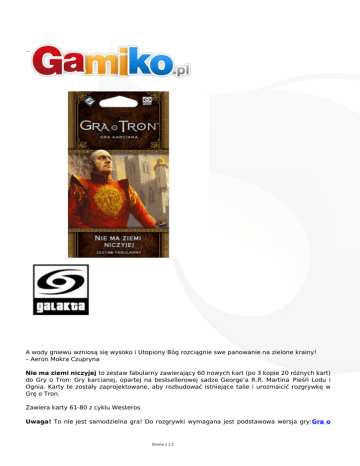 A wody gniewu wzniosą się wysoko i Utopiony Bóg rozciągnie swe panowanie na zielone krainy! – Aeron Mokra Czupryna Nie ma ziemi niczyjej to zestaw fabularny zawierający 60 nowych kart (po 3 kopie 20 różnych kart) do Gry o Tron: Gry karcianej, opartej na bestsellerowej sadze George’a R.R. Martina Pieśń Lodu i Ognia. Karty te zostały zaprojektowane, aby rozbudować istniejące talie i urozmaicić rozgrywkę w Grę o Tron. Zawiera karty 61-80 z cyklu Westeros. Uwaga! To nie jest samodzielna gra! Do rozgrywki wymagana jest podstawowa wersja gry:Gra o Strona 1 z 2 Tron: Gra karciana (2ed) . Zawartość pudełka: 60 kart Wiek 14 + Liczba graczy 2-4 Czas gry 1 - 2 godzin Instrukcja polska Wydanie polskie Producent Galakta Strona 2 z 2 - Zestaw podstawowy