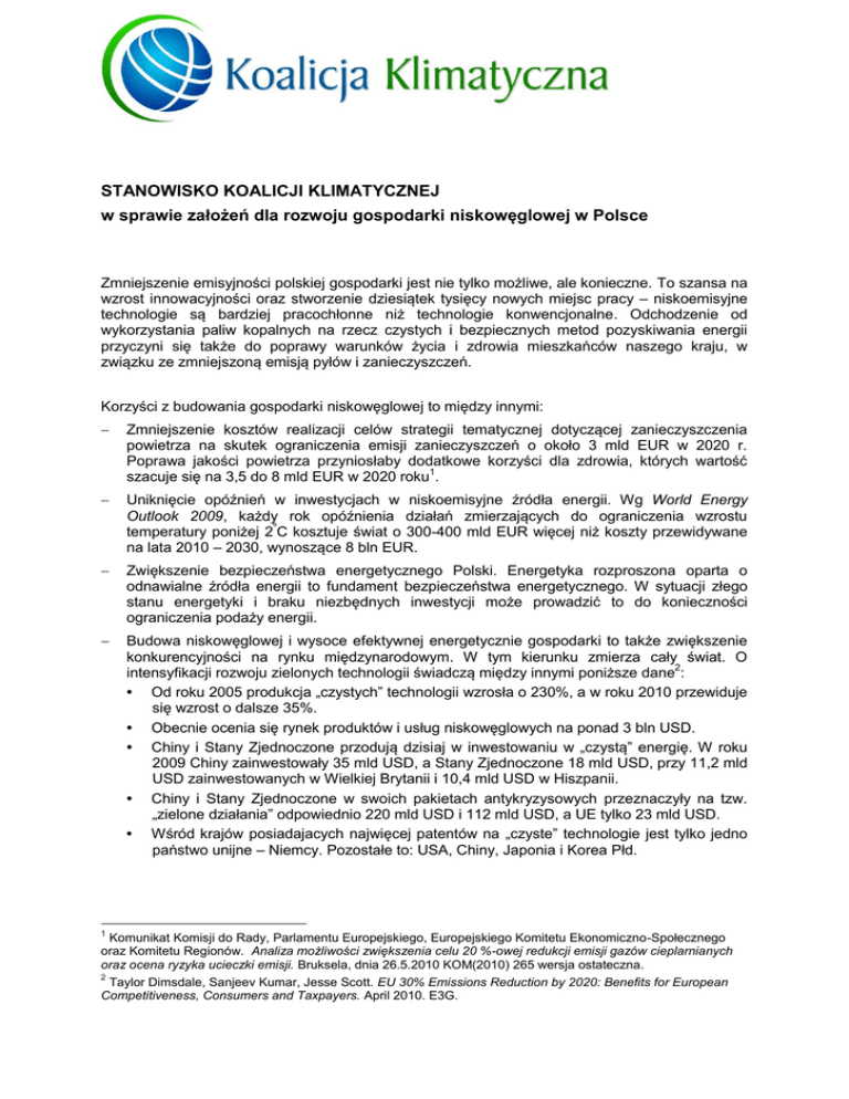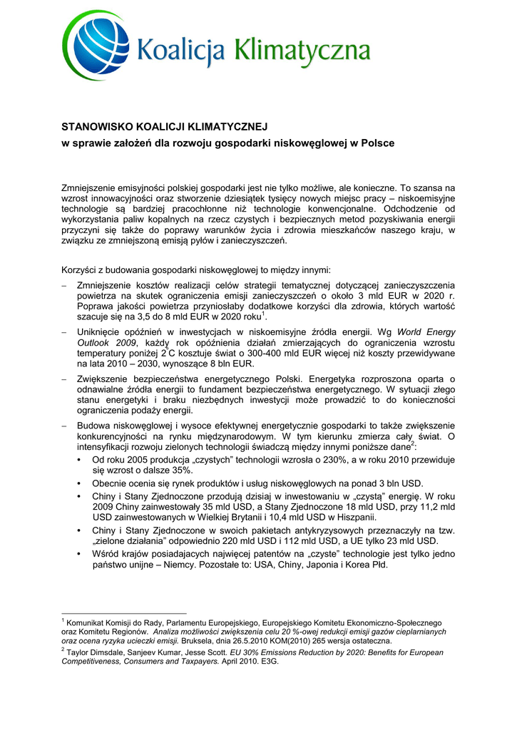 STANOWISKO KOALICJI KLIMATYCZNEJ w sprawie założeń dla rozwoju gospodarki niskowęglowej w Polsce Zmniejszenie emisyjności polskiej gospodarki jest nie tylko możliwe, ale konieczne. To szansa na wzrost innowacyjności oraz stworzenie dziesiątek tysięcy nowych miejsc pracy – niskoemisyjne technologie są bardziej pracochłonne niż technologie konwencjonalne. Odchodzenie od wykorzystania paliw kopalnych na rzecz czystych i bezpiecznych metod pozyskiwania energii przyczyni się także do poprawy warunków życia i zdrowia mieszkańców naszego kraju, w związku ze zmniejszoną emisją pyłów i zanieczyszczeń. Korzyści z budowania gospodarki niskowęglowej to między innymi: Zmniejszenie kosztów realizacji celów strategii tematycznej dotyczącej zanieczyszczenia powietrza na skutek ograniczenia emisji zanieczyszczeń o około 3 mld EUR w 2020 r. Poprawa jakości powietrza przyniosłaby dodatkowe korzyści dla zdrowia, których wartość szacuje się na 3,5 do 8 mld EUR w 2020 roku1. Uniknięcie opóźnień w inwestycjach w niskoemisyjne źródła energii. Wg World Energy Outlook 2009, każdy rok opóźnienia działań zmierzających do ograniczenia wzrostu temperatury poniżej 2ºC kosztuje świat o 300-400 mld EUR więcej niż koszty przewidywane na lata 2010 – 2030, wynoszące 8 bln EUR. Zwiększenie bezpieczeństwa energetycznego Polski. Energetyka rozproszona oparta o odnawialne źródła energii to fundament bezpieczeństwa energetycznego. W sytuacji złego stanu energetyki i braku niezbędnych inwestycji może prowadzić to do konieczności ograniczenia podaży energii. Budowa niskowęglowej i wysoce efektywnej energetycznie gospodarki to także zwiększenie konkurencyjności na rynku międzynarodowym. W tym kierunku zmierza cały świat. O intensyfikacji rozwoju zielonych technologii świadczą między innymi poniższe dane2: • Od roku 2005 produkcja „czystych” technologii wzrosła o 230%, a w roku 2010 przewiduje się wzrost o dalsze 35%. • Obecnie ocenia się rynek produktów i usług niskowęglowych na ponad 3 bln USD. • Chiny i Stany Zjednoczone przodują dzisiaj w inwestowaniu w „czystą” energię. W roku 2009 Chiny zainwestowały 35 mld USD, a Stany Zjednoczone 18 mld USD, przy 11,2 mld USD zainwestowanych w Wielkiej Brytanii i 10,4 mld USD w Hiszpanii. • Chiny i Stany Zjednoczone w swoich pakietach antykryzysowych przeznaczyły na tzw. „zielone działania” odpowiednio 220 mld USD i 112 mld USD, a UE tylko 23 mld USD. • Wśród krajów posiadajacych najwięcej patentów na „czyste” technologie jest tylko jedno państwo unijne – Niemcy. Pozostałe to: USA, Chiny, Japonia i Korea Płd. 1 Komunikat Komisji do Rady, Parlamentu Europejskiego, Europejskiego Komitetu Ekonomiczno-Społecznego oraz Komitetu Regionów. Analiza możliwości zwiększenia celu 20 %-owej redukcji emisji gazów cieplarnianych oraz ocena ryzyka ucieczki emisji. Bruksela, dnia 26.5.2010 KOM(2010) 265 wersja ostateczna. 2 Taylor Dimsdale, Sanjeev Kumar, Jesse Scott. EU 30% Emissions Reduction by 2020: Benefits for European Competitiveness, Consumers and Taxpayers. April 2010. E3G. Jednocześnie Polska, jako strona międzynarodowych porozumień mających zapobiegać zmianom klimatu (Ramowej Konwencji Narodów Zjednoczonych oraz Protokołu z Kioto), zobowiązała się do podjęcia ambitnych działań na rzecz redukcji emisji gazów cieplarnianych (GHG) i budowania gospodarki niskowęglowej. W 2003 roku rząd polski przyjął dokument Polityka Klimatyczna Polski. Strategie redukcji emisji gazów cieplarnianych do roku 2020, który zakłada redukcję 40% emisji gazów cieplarnianych do 2020 roku. Przyjęliśmy też unijny Pakiet klimatyczno-energetyczny, zgodnie z którym Unia ma zredukować emisje gazów cieplarnianych o 20% do roku 2020. Dla Polski ten cel przekłada się na + 14% w non-ETS, a w ETS - 21% w stosunku do roku 2005. Cel unijny może wkrótce zostać podniesiony do 30%. Konieczne jest, aby nasz kraj podjął zdecydowane działania zmierzające do wypełnienia obecnych zobowiązań i przygotował się na kolejne wyzwania w tym obszarze. Organizacje należące do Koalicji Klimatycznej uważają, że aby zapewnić lepsze warunki życia oraz bezpieczny byt następnym pokoleniom, należy zbudować w Polsce nowoczesną, niskoemisyjną gospodarkę efektywnie wykorzystującą zasoby, opartą na technologiach bezpiecznych dla środowiska i zapewniającą wielokierunkowy rozwój gospodarki. Gospodarka niskowęglowa powinna opierać się na rozwiązaniach typu „każdy wygrywa" („win-win”), przynoszących korzyści ekonomiczne, społeczne oraz w zakresie ochrony środowiska. Konieczne jest też zapewnienie efektywności kosztowej – określanie i wdrażanie rozwiązań zgodnie z zasadą jak najniższych kosztów, a największych efektów. Według analiz Instytutu na rzecz Ekorozwoju możliwe jest zmniejszenie w Polsce emisji dwutlenku węgla o 48% do roku 2020 i o 57% do roku 2030 w stosunku do roku 1996. Uważamy, że aby wspomóc realizację celów redukcyjnych niezbędne jest: Określenie dopuszczalnych limitów emisji GHG jako punktu wyjścia do tworzenia narodowych polityk i strategii, w celu zapewnienia spójności polityki gospodarczej z polityką klimatyczną. Ujednolicenie istniejących i opracowywanych dokumentów dotyczących bezpośrednio lub pośrednio celów polityki klimatycznej. Dopracowanie podziałów kompetencyjnych pomiędzy resortami odpowiedzialnymi za działania mające wpływ na wielkość emisji. Zaangażowanie wszystkich możliwych środków finansowych, unijnych (budżet na lata 20132020 i fundusze celowe) oraz krajowych (np. dotacje NFOŚiGW), do pełnego wykorzystania możliwości budowy gospodarki niskoemisyjnej w Polsce. Wspieranie w tym samym celu partnerstw publiczno-prawnych, angażowanie do współpracy banków oraz instytucji finansowych, oraz stworzenie zachęt inwestycyjnych dla kapitału prywatnego. Należy także wykorzysta
