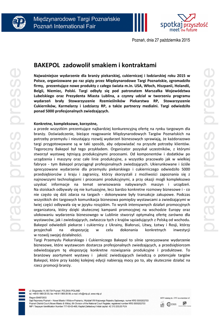 Poznań, dnia 27 października 2015 BAKEPOL zadowolił smakiem i kontraktami Najważniejsze wydarzenie dla branży piekarskiej, cukierniczej i lodziarskiej roku 2015 w Polsce, organizowane po raz piąty przez Międzynarodowe Targi Poznańskie, zgromadziło firmy, prezentujące nowe produkty z całego świata m.in. USA, Włoch, Hiszpanii, Holandii, Belgii, Niemiec, Polski. Targi odbyły się pod patronatem Marszałka Województwa Lubelskiego oraz Prezydenta Miasta Lublina, a czynny udział w tworzeniu programu wydarzeń brały Stowarzyszenie Rzemieślników Piekarstwa RP, Stowarzyszenie Cukierników, Karmelarzy i Lodziarzy RP, a także partnerzy medialni. Targi odwiedziło ponad 5000 profesjonalnych zwiedzających. Konkretne, kompleksowe, korzystne, a przede wszystkim prezentujące najbardziej konkurencyjną ofertę na rynku targowym dla branży. Doświadczenie, bieżące reagowanie Międzynarodowych Targów Poznańskich na potrzeby przemysłu i nieustający rozwój wydarzeń biznesowych sprawiają, że każdorazowo targi przygotowywane są w taki sposób, aby odpowiadać na przyszłe potrzeby klientów. Tegoroczny Bakepol był tego przykładem. Organizator pozyskał uczestników, z którymi stworzył wystawę tętniącą produkcyjnymi procesami. Od komponentów i dodatków po urządzenia i maszyny oraz całe linie produkcyjne, a wszystko pracowało jak w wielkiej fabryce - tym Bakepol przyciągnął profesjonalnych zwiedzających. Ukierunkowane i ściśle sprecyzowane wydarzenie dla przemysłu piekarskiego i cukierniczego odwiedziło 5000 przedsiębiorców z kraju i zagranicy, którzy skorzystali z możliwości zapoznania się z najnowszymi technologiami i procesami produkcyjnymi, a przy okazji mogli kompleksowo uzyskać informacje na temat serwisowania nabywanych maszyn i urządzeń. Na stoiskach odbywały się nie kurtuazyjne, lecz bardzo konkretne rozmowy biznesowe i - co nie często się dziś zdarza na targach - dokonywane były transakcje zakupowe. Podczas wszystkich dni targowych komunikacja biznesowa pomiędzy wystawcami a zwiedzającymi w lwiej części odbywała się w języku rosyjskim. To wynik intensywnych działań promocyjnych organizatora, który dzięki skutecznej kampanii promocyjnej na wschodzie Europy oraz ulokowaniu wydarzenia biznesowego w Lublinie stworzył optymalną ofertę zarówno dla wystawców, jak i zwiedzających, zwłaszcza tych z krajów sąsiadujących z Polską od wschodu. Bakepol odwiedzili piekarze i cukiernicy z Ukrainy, Białorusi, Litwy, Łotwy i Rosji, którzy przyjechali na ekspozycję w celu dokonania konkretnych inwestycji w rozwój swojej działalności. Targi Przemysłu Piekarskiego i Cukierniczego Bakepol to silnie sprecyzowane wydarzenie biznesowe, które wystawcom dostarcza profesjonalnych zwiedzających, a przedsiębiorcom odwiedzającym tę ekspozycję konkretne rozwiązania produkcyjne i produktowe. To branżowy asortyment wystawy i jakość zwiedzających świadczą o potencjale targów Bakepol, które przy każdej kolejnej edycji nabierają mocy po to, aby skutecznie działać na rzecz promocji branży. Zapach świeżo pieczonego chleba, dolce vita i smak lodów Bakepol to targi, które pachną dopiero co wypiekanym pieczywem, smakują czekoladą i apetycznymi ciastkami, a także przyciągają lodowymi wariacjami na temat nowych trendów w produkcji tych zimnych, ale gorąco oczekiwanych przez konsumentów letnich słodkości. Cała ekspozycja tętniła życiem produkcyjnym i epatowała aromatami, które wskazywały piekarzom i cukiernikom, w którym kierunku podążają gusta klientów. Piąta edycja targów Bakepol odbywała się pod hasłem „Nowoczesne technologie w służbie smaku!”, bowiem to smak produktów spożywczych oferowanych w piekarniach, cukierniach i lodziarniach jest tym argumentem, który przyciąga konsumentów. Innowacyjne rozwiązania w procesach produkcyjnych dziś dedykowane są uzyskaniu najbardziej naturalnych i tradycyjnych produktów, ponieważ w najbliższej perspektywie czasowej klienci będą oczekiwali żywności zdrowej i o wysokiej jakości. W tym roku na targach w Lublinie odbyła się konferencja pt. „Perspektywy dla branży piekarskiej- kumulacja szans i możliwości!”. To merytoryczne wydarzenie przyciągnęło ludzi z branży i było pierwszym, na którym było można pozyskać wiedzę na temat wchodzących w życie nowych możliwości promocji produktów piekarskich. Bakepol był też źródłem inspiracji i nowoczesną szkołą rzemieślniczych umiejętności. Przez cztery dni targów w specjalnie przygotowanej strefie pokazowej Forum Piekarskie - Zdrowe Pieczywo wypiekane były chleby, bułki, plecionki piekarskie, które dzięki użyciu najwyższej jakości mąk, zbóż i ziołowych dodatków mają prozdrowotny wpływ na organizm. To tutaj uczniowie z łącznie 14 szkół zawodowych mogli sprawdzić swoje umiejętności oraz skorzystać z praktycznej lekcji pod okiem rzemieślników. Z kolei na Forum Cukierniczym odbywał się cykl pokazów „Ten ważny dzień… Na słodko!”, a w ramach serii prezentacji znakomici cukiernicy komponowali torty od chrzestnych po ślubne i dowodzili tym samym o wyjątkowości zawodu cukiernika, który towarzyszy konsumentom w najważniejszych momentach ich życia. Wielu gości pomieściła Strefa Mistrza – Manufaktura Smaku i Chleba. A tam chleby z szynką w środku, zapach ziół, aromatyczne finger food, sztuka pieczenia i serwowania chleba gastronomicznego, mąka graham, czyli złoto piekarzy. Manufakturę Smaku i Chleba na targach Bakepol otwierał pokaz pt. „Zioła i infuzje. Zasady tworzenia, metody i połączenia aromatów.”, ale to była dyfuzja inspiracji, innowacji, wiedzy i praktycznych rozwiązań dla piekarzy, cukierników i wszystkich, którzy zawodowo związani są z wypiekami. Na targach odbyły się także szkolenia marketingowe pt. „Piekarz i cukiernik świadomy marketingowiec”. Podczas wykładów uczestnicy zyskali praktyc