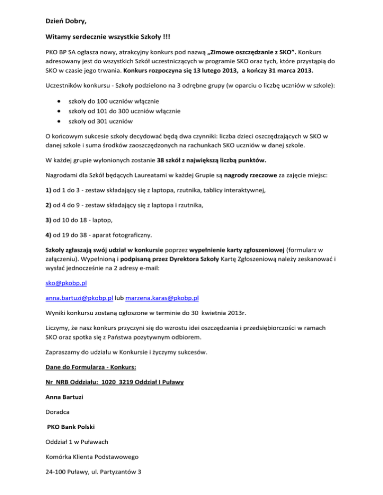 Dzień Dobry, Witamy serdecznie wszystkie Szkoły !!! PKO BP SA ogłasza nowy, atrakcyjny konkurs pod nazwą „Zimowe oszczędzanie z SKO”. Konkurs adresowany jest do wszystkich Szkół uczestniczących w programie SKO oraz tych, które przystąpią do SKO w czasie jego trwania. Konkurs rozpoczyna się 13 lutego 2013, a kończy 31 marca 2013. Uczestników konkursu - Szkoły podzielono na 3 odrębne grupy (w oparciu o liczbę uczniów w szkole): szkoły do 100 uczniów włącznie szkoły od 101 do 300 uczniów włącznie szkoły od 301 uczniów O końcowym sukcesie szkoły decydować będą dwa czynniki: liczba dzieci oszczędzających w SKO w danej szkole i suma środków zaoszczędzonych na rachunkach SKO uczniów w danej szkole. W każdej grupie wyłonionych zostanie 38 szkół z największą liczbą punktów. Nagrodami dla Szkół będących Laureatami w każdej Grupie są nagrody rzeczowe za zajęcie miejsc: 1) od 1 do 3 - zestaw składający się z laptopa, rzutnika, tablicy interaktywnej, 2) od 4 do 9 - zestaw składający się z laptopa i rzutnika, 3) od 10 do 18 - laptop, 4) od 19 do 38 - aparat fotograficzny. Szkoły zgłaszają swój udział w konkursie poprzez wypełnienie karty zgłoszeniowej (formularz w załączeniu). Wypełnioną i podpisaną przez Dyrektora Szkoły Kartę Zgłoszeniową należy zeskanować i wysłać jednocześnie na 2 adresy e-mail: [email protected] [email protected] lub [email protected] Wyniki konkursu zostaną ogłoszone w terminie do 30 kwietnia 2013r. Liczymy, że nasz konkurs przyczyni się do wzrostu idei oszczędzania i przedsiębiorczości w ramach SKO oraz spotka się z Państwa pozytywnym odbiorem. Zapraszamy do udziału w Konkursie i życzymy sukcesów. Dane do Formularza - Konkurs: Nr NRB Oddziału: 1020 3219 Oddział I Puławy Anna Bartuzi Doradca PKO Bank Polski Oddział 1 w Puławach Komórka Klienta Podstawowego 24-100 Puławy, ul. Partyzantów 3