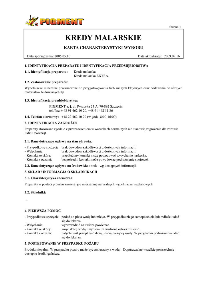Strona 1 KREDY MALARSKIE KARTA CHARAKTERYSTYKI WYROBU Data sporządzenia: 2005.05.10 Data aktualizacji: 2009.09.16 1. IDENTYFIKACJA PREPARATU I IDENTYFIKACJA PRZEDSIĘBIORSTWA 1.1. Identyfikacja preparatu: Kreda malarska. Kreda malarska EXTRA. 1.2. Zastosowanie preparatu: Wypełniacze mineralne przeznaczone do przygotowywania farb suchych klejowych oraz dodawania do róŜnych materiałów budowlanych itp 1.3. Identyfikacja przedsiębiorstwa: PIGMENT s. j. ul. Pyrzycka 23 A, 70-892 Szczecin tel./fax: + 48 91 462 10 20, +48 91 462 11 86 1.4. Telefon alarmowy: +48 22 462 10 20 (w godz. 8:00-16:00) 2. IDENTYFIKACJA ZAGROśEŃ Preparaty stosowane zgodnie z przeznaczeniem w warunkach normalnych nie stanowią zagroŜenia dla zdrowia ludzi i zwierząt. 2.1. Dane dotyczące wpływu na stan zdrowia: - Przypadkowe spoŜycie: - Wdychanie: - Kontakt ze skórą: - Kontakt z oczami: brak dowodów szkodliwości z dostępnych informacji. brak dowodów szkodliwości z dostępnych informacji. przedłuŜony kontakt moŜe powodować wysychanie naskórka. bezpośredni kontakt moŜe powodować podraŜnienie spojówek. 2.2. Dane dotyczące wpływu na środowisko: brak - wg dostępnych informacji. 3. SKŁAD / INFORMACJA O SKŁADNIKACH 3.1. Charakterystyka chemiczna: Preparaty w postaci proszku zawierające mieszaninę naturalnych wypełniaczy węglanowych. 3.2. Składniki: 4. PIERWSZA POMOC - Przypadkowe spoŜycie: podać do picia wodę lub mleko. W przypadku złego samopoczucia lub mdłości udać się do lekarza. - Wdychanie: wyprowadzić na świeŜe powietrze. - Kontakt ze skórą: zmyć skórę wodą i mydłem, zabrudzoną odzieŜ zmienić. - Kontakt z oczami: natychmiast przepłukać duŜą ilością bieŜącej wody. W przypadku podraŜnienia udać się do lekarza. 5. POSTĘPOWANIE W PRZYPADKU POśARU Produkt niepalny. W przypadku poŜaru moŜe być zmieszany z wodą. Dopuszczalne wszelkie powszechnie dostępne środki gaśnicze. PIGMENT KREDY MALARSKIE Strona 2 6. POSTĘPOWANIE W PRZYPADKU NIEZAMIERZONEGO UWOLNIENIA DO ŚRODOWISKA W przypadku rozsypania lub rozlania wyrobu (rozrobionego z wodą), zebrać do odpowiednich pojemników. Pozostałe, nie dające się zebrać resztki zmyć wodą z zanieczyszczonych powierzchni. Nie są wymagane specjalne środki ochrony osobistej. 7. POSTĘPOWANIE Z PREPARATEM I JEGO MAGAZYNOWANIE 7.1. Postępowanie z preparatem: Przy mieszaniu sypkiego produktu z wodą stosować maski przeciwpyłowe. Unikać bezpośredniego kontaktu ze skórą, błonami śluzowymi i odzieŜą. Po zakończeniu prac dokładnie zmyć zabrudzenia skóry wodą i mydłem. 7.2. Magazynowanie: Przechowywać w szczelnie zamkniętych opakowaniach, w suchym i chłodnym miejscu. 7.3. Specyficzne zastosowania: nie dotyczy. 8. KONTROLA NARAśENIA I ŚRODKI OCHRONY INDYWIDUALNEJ 8.1. Wartości graniczne naraŜenia: Składniki podlegające kontroli na stanowiskach pracy: węglan wapnia - pyły [471-34-1] - NDS: 10 mg / m3. 8.2. Kontrola naraŜenia: 8.2.1. Kontrola naraŜenia w miejscu pracy: W czasie prac zapewnić odpowiednią wentylację. a) Ochrona dróg oddechowych: maski przeciwpyłowe. b) Ochrona rąk: rękawice robocze. c) Ochrona oczu: okulary ochronne. d) Ochrona skóry: kombinezon roboczy lub fartuch, nakrycie głowy. 8.2.2. Kontrola naraŜenia środowiska: brak danych. 9. WŁAŚCIWOŚCI FIZYKOCHEMICZNE 9.1. Informacje ogólne: - Postać: - Zapach: biały lub białoszary proszek bezwonny 9.2. WaŜne informacje dotyczące zdrowia, bezpieczeństwa i środowiska: - Wartość pH: - Temperatura wrzenia: - Temperatura zapłonu: - Palność: - Właściwości wybuchowe: - Właściwości utleniające: - PręŜność par: - Gęstość względna: - Rozpuszczalność w wodzie: - Współczynnik podziału n-oktanol/woda: - Lepkość: - Gęstość par: - Szybkość parowania: 9.3. Inne informacje: - 8.5÷9.5 nie dotyczy nie dotyczy niepalny nie dotyczy nie dotyczy nie dotyczy ok. 2,8 g/cm3 nieznaczna - PIGMENT KREDY MALARSKIE Strona 3 10. STABILNOŚĆ I REAKTYWNOŚĆ Produkt stabilny, uŜywany w warunkach zgodnych z instrukcją stosowania nie ulega rozkładowi. Nie są znane niebezpieczne produkty rozkładu. 10.1. Warunki, których naleŜy uniikać: Brak danych. 10.2. Czynniki, których naleŜy unikać: W reakcji z kwasami wydziela CO2. 10.3. Niebezpieczne produkty rozkładu: Nie są znane niebezpieczne produkty rozkładu. 11. INFORMACJE TOKSYKOLOGICZNE Nie są znane dane dotyczące szkodliwego wpływu wyrobu na zdrowie człowieka. Ze względu na lekko alkaliczny charakter preparatu, długotrwały kontakt ze skórą moŜe u osób wraŜliwych wywołać podraŜnienie naskórka, objawiające się zaczerwienieniem. 12. INFORMACJE EKOLOGICZNE Nie dopuszczać do przedostawania się wyrobu do ścieków i wód gruntowych. Brak danych na temat wpływu na środowisko naturalne. Brak danych na temat ulegania biodegradacji wyrobu. 12.1.Ekotoksyczność: 12.2. Mobilność: 12.3. Trwałość i zdolność do rozkładu: 12.4. Zdolność do biokumulacji: 12.5. Wyniki oceny właściwości PBT: 12.6. Inne szkodliwe skutki działania: - 13. POSTĘPOWANIE Z ODPADAMI Klasyfikacja odpadów wg Rozp. Min. Środowiska z dn. 27 września 2001 r. ( Dz. U. Nr 112, poz. 1206): niewielkie ilości, kod - 20 01 28, większe ilości, kod - 08 01 10. Zgodnie z rozp. odpady wyrobu nie są odpadami niebezpiecznymi. Usuwanie i neutralizacja odpadów powinny odbywać się zgodnie z lokalnymi przepisami obowiązującymi na danym obszarze. ZuŜyte opakowania: kategoria odpadów - Q5, kod - 15 01 01. Proces unieszkodliwiania odpadów preparatu i opakowań: D5 - składowanie na składowiskach odpadów lub D10 - termiczne przekształcanie w instalacjach (spalanie). 14. INFORMACJA O TRANSPORCIE Produkt nie jest ładunkiem niebezpiecznym wg: -transport lądowy ADR, GGVS, RID, GGVE -transport wodny śródląd. ADNR -transport morski IMDG, GGVSee, EmS -transport lotniczy ICAO, IATA 15. INFORMACJE DOTYCZĄCE PRZEPISÓW PRAWNYCH -Zgodnie z Rozp. Min. Zdrowia z dn. 