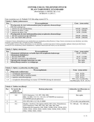 CENNIK USŁUG TELEFONICZNYCH PLAN TARYFOWY STANDARD obowiązujący w ERTEL Sp. z o.o. od dnia 01.11.2011 r. Ceny wyrażone są w zł. Podatek VAT dla usług wynosi 23 %. Tabela 1. Opłaty jednorazowe Poz Wyszczególnienie Przyłączenie do sieci telekomunikacyjnej urządzenia abonenckiego: 1 Dla linii analogowej 1.1 - umowa na czas nieokreślony 1.2 - umowa na okres 1 roku 1.3 - umowa na okres 2 lat 2 Przyłączenie do sieci telekomunikacyjnej urządzenia abonenckiego: 2.1 - dla linii systemowej dgt millenium 2.2 - dla linii ISDN BRI (2B+D) Cena (cena netto) 369,00 (300,00) 61,50 (50,00) 36,90 (30,00) 369,00 (300,00) 369,00 (300,00) 1. Zawarcie Umowy abonenckiej na czas nieokreślony jest standardową ofertą Dostawcy Usług. Umowa zawierana na czas określony jest ofertą związaną z przyznaniem ulg w stosunku do oferty standardowej. 2. W przypadku zawarcia Umowy abonenckiej na czas określony wysokość ulg stanowi różnicę pomiędzy opłatami właściwymi dla Umowy zawartej na czas nieokreślony (oferta standardowa), a opłatami właściwymi dla Umowy na czas określony. Tabela 2. Opłaty miesięczne Poz Wyszczególnienie 1 Abonament telefoniczny za każde łącze do urządzenia końcowego 2 Abonament dodatkowy: 2.1 - dla linii ISDN BRI 2.2 - dla linii systemowej dgt millenium 3 Ograniczenie dostępu ustawiane na stałe 4 Identyfikacja numeru wywołującego Tabela 3. Opłaty za jednostkę taryfikacyjną Poz Wyszczególnienie 1 Połączenia realizowane: 1.1 - z urządzenia abonenckiego 1.2 - z linii ISDN BRI w każdym kanale 1.3 - z aparatu samoinkasującego 1.4 - z urządzenia abonenckiego na numer 327396500 (dostęp do internetu) Cena (cena netto) 36,90 (30,00) 18,45 (15,00) 65,19 (53,00) Bez opłat Bez opłat Cena (cena netto) 0,36 (0,29) 0,36 (0,29) 0,50 (0,41) 50% ceny za jednostkę taryfikacyjną =0,18 (0,15) Tabela 4. Tablica taryfikacji Poz Nr taryfy dla połączeń automatycznych Rodzaj połączenia Jednostka taryfikacyjna za okres 1 00 AUS Alarmowe: 112, 997, 998, 999; 800; 116 000; 116 111; 116 123; 327396999 (nr testowy); 327396000 (poczta głosowa) 2 01 CD i IFS; 801 (1,2,7,8), 0~0800 1 JT za cały czas połączenia 3 02 lokalne i strefowe; 64 (oprócz 6422); 801 (3,9), 27(strefowe); AUS Alarmowe: 994, 993, 992, 991, 986, 985, 984; Połączenia do numerów ASI: 9280, 19280, 9330, 19330, 9331, 19331, 9332, 19332, 9393, 19393, 9394, 19394, 9395, 19395, 9502, 19502, 9503, 19503 T1: 180 sek. T2: 360 sek. Bez opłat 1/3 4 03 700 1, 701 1, 703 1, 801 (5,6,0), 804 1, 804 2; 20(7,8) 1 60 sek. 5 04 Międzystrefowe: KNA, 1033+AB, 20(2,9) 6 05 Połączenia do numerów ASI: 9221, 19221, 9225, 19225, 9226, 19226, 9227, 19227, 9228, 19228, 9229, 19229, 9310, 19310, 9311, 19311, 9423, 19423, 9570, 19570, 118112, 118800; 801 4, 701 2, 701 9 7 06 Usługi numerów 700 2, 703 2, 20(7,8) 2, 16,60 sek. 8 07 Usługi numerów 700 5, 701 5, 703 5, 20(7,8) 5 5,80 sek. 9 08 Usługi numerów 6422, 700 7, 701 7, 703 7, 20(7,8) 7 4,36 sek. T3: 58,00 sek. T4: 58,00 sek. T5: 116,00 sek. 30 sek. Do sieci komórkowych: 10 09 T-Mobile, Orange, Plus T3: 42,44 sek. T6: 42,44 sek. T8:42,44 sek. Polsat Cyfrowy T3: 32,83 sek. T6: 32,83 sek. T8: 32,83 sek. Play T3: 30,53 sek T6: 30,53 sek. T8: 30,53 sek. Centernet, Mobyland T3: 21,48 sek. T6: 21,48 sek. T8: 21,48 sek. 11 10 Międzynarodowe - 1 strefa taryfowa 29,00 sek 12 11 Międzynarodowe - 2 strefa taryfowa 12,50 sek. 13 12 Międzynarodowe - 3 strefa taryfowa 11,20 sek 14 13 Międzynarodowe - 4 strefa taryfowa: 700 3, 701 3 703 3, 20(7,8) 3, 9491, 19491, 9493, 19493, 118888 10,30 sek. 15 14 Międzynarodowe - 5 strefa taryfowa 9,32 sek. 16 15 Międzynarodowe - 6 strefa taryfowa, 118000, 118712, 118912, 118811 8,70 sek. 17 16 Międzynarodowe - 7 strefa taryfowa 700 4, 701 4 , 703 4, 20(7,8) 4 8,30 sek. 18 17 Międzynarodowe - 8 strefa taryfowa 700 6, 701 6, 703 6, 20(7,8) 6 5,04 sek. 19 18 Międzynarodowe - 9 strefa taryfowa 700 8, 701 8, 703 8, 20(7,8) 8 2,80 sek. 20 19 Strefowe, 20(2,9) 21 20 704 0 22 21 704 1, biuro numerów TP S.A. Nr 118913 23 24 704 2 7 JT za połączenie 24 26 704 3 11 JT za połączenie 25 28 704 4 14 JT za połączenie 26 30 704 5 18 JT za połączenie 27 31 700 9, 20(7,8) 9, 703 9, 704 6 28 JT za połączenie 28 32 704 7 35 JT za połączenie 29 33 704 8 69 JT za połączenie 30 34 704 9 98 JT za połączenie T3:180 sek. T7: 360 sek. 2 JT za połączenie 4 JT za cały czas połączenia 2/3 Tabela 5. Okresy taryfikacyjne Okres taryfikacyjny T1 T2 T3 T4 T5 T6 T7 T8 Godziny [od – do] 08.00 – 18.00 18.00 – 08.00 08.00 – 18.00 08.00 – 18.00 18.00 – 08.00 08.00 – 22.00 18.00 – 22.00 18.00 – 08.00 Cała doba 22.00 – 08.00 Dni Wszystkie dni tygodnia Wszystkie dni tygodnia Dni robocze Soboty, niedziele i święta Wszystkie dni tygodnia Soboty, niedziele i święta Dni robocze Dni robocze Soboty, niedziele i święta Wszystkie dni tygodnia WN-T, UM-T 3/3