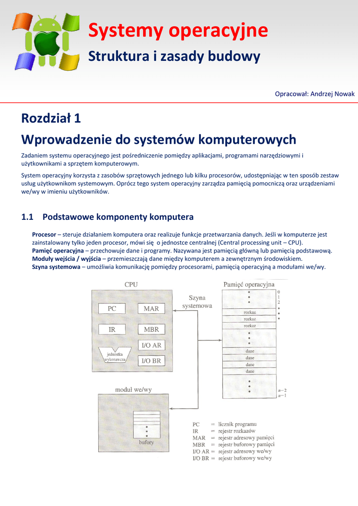 Systemy operacyjne Struktura i zasady budowy Opracował: Andrzej Nowak Rozdział 1 Wprowadzenie do systemów komputerowych Zadaniem systemu operacyjnego jest pośredniczenie pomiędzy aplikacjami, programami narzędziowymi i użytkownikami a sprzętem komputerowym. System operacyjny korzysta z zasobów sprzętowych jednego lub kilku procesorów, udostępniając w ten sposób zestaw usług użytkownikom systemowym. Oprócz tego system operacyjny zarządza pamięcią pomocniczą oraz urządzeniami we/wy w imieniu użytkowników. 1.1 Podstawowe komponenty komputera Procesor – steruje działaniem komputera oraz realizuje funkcje przetwarzania danych. Jeśli w komputerze jest zainstalowany tylko jeden procesor, mówi się o jednostce centralnej (Central processing unit – CPU). Pamięć operacyjna – przechowuje dane i programy. Nazywana jest pamięcią główną lub pamięcią podstawową. Moduły wejścia / wyjścia – przemieszczają dane między komputerem a zewnętrznym środowiskiem. Szyna systemowa – umożliwia komunikację pomiędzy procesorami, pamięcią operacyjną a modułami we/wy. 1.2 Rejestry procesora W procesorach znajdują się rejestry udostępniające szybszą pamięć o mniejszej pojemności w porównaniu z pamięcią operacyjną . Rejestry w procesorze wykonują dwa zadania: 1. Rejestry widoczne dla użytkownika – ułatwiają projektantom oraz programistom korzystającym z języka asemblerowego minimalizowanie odwołań do pamięci poprzez zoptymalizowanie wykorzystania rejestru. Procesor może odwoływać się do rejestru widocznego dla użytkownika za pomocą języka komputerowego, który procesor wykonuje. Taki rejestr jest ogólnie dostępny dla wszystkich programów, włączając w to aplikacje i programy systemowe. Najczęściej dostępnymi rodzajami rejestrów są: a. Rejestry danych – są to rejestry ogólnego przeznaczenia, co oznacza, że może z nich korzystać dowolna instrukcja przetwarzająca dane. Jednakże, często ich zastosowanie wiąże się z pewnymi ograniczeniami. b. Rejestry adresowe – zawierają adresy danych lub rozkazów w pamięci operacyjnej lub fragment adresu używanego do obliczenia adresu całkowitego lub efektywnego. c. Wskaźnik segmentu – pamięć jest dzielona na segmenty, które są po prostu blokami słów o zmiennej długości. Odwołanie do pamięci składa się z odwołania do określonego segmentu oraz przesunięcia wewnątrz tego segmentu. d. Wskaźnik stosu – jeśli mamy do czynienia z adresowaniem stosu widocznym dla użytkownika, to tworzony jest dedykowany rejestr wskazujący lokalizację na szczycie stosu. Dzięki temu można stosować rozkazy nie zawierające pól adresowych, takie jak push i pop. 2. Rejestry sterowania i stanu- wykorzystywane przez procesor w celu sterowania działaniem procesora oraz sterowania wykorzystania programów za pomocą uprzywilejowanych procedur systemu operacyjnego. Do kontrolowania działania procesorów służy wiele różnych rejestrów procesora. W większości komputerów rejestry procesora nie są widoczne dla użytkownika. Do niektórych dostęp mogą mieć instrukcje komputera – tryb sterowania lub tryb systemu operacyjnego. Rejestry niezbędne podczas wykonywania rozkazów: a. Licznik programu (PC) – zawiera adres kolejnego rozkazu do pobrania. b. Rejestr rozkazów (IR) – zawiera ostatnio pobrany rozkaz. Inne rejestry: MAR – rejestr adresowy pamięci, MBR – rejestr buforowy pamięci, AC - akumulator Kody warunków (flagi) – są zazwyczaj bitami ustawianymi przez osprzęt procesora w rezultacie wykonywania zadań. Przykładowo, działanie arytmetyczne może dać wynik dodatni, ujemny, zerowy lub doprowadzić do przepełnienia. Oprócz przechowywania wyniku w rejestrze lub w pamięci, kod warunku jest również ustawiany po zakończeniu działania arytmetycznego. Bity kodu warunków są przechowywane w jednym lub kilku rejestrach. Zazwyczaj tworzą część rejestru sterującego. Instrukcje komputera umożliwiają odczytywanie tych bitów za pomocą ukrytych odwołań. 1.3 Wykonywanie rozkazów Program , który ma być wykonany przez procesor, składa się z zestawu rozkazów zapisanych w pamięci. Przetwarzanie rozkazów obejmuje dwa etapy: a. Etap pobrania - procesor pobiera po jednym rozkazie z pamięci, b. Etap wykonania - wykonanie rozkazu pobranego przez procesor . Wykonywanie programu sprowadza się do powtarzania sekwencji – pobierania rozkazów i ich wykonywania. Wykonywanie rozkazów może się wiązać z kilkoma czynnościami i jest zależne od rodzaju rozkazu. Cykl rozkazu - wszystkie operacje związane z przetwarzaniem jednego rozkazu. Wstrzymanie wykonania programu – może nastąpić , jeśli : a. Wyłączymy komputer. b. Pojawią się jakieś poważne błędy. c. Zostanie wysłany rozkaz wstrzymujący pracę procesora. 1. Pobieranie i wykonywanie rozkazu W początkowej fazie każdego cyklu procesor pobiera jeden rozkaz z pamięci. W typowym procesorze licznik programu (PC) przechowuje adres kolejnego rozkazu, który ma zostać pobrany. O ile nie ma innych dyrektyw, procesor zawsze zwiększa wartość licznika po każdej operacji pobrania (chodzi o to, aby można było pobrać kolejny rozkaz zlokalizowany nieco wyżej w pamięci). Pobrany rozkaz ładowany jest do rejestru rozkazu (IR). W rozkazie zawarte są bity określające operację, którą procesor ma wykonać. Procesor interpretuje rozkaz i wykonuje żądaną operację. Rodzaje operacji: a. Procesor–pamięć – dane można przenosić z procesora do pamięci lub z pamięci do procesora. b. Procesor-we/wy – dane mogą być przenoszone pomiędzy procesorem a modułem we/wy (czyli do lub z urządzenia peryferyjnego). c. Przetwarzanie danych – procesor może realizować na danych działania arytmetyczne lub logiczne. d. Sterowanie – rozkaz może zawierać dyrektywę określającą zmianę kolejności wykonania rozkazu. Wykonanie rozkazu może obejmować połączenie kilku z wymi