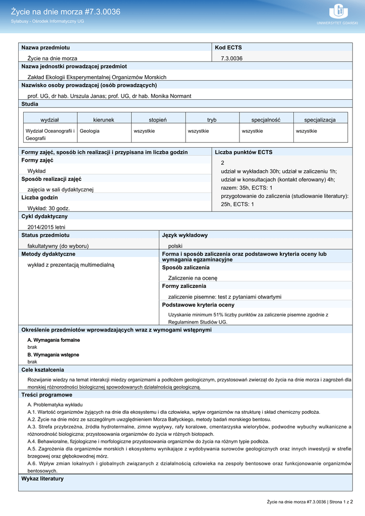 Życie na dnie morza #7.3.0036 Sylabusy - Ośrodek Informatyczny UG Nazwa przedmiotu Kod ECTS Życie na dnie morza Nazwa jednostki prowadzącej przedmiot 7.3.0036 Zakład Ekologii Eksperymentalnej Organizmów Morskich Nazwisko osoby prowadzącej (osób prowadzących) prof. UG, dr hab. Urszula Janas; prof. UG, dr hab. Monika Normant Studia wydział Wydział Oceanografii i Geografii kierunek Geologia stopień tryb wszystkie wszystkie Formy zajęć, sposób ich realizacji i przypisana im liczba godzin Formy zajęć wszystkie zajęcia w sali dydaktycznej Liczba godzin Wykład: 30 godz. Cykl dydaktyczny fakultatywny (do wyboru) Metody dydaktyczne wykład z prezentacją multimedialną specjalizacja wszystkie Liczba punktów ECTS Wykład Sposób realizacji zajęć 2014/2015 letni Status przedmiotu specjalność 2 udział w wykładach 30h; udział w zaliczeniu 1h; udział w konsultacjach (kontakt oferowany) 4h; razem: 35h, ECTS: 1 przygotowanie do zaliczenia (studiowanie literatury): 25h, ECTS: 1 Język wykładowy polski Forma i sposób zaliczenia oraz podstawowe kryteria oceny lub wymagania egzaminacyjne Sposób zaliczenia Zaliczenie na ocenę Formy zaliczenia zaliczenie pisemne: test z pytaniami otwartymi Podstawowe kryteria oceny Uzyskanie minimum 51% liczby punktów za zaliczenie pisemne zgodnie z Regulaminem Studiów UG. Określenie przedmiotów wprowadzających wraz z wymogami wstępnymi A. Wymagania formalne brak B. Wymagania wstępne brak Cele kształcenia Rozwijanie wiedzy na temat interakcji miedzy organizmami a podłożem geologicznym, przystosowań zwierząt do życia na dnie morza i zagrożeń dla morskiej różnorodności biologicznej spowodowanych działalnością geologiczną. Treści programowe A. Problematyka wykładu A.1. Wartość organizmów żyjących na dnie dla ekosystemu i dla człowieka, wpływ organizmów na strukturę i skład chemiczny podłoża. A.2. Życie na dnie mórz ze szczególnym uwzględnieniem Morza Bałtyckiego, metody badań morskiego bentosu. A.3. Strefa przybrzeżna, źródła hydrotermalne, zimne wypływy, rafy koralowe, cmentarzyska wielorybów, podwodne wybuchy wulkaniczne a różnorodność biologiczna; przystosowania organizmów do życia w różnych biotopach. A.4. Behawioralne, fizjologiczne i morfologiczne przystosowania organizmów do życia na różnym typie podłoża. A.5. Zagrożenia dla organizmów morskich i ekosystemu wynikające z wydobywania surowców geologicznych oraz innych inwestycji w strefie brzegowej oraz głębokowodnej mórz. A.6. Wpływ zmian lokalnych i globalnych związanych z działalnością człowieka na zespoły bentosowe oraz funkcjonowanie organizmów bentosowych. Wykaz literatury Życie na dnie morza #7.3.0036 | Strona 1 z 2 Życie na dnie morza #7.3.0036 Sylabusy - Ośrodek Informatyczny UG A. Literatura wymagana do ostatecznego zaliczenia zajęć (zdania egzaminu): A.1. wykorzystywana podczas zajęć Barnes R.S.K., Calow P., Olive P.J.W., Golding D.W., Spicer J.I., 2007. The Invertebrates, A Synthesis. 3rd Edition, Blackwell Publishing Botto F., Iribarne O., 2000. Contrasting Effects of Two Burrowing Crabs (Chasmagnathus granulata and Uca uruguayensis) on sediment composition and transport in estuarine environments, Estuarine, Coastal and Shelf Science 51 Eckman J.E., Nowell A.R.M., Jumars P.A., 1981. Sediment destabilization by animal tubes, Journal of Marine Research 39 (2) Eleftheriou A., Mclntyre A., 2005. Methods for the study of marine benthos, Blackwell Publishing Gaston K.J., Spicer J. I., 2008. Biodiversity: An Introduction. 6th Edition, Blackwell Publishing Gray J. S., Elliott M., 2009. Ecology of Marine Sediments-from science to Management, Oxford Univerity Press Hogarth P.J., 2007. The Biology of Mangroves and Seagrasses. 2nd Edition, Oxford University Press. Holmes G., Ortiz J.-C., Schönberg C.H.L., 2009. Bioerosion rates of the sponge Cliona orientalis Thiele, 1900: spatial variation over short distances, Facies 55 Hutchinson S., Hawkins L.E., 2007. Oceany, Carta Blanca Pusceddu A., Fraschetti S., Mirto S., Holmer M., Danovaro R., 2007. Effects of intensive mariculture on sediment biochemistry, Ecological Applications 17(5) Rabaut M., Vincx M., Degraer S., 2009. Do Lanice conchilega (sandmason) aggregations classify as reefs? Quantifying habitat modifying effects, Helgol. Mar. Res. 63 Willmer, P., Stone, G., Johnston, I., 2000. Environmental Physiology of Animals, Blackwell Science Ltd. A.2. studiowana samodzielnie przez studenta www.helcom.fi Efekty uczenia się Wiedza W_2 K_W19+ rozpoznaje i wyjaśnia najważniejsze zagrożenia dla organizmów żyjących na dnie mórz i oceanów wynikające z antropogenicznego przekształcenia środowiska i ocenia jego skutki (treści programowe: A.1-6) zaliczenie z oceną Umiejętności U_1 K_U21+ potrafi wymienić różne rodzaje działalności geologicznej i ocenić związany z nimi stopień przekształceń środowiska przyrodniczego oraz wpływ na morską różnorodność biologiczną (treści programowe: A.1-6) zaliczenie z oceną Kompetencje społeczne (postawy) Kontakt [email protected] Życie na dnie morza #7.3.0036 | Strona 2 z 2