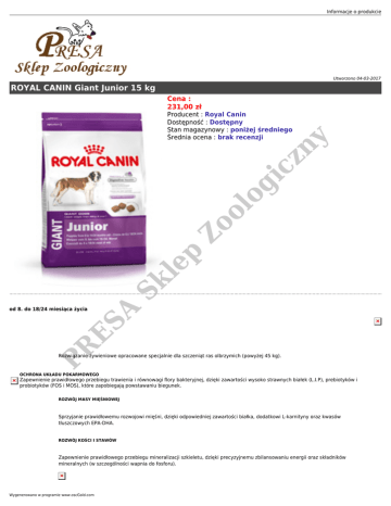 Informacje o produkcie Utworzono 04-03-2017 ROYAL CANIN Giant Junior 15 kg Cena : 231,00 zł Sk le p Zo o lo gi cz ny Producent : Royal Canin Dostępność : Dostępny Stan magazynowy : poniżej średniego Średnia ocena : brak recenzji PR ES A od 8. do 18/24 miesiąca życia Rozwiązanie żywieniowe opracowane specjalnie dla szczeniąt ras olbrzymich (powyżej 45 kg). OCHRONA UKŁADU POKARMOWEGO Zapewnienie prawidłowego przebiegu trawienia i równowagi flory bakteryjnej, dzięki zawartości wysoko strawnych białek (L.I.P), prebiotyków i probiotyków (FOS i MOS), które zapobiegają powstawaniu biegunek. ROZWÓJ MASY MIĘŚNIOWEJ Sprzyjanie prawidłowemu rozwojowi mięśni, dzięki odpowiedniej zawartości białka, dodatkowi L-karnityny oraz kwasów tłuszczowych EPA-DHA. ROZWÓJ KOŚCI I STAWÓW Zapewnienie prawidłowego przebiegu mineralizacji szkieletu, dzięki precyzyjnemu zbilansowaniu energii oraz składników mineralnych (w szczególności wapnia do fosforu). Wygenerowano w programie www.oscGold.com WZMOCNIENIE NATURALNEJ ODPORNOŚCI Sprzyjanie rozwijaniu się naturalnych sił odpornościowych u szczeniąt, dzięki zastosowaniu opatentowanego kompleksu współdziałających przeciwutleniaczy oraz mannooligosacharydów (MOS). karma sucha Opakowania 4 kg, 15 kg Zalecane dzienne dawki (g/dzień):Należy zapewnić zwierzęciu stały dostęp do świeżej wody Masa ciała dorosłego psa 50 kg 55 kg 60 kg 65 kg 70 kg 75 kg 80 kg 85 kg 90 kg 95 kg 100 kg 597 g 648 g 697 g 745 g 791 g 837 g 882 g 925 g 968 g 1010 g 1052 g 1093 g 9 miesiąc 557 g 608 g 656 g 701 g 745 g 834 g 878 g 924 g 967 g 1010 g 1051 g 1093 g 10 miesiąc 521 g 570 g 615 g 658 g 698 g 786 g 828 g 886 g 928 g 968 g 1008 g 1048 g 11 miesiąc 476 g 530 g 573 g 613 g 651 g 735 g 774 g 838 g 916 g 916 g 953 g 991 g 12 miesiąc 434 g 499 g 538 g 574 g 609 g 685 g 721 g 793 g 868 g 868 g 903 g 941 g 13 miesiąc 431 g 468 g 504 g 538 g 571 g 643 g 677 g 748 g 817 g 817 g 851 g 884 g 14 miesiąc 426 g 465 g 501 g 535 g 568 g 604 g 636 g 703 g 768 g 768 g 800 g 831 g 16 miesiąc Giant Adult 461 g 497 g 532 g 565 g 600 g 632 g 665 g 727 g 727 g 757 g 787 g 18 miesiąc Giant Adult Giant Adult 493 g 529 g 561 g 598 g 629 g 663 g 724 g 724 g 754 g 784 g 20 miesiąc Giant Adult Giant Adult Giant Adult Giant Adult Giant Adult 22 miesiąc Giant Adult Giant Adult Giant Adult Giant Adult Giant Adult gi cz ny 8 miesiąc lo 45 kg 627 g 661 g 722 g 722 g 752 g 781 g Giant Adult Giant Adult 658 g 719 g 719 g 749 g 778 g Zo o 596 g le p Składniki: SKŁAD: suszone białko drobiowe, ryż, kukurydza, tłuszcze zwierzęce, izolat białka roślinnego*, hydrolizat białka zwierzęcego, pulpa buraczana, sole mineralne, olej rybny, olej sojowy, drożdże, łuski i nasiona psyllium, fruktooligosacharydy, wyciąg z drożdży (źródło mannooligosacharydów), hydrolizat skorupiaków (źródło glukozaminy), wyciąg z aksamitki wzniesionej (źródło luteiny), hydrolizat chrząstki (źródło chondroityny). Sk DODATKI (na 1 kg karmy): Dodatki dietetyczne: Witamina A: 17100 UI, Witamina D3: 1100 UI, E1 (Żelazo): 52 mg, E2 (Jod): 5,2 mg, E4 (Miedź): 9 mg, E5 (Mangan): 68 mg, E6 (Cynk): 203 mg, E8 (Selen): 0,1 mg, L-karnityna: 300 mg - Konserwanty Przeciwutleniacze. ES A SKŁADNIKI ANALITYCZNE: Białko surowe: 31% - Oleje i tłuszcze surowe: 16% - Popiół surowy: 8% - Włókno surowe: 1,3% - Na 1 kg karmy: Wapń: 12 g - Fosfor: 9,5 g - Fruktooligosacharydy: 3,4 g - Mannooligosacharydy: 0,5 g. PR *L.I.P.: białko wyselekcjonowane ze względu na bardzo wysoką przyswajalność. Analiza składu Zawartość Białka (%) 31,0 Tłuszcze (%) 16,0 Sole mineralne (%) 8,0 Skrobia (%) 28,8 Włókno surowe (%) 1,3 Wilgotność (%) 9,5 Wapń (%) 1,2 Fosfor (%) 0,95 Witamina A (UI/kg) 19.000,0 Tauryna (mg/kg) 1.900,0 L-karnityna (mg/kg) 300,0 Luteina (mg/kg) 5,0 Włókno pokarmowe (%) 6,7 Kwas linolowy (%) 2,86 Kwas arachidonowy (%) 0,08 Glukozamina i chondroityna (mg/kg) 500,0 Kwasy tłuszczowe omega 6 (%) 3,04 Informacje o produkcie Kwasy tłuszczowe omega 3 (%) 0,64 Biotyna (mg/kg) 1,16 Chlorek glukozaminy (mg/kg) 495,0 Witamina C (mg/kg) 200,0 Witamina E (mg/kg) 500,0 EPA+DHA (%) 0,3 Bezazotowe substancje wyciągowe (NFE) (%) 34,2 Metionina - cystyna (%) 1,27 Energia metaboliczna (obliczona wg NRC85) (kcal/kg) 3.642,0 DL-metionina (%) 0,83 Energia metaboliczna (mierzona) (kcal/kg) 3.891,0 Sole mineralne Zawartość Magnez (%) 0,08 Sód (%) 0,4 Żelazo (mg/kg) 280,0 0,34 Potas (%) 0,7 Miedź (mg/kg) 15,0 Chlor (%) 0,55 cz Selen (mg/kg) Witaminy Zawartość Kwas foliowy (mg/kg) 9,0 Cholina (mg/kg) 2.000,0 Witamina B1 (tiamina) (mg/kg) 4,5 Witamina B2 (ryboflawina) (mg/kg) 4,1 Witamina B5 (kwas pantotenowy) (mg/kg) 27,2 16,1 Witamina B6 (pirydoksyna) (mg/kg) 8,8 Witamina D3 (UI/kg) 1.100,0 Witamina B12 (kobalamina) (mg/kg) Inne Zawartość PR ES A L-lizyna (%) 1,55 Wygenerowano w programie www.oscGold.com 0,08 Sk Arginina (%) 1,79 le p Witamina B3 (niacyna) (mg/kg) gi 6,0 lo 249,0 Jod (mg/kg) Zo o Cynk (mg/kg) ny Mangan (mg/kg) 82,0