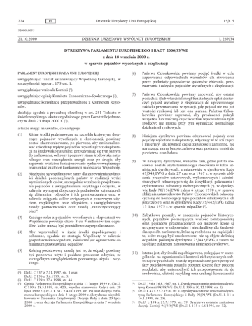 224 Dziennik Urzędowy Unii Europejskiej PL 15/t. 5 32000L0053 21.10.2000 DZIENNIK URZĘDOWY WSPÓLNOT EUROPEJSKICH L 269/34 DYREKTYWA PARLAMENTU EUROPEJSKIEGO I RADY 2000/53/WE z dnia 18 września 2000 r. w sprawie pojazdów wycofanych z eksploatacji PARLAMENT EUROPEJSKI I RADA UNII EUROPEJSKIEJ, (6) Państwa Członkowskie powinny podjąć środki w celu zapewnienia odpowiednich warunków dla stworzenia przez podmioty gospodarcze systemów zbierania, przetwarzania i odzysku pojazdów wycofanych z eksploatacji. (7) Państwa Członkowskie powinny zapewnić, aby ostatni posiadacz i/lub właściciel mógł bez żadnych opłat dostarczyć pojazd wycofany z eksploatacji do uprawnionego zakładu przetwarzania w sytuacji, gdy pojazd nie ma już wartości rynkowej lub jest ona ujemna. Państwa Członkowskie powinny zapewnić, aby producenci pokryli wszystkie lub znaczną część kosztów wprowadzenia tych środków; nie można przy tym ograniczać normalnego działania sił rynkowych. (8) Niniejsza dyrektywa powinna obejmować pojazdy oraz pojazdy wycofane z eksploatacji, włączając w to ich części i materiały, jak również części zapasowe i zamienne, nie naruszając norm bezpieczeństwa oraz poziomu emisji do powietrza oraz hałasu. (9) W niniejszej dyrektywie, wszędzie tam, gdzie jest to stosowne, została użyta terminologia stosowana w kilku istniejących dyrektywach, a mianowicie w dyrektywie Rady 67/548/EWG z dnia 27 czerwca 1967 r. w sprawie zbliżenia przepisów ustawowych, wykonawczych i administracyjnych odnoszących się do klasyfikacji, pakowania i etykietowania substancji niebezpiecznych (4), w dyrektywie Rady 70/156/EWG z dnia 6 lutego 1970 r. w sprawie zbliżenia ustawodawstw Państw Członkowskich odnoszących się do homologacji typu pojazdów silnikowych i ich przyczep (5), oraz w dyrektywie Rady 75/442/EWG z dnia 15 lipca 1975 r. w sprawie odpadów (6). (10) Zabytkowe pojazdy, w znaczeniu pojazdów historycznych, pojazdów posiadających wartość kolekcjonerską oraz pojazdów przeznaczonych do muzeów, które są utrzymywane w odpowiedni i nieszkodliwy dla środowiska sposób, zarówno te, które są rozłożone na części jak i te, które mogą być uruchomione, nie są objęte definicją odpadów, podaną w dyrektywie 75/442/EWG, a zatem nie są objęte zakresem zastosowania niniejszej dyrektywy. (11) Istotne jest, aby środki zapobiegawcze, polegające w szczególności na ograniczeniu i kontroli niebezpiecznych substancji w pojazdach, zostały wprowadzone począwszy od fazy projektowania pojazdu poprzez kolejne fazy procesu produkcji, aby uniemożliwić ich przedostawanie się do środowiska, ułatwić recykling oraz uniknąć konieczności uwzględniając Traktat ustanawiający Wspólnotę Europejską, w szczególności jego art. 175 ust. 1, uwzględniając wniosek Komisji (1), uwzględniając opinię Komitetu Ekonomiczno-Społecznego (2), uwzględniając konsultacje przeprowadzone z Komitetem Regionów, działając zgodnie z procedurą określoną w art. 251 Traktatu w świetle wspólnego tekstu uzgodnionego przez Komitet Pojednawczy w dniu 23 maja 2000 r. (3), a także mając na uwadze, co następuje: (1) Różne środki podejmowane na szczeblu krajowym, dotyczące pojazdów wycofanych z eksploatacji, powinny zostać zharmonizowane, po pierwsze, aby zminimalizować szkodliwy wpływ pojazdów wycofanych z eksploatacji na środowisko naturalne, przyczyniając się tym samym do zachowania, ochrony i poprawy stanu środowiska naturalnego oraz oszczędzenia energii oraz po drugie, aby zapewnić właściwe funkcjonowanie rynku wewnętrznego oraz unikać zakłóceń konkurencji na obszarze Wspólnoty. (2) Niezbędne są wspólnotowe ramy dla zapewnienia spójności działań poszczególnych państw w realizacji wyżej wymienionych celów, szczególnie w zakresie projektowania pojazdów z uwzględnieniem recyklingu i odzysku, w zakresie wymagań dotyczących podmiotów zajmujących się zbieraniem odpadów i ich przetwarzaniem oraz w zakresie osiągania celów związanych z ponownym użyciem, recyklingiem oraz odzyskiem, z uwzględnieniem zasady pomocniczości oraz zasadą „zanieczyszczający płaci”. (3) Każdego roku z pojazdów wycofanych z eksploatacji we Wspólnocie powstaje około 8 do 9 milionów ton odpadów, które muszą być prawidłowo zagospodarowane. (4) Aby wprowadzić w życie środki zapobiegawcze i ochronne, zgodnie ze strategią Wspólnoty w zakresie gospodarowania odpadami, konieczne jest ograniczenie do minimum powstawania odpadów. (5) Kolejną podstawową zasadą jest to, że odpady powinny być ponownie użyte i poddane procesom odzysku, ze szczególnym uwzględnieniem ponownego użycia i recyklingu. (1) Dz.U. C 337 z 7.11.1997, str. 3 oraz Dz.U. C 156 z 3.6.1999, str. 5. (2) Dz.U. C 129 z 27.4.1998, str. 44. (3) Opinia Parlamentu Europejskiego z dnia 11 lutego 1999 r. (Dz.U. C 150 z 28.5.1999, str. 420), wspólne stanowisko Rady z dnia 29 lipca 1999 r. (Dz.U. C 317 z 4.11.1999, str. 19) oraz decyzja Parlamentu Europejskiego z dnia 3 lutego 2000 r. (dotychczas niepublikowana w Dzienniku Urzędowym). Decyzja Rady z dnia 20 lipca 2000 r. oraz decyzja Parlamentu Europejskiego z dnia 7 września 2000 r. (4) Dz.U. 196 z 16.8.1967, str. 1. Dyrektywa ostatnio zmieniona dyrektywą Komisji 98/98/WE (Dz.U. L 355 z 30.12.1998, str. 1). (5) Dz.U. L 42 z 23.2.1970, str. 1. Dyrektywa ostatnio zmieniona dyrektywą Parlamentu Europejskiego i Rady 98/91/WE (Dz.U. L 11 z 16.1.1999, str. 25). (6) Dz.U. L 194 z 25.7.1975, str. 39. Dyrektywa ostatnio zmieniona decyzją Komisji 96/350/WE (Dz.U. L 135 z 6.6.1996, str. 32). 15/t. 5 PL Dziennik Urzędowy Unii Europejskiej unieszkodliwiania odpadów niebezpiecznych. W szczególności należy zakazać użycia ołowiu, rtęci, kadmu oraz sześciowartościowego chromu. Te metale ciężkie powinny być wykorzystywane jedynie w określonych zastosowaniach zgodnie z listą, która będzie poddawana regularnym przegląd