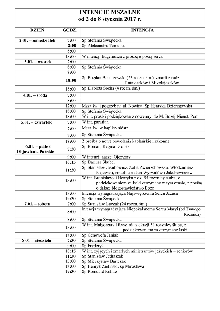INTENCJE MSZALNE od 2 do 8 stycznia 2017 r.