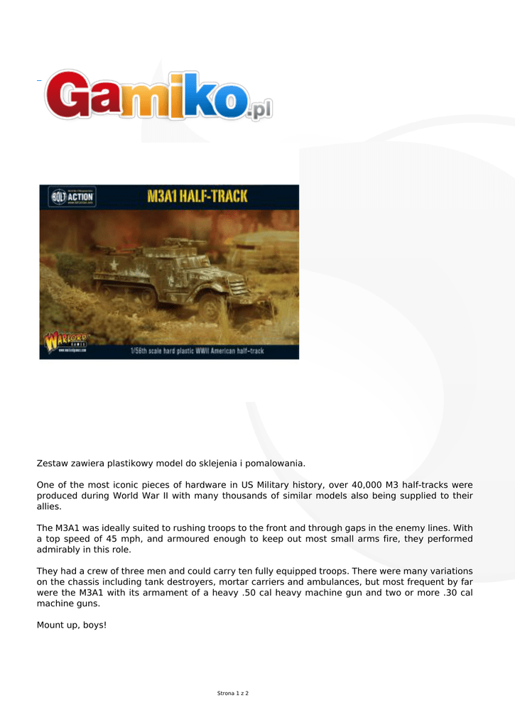 Zestaw zawiera plastikowy model do sklejenia i pomalowania. One of the most iconic pieces of hardware in US Military history, over 40,000 M3 half-tracks were produced during World War II with many thousands of similar models also being supplied to their allies. The M3A1 was ideally suited to rushing troops to the front and through gaps in the enemy lines. With a top speed of 45 mph, and armoured enough to keep out most small arms fire, they performed admirably in this role. They had a crew of three men and could carry ten fully equipped troops. There were many variations on the chassis including tank destroyers, mortar carriers and ambulances, but most frequent by far were the M3A1 with its armament of a heavy .50 cal heavy machine gun and two or more .30 cal machine guns. Mount up, boys! Strona 1 z 2 Producent Warlord Games Strona 2 z 2