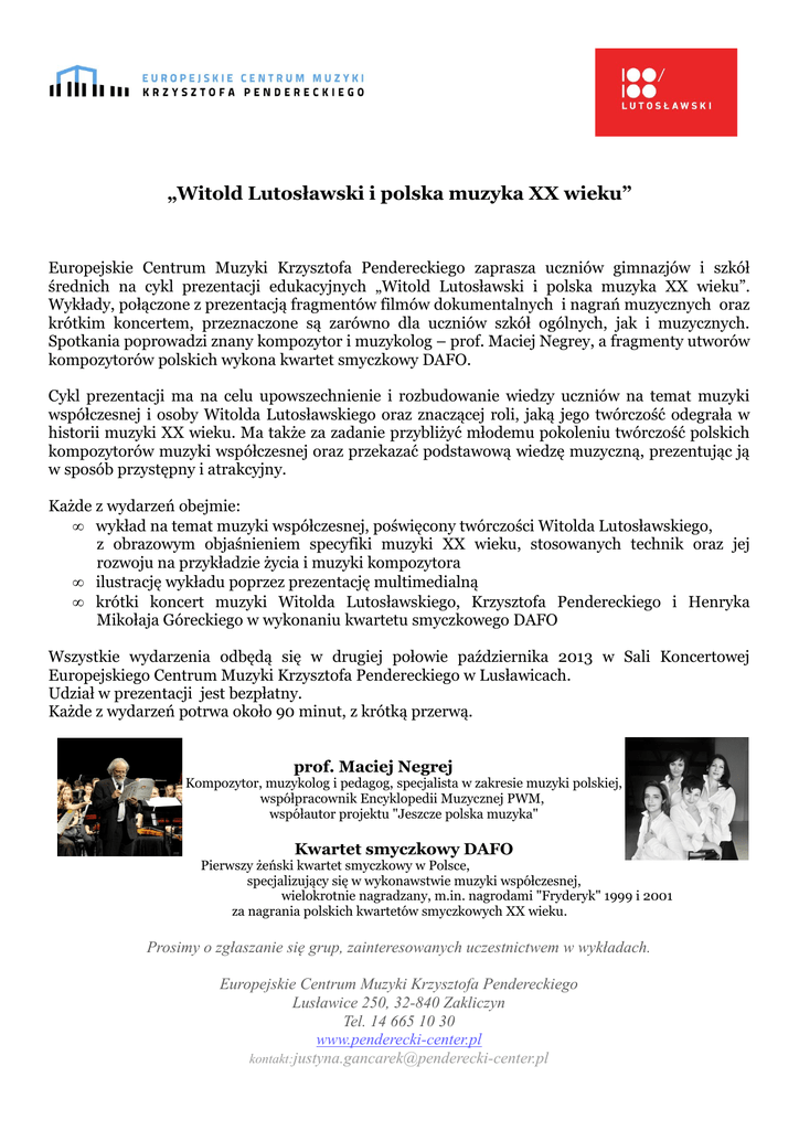 „Witold Lutosławski i polska muzyka XX wieku” Europejskie Centrum Muzyki Krzysztofa Pendereckiego zaprasza uczniów gimnazjów i szkół średnich na cykl prezentacji edukacyjnych „Witold Lutosławski i polska muzyka XX wieku”. Wykłady, połączone z prezentacją fragmentów filmów dokumentalnych i nagrań muzycznych oraz krótkim koncertem, przeznaczone są zarówno dla uczniów szkół ogólnych, jak i muzycznych. Spotkania poprowadzi znany kompozytor i muzykolog – prof. Maciej Negrey, a fragmenty utworów kompozytorów polskich wykona kwartet smyczkowy DAFO. Cykl prezentacji ma na celu upowszechnienie i rozbudowanie wiedzy uczniów na temat muzyki współczesnej i osoby Witolda Lutosławskiego oraz znaczącej roli, jaką jego twórczość odegrała w historii muzyki XX wieku. Ma także za zadanie przybliżyć młodemu pokoleniu twórczość polskich kompozytorów muzyki współczesnej oraz przekazać podstawową wiedzę muzyczną, prezentując ją w sposób przystępny i atrakcyjny. Każde z wydarzeń obejmie: • wykład na temat muzyki współczesnej, poświęcony twórczości Witolda Lutosławskiego, z obrazowym objaśnieniem specyfiki muzyki XX wieku, stosowanych technik oraz jej rozwoju na przykładzie życia i muzyki kompozytora • ilustrację wykładu poprzez prezentację multimedialną • krótki koncert muzyki Witolda Lutosławskiego, Krzysztofa Pendereckiego i Henryka Mikołaja Góreckiego w wykonaniu kwartetu smyczkowego DAFO Wszystkie wydarzenia odbędą się w drugiej połowie października 2013 w Sali Koncertowej Europejskiego Centrum Muzyki Krzysztofa Pendereckiego w Lusławicach. Udział w prezentacji jest bezpłatny. Każde z wydarzeń potrwa około 90 minut, z krótką przerwą. prof. Maciej Negrej Kompozytor, muzykolog i pedagog, specjalista w zakresie muzyki polskiej, współpracownik Encyklopedii Muzycznej PWM, współautor projektu "Jeszcze polska muzyka" Kwartet smyczkowy DAFO Pierwszy żeński kwartet smyczkowy w Polsce, specjalizujący się w wykonawstwie muzyki współczesnej, wielokrotnie nagradzany, m.in. nagrodami "Fryderyk" 1999 i 2001 za nagrania polskich kwartetów smyczkowych XX wieku. Prosimy o zgłaszanie się grup, zainteresowanych uczestnictwem w wykładach. Europejskie Centrum Muzyki Krzysztofa Pendereckiego Lusławice 250, 32-840 Zakliczyn Tel. 14 665 10 30 www.penderecki-center.pl kontakt:[email protected]