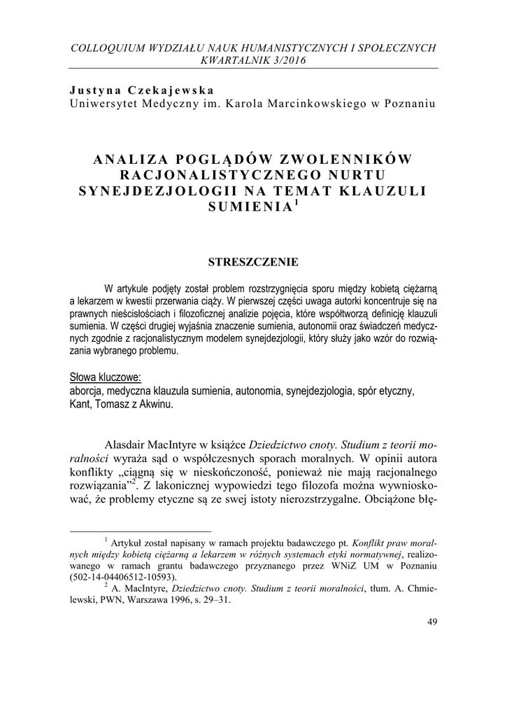 COLLOQUIUM WYDZIAŁU NAUK HUMANISTYCZNYCH I SPOŁECZNYCH KWARTALNIK 3/2016 Justyna Czekajewska Uniwers ytet Medyczny im. Karola Marcinkowskiego w Poznaniu ANALIZA POGLĄDÓW ZWOLENNIKÓW RACJONALISTYCZNEGO NURTU SYNEJDEZJOLOGII NA TEMAT KLAUZULI SUMIENIA1 STRESZCZENIE W artykule podjęty został problem rozstrzygnięcia sporu między kobietą ciężarną a lekarzem w kwestii przerwania ciąży. W pierwszej części uwaga autorki koncentruje się na prawnych nieścisłościach i filozoficznej analizie pojęcia, które współtworzą definicję klauzuli sumienia. W części drugiej wyjaśnia znaczenie sumienia, autonomii oraz świadczeń medycznych zgodnie z racjonalistycznym modelem synejdezjologii, który służy jako wzór do rozwiązania wybranego problemu. Słowa kluczowe: aborcja, medyczna klauzula sumienia, autonomia, synejdezjologia, spór etyczny, Kant, Tomasz z Akwinu. Alasdair MacIntyre w książce Dziedzictwo cnoty. Studium z teorii moralności wyraża sąd o współczesnych sporach moralnych. W opinii autora konflikty „ciągną się w nieskończoność, ponieważ nie mają racjonalnego rozwiązania”2. Z lakonicznej wypowiedzi tego filozofa można wywnioskować, że problemy etyczne są ze swej istoty nierozstrzygalne. Obciążone błę- 1 Artykuł został napisany w ramach projektu badawczego pt. Konflikt praw moralnych między kobietą ciężarną a lekarzem w różnych systemach etyki normatywnej, realizowanego w ramach grantu badawczego przyznanego przez WNiZ UM w Poznaniu (502-14-04406512-10593). 2 A. MacIntyre, Dziedzictwo cnoty. Studium z teorii moralności, tłum. A. Chmielewski, PWN, Warszawa 1996, s. 29–31. 49 Justyna Czekajewska dem wewnętrznej niespójności nie prowadzą do praktycznych rozwiązań, dlatego być może nie warto się nimi zajmować. Gdyby słowa uczonego potraktować dosłownie, to wskazana interpretacja byłaby słuszna, jednak MacIntyre nie informuje nas o braku możliwości rozwiązania problemów, ale o często powielanych błędach, które popełniamy w czasie rozstrzygania konfliktów moralnych. Jednym z nich jest dychotomiczne ujęcie sporów. Prowadzenie debat w atmosferze pełnej napięcia, emocjonalnego wzburzenia i niezgody prowokuje do tworzenia podziałów między uczestnikami dyskusji. Osoby zaangażowane w rozmowę więcej uwagi koncentrują na obronie swoich racji niż na wypracowaniu wspólnej metody rozwiązania konfliktu. Z tego powodu większość współczesnych problemów moralnych, takich jak legalizacja aborcji, upowszechnienie technik reprodukcji wspomaganej czy prowadzenie badań eksperymentalnych z użyciem ludzkich zarodków i komórek macierzystych, jest wykorzystywanych przez zantagonizowane grupy do udowodnienia własnych przekonań oraz pozyskania jak największej liczby zwolenników. Opinia wyrażona przez uczonego nie jest sugestią, która ma nakłonić polemistów do rozwagi w czasie prowadzenia debat. MacIntyre wytyka przeinaczenia, do jakich każdy przywykł sięgać w trakcie dyskusji. Korzystanie z zasady dychotomii sprawia, że cała uwaga skupiona jest na negatywnej stronie sporu. Przedstawiona przez każdą z grup argumentacja oddala uczestników od głównego zadania, kiedy nadrzędną wartością rozmowy powinno być opracowanie modelu, który pomoże rozwiązać określony problem moralny. Problem ten z całą wyrazistością ujawnia się podczas sporów o prawo do korzystania przez personel medyczny z tak zwanej klauzuli sumienia. W artykule zamierzam nie tylko wyjaśnić powody ograniczające rozwiązanie konfliktowych sytuacji, ale także przedstawić rozumienie sporu na temat klauzuli sumienia przez przedstawicieli racjonalistycznego nurtu synejdezjologii. Wytyczenie granicy autonomii lekarza i pacjenta jest tematem, który dzieli uczestników dyskusji. Jedno z aktualnych bioetycznych zagadnień dotyczy stanów granicznych życia człowieka i przyczynia się do powstawania nieporozumień. Sądzę, że jednym z głównych powodów dotychczasowej nierozstrzygalności tego konfliktu są tzw. prawne nieścisłości powstałe wskutek stosowania niewłaściwej interpretacji pojęć i wyrażeń. Do wskazanych terminów należą: 50 sumienie, autonomia, odmowa świadczeń medycznych. COLLOQUIUM WNHiS ANALIZA POGLĄDÓW ZWOLENNIKÓW RACJONALISTYCZNEGO NURTU … Trudności interpretacyjne medycznej klauzuli sumienia W jednym z artykułów na temat medycznej klauzuli sumienia Włodzimierz Galewicz ustala jej definicję: „Medyczna klauzula sumienia (MKS) jest normą prawną, na mocy której pracownicy opieki zdrowotnej są upoważnieni do tego, aby w określonych warunkach odstępować od wykonania świadczeń medycznych, akceptowanych przez obowiązujące ich ustawodawstwo, lecz niezgodnych z ich sumieniem”3. W tekście autor wskazuje na kryteria, które należy dokładnie zbadać, jeśli oczekuje się wyjaśnienia oraz praktycznego zastosowania medycznej klauzuli sumienia. Z treści definicji wynika, że jest ona nie tylko normą moralną, ale także prawną i dotyczy wybranych pracowników służby zdrowia (lekarzy, pielęgniarek i położnych)4. Rozumienie klauzuli sumienia jako normy obliguje wszystkich pracowników medycznych do jej respektowania oraz przestrzegania. Innymi słowy, jako powszechna zasada zobowiązuje całe środowisko medyczne do szacunku dla prywatnego światopoglądu pracowników szpitala, co tym samym uniemożliwia na przykład utratę pracy z powodu niewykonania świadczenia, które jest niezgodne z przekonaniami osoby zatrudnionej. Bardzo ważne jest ustalenie warunków, które zawsze muszą zostać spełnione, jeśli pracownik zamierza odstąpić od wykonania świadczenia medycznego. Okoliczności, o których mowa, zostały określone ustawowo: Art. 39 ustawy o zawodzie lekarza z dnia 5 grudnia 1996 r.: „Lekarz może powstrzymać się od wykonania świadczeń zdrowotnych niezgodnych z jego sumieniem, z zastrzeżeniem art. 30, z tym że ma obowiązek wskazać realne możl