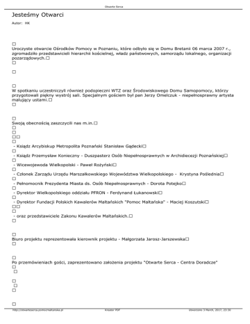Otwarte Serca Jesteśmy Otwarci Autor: HK Uroczyste otwarcie Ośrodków Pomocy w Poznaniu, które odbyło się w Domu Bretanii 06 marca 2007 r., zgromadziło przedstawicieli hierarchii kościelnej, władz państwowych, samorządu lokalnego, organizacji pozarządowych. W spotkaniu uczestniczyli również podopieczni WTZ oraz Środowiskowego Domu Samopomocy, którzy przygotowali piękny wystrój sali. Specjalnym gościem był pan Jerzy Omelczuk - niepełnosprawny artysta malujący ustami. Swoją obecnością zaszczycili nas m.in. - Ksiądz Arcybiskup Metropolita Poznański Stanisław Gądecki - Ksiądz Przemysław Konieczny - Duszpasterz Osób Niepełnosprawnych w Archidiecezji Poznańskiej - Wicewojewoda Wielkopolski - Paweł Rożyński - Członek Zarządu Urzędu Marszałkowskiego Województwa Wielkopolskiego - Krystyna Poślednia - Pełnomocnik Prezydenta Miasta ds. Osób Niepełnosprawnych - Dorota Potejko - Dyrektor Wielkopolskiego oddziału PFRON - Ferdynand Łukanowski - Dyrektor Fundacji Polskich Kawalerów Maltańskich "Pomoc Maltańska" - Maciej Koszutski - oraz przedstawiciele Zakonu Kawalerów Maltańskich. Biuro projektu reprezentowała kierownik projektu - Małgorzata Jarosz-Jarszewska Po przemówieniach gości, zaprezentowano założenia projektu "Otwarte Serca - Centra Doradcze" http://otwarteserca.pomocmaltanska.pl Kreator PDF Utworzono 3 March, 2017, 23:30 Otwarte Serca Kierownicy Ośrodków Pomocy - Anna Kopka wraz z Maciejem Mankiewiczem przedstawili główne cele ośrodków poznańskich. Pan Piotr Olewiński Prezes Firmy NOVOL, zatrudniającej osoby niepełnosprawne, przedstawił zgromadzonym ideę zatrudniania osób niepełnosprawnych. Na zakończenie części oficjalnej pan Andrzej Aga Grzelachowski opowiedział o rehabilitacji osób niepełnosprawnych poprzez sztukę. Następnie przekazał Ośrodkom obrazy, które powstawały w trakcie inauguracji - namalował je ustami pan Jerzy Omelczuk. Po części oficjalnej zaproszono gości na wystawę przygotowaną przez podopiecznych WTZ oraz Środowiskowego Domu Samopomocy w Puszczykowie. Następnie goście zostali zaproszeni na poczęstunek. Na zakończenie każdy z gości otrzymał upominek - specjalnie przygotowaną na tę okazję teczkę, w której zalazły się informacje o Fundacji i Ośrodkach oraz prace wykonane przez podopiecznych WTZ oraz Środowiskowego Domu Samopomocy. Od tej pory jesteśmy już oficjalnie otwarci i czekamy na kolejne wyzwania. http://otwarteserca.pomocmaltanska.pl Kreator PDF Utworzono 3 March, 2017, 23:30