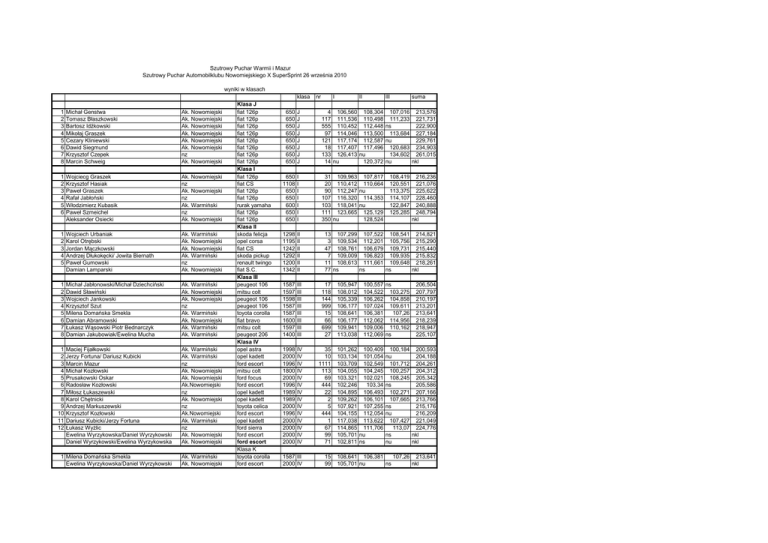Szutrowy Puchar Warmii i Mazur Szutrowy Puchar Automobilklubu Nowomiejskiego X SuperSprint 26 września 2010 wyniki w klasach klasa 1 2 3 4 5 6 7 8 Michał Genstwa Tomasz Błaszkowski Bartosz Idźkowski Mikołaj Graszek Cezary Kliniewski Dawid Siegmund Krzysztof Czepek Marcin Schweig Ak. Nowomiejski Ak. Nowomiejski Ak. Nowomiejski Ak. Nowomiejski Ak. Nowomiejski Ak. Nowomiejski nz Ak. Nowomiejski 1 2 3 4 5 6 Wojciecg Graszek Krzysztof Hasiak Paweł Graszek Rafał Jabłoński Włodzimierz Kubasik Paweł Szmeichel Aleksander Osiecki Ak. Nowomiejski nz Ak. Nowomiejski nz Ak. Warmiński nz Ak. Nowomiejski 1 2 3 4 5 Wojciech Urbaniak Karol Otrębski Jordan Mączkowski Andrzej Dłukokęcki/ Jowita Biernath Paweł Gumowski Damian Lamparski Ak. Warmiński Ak. Nowomiejski Ak. Nowomiejski Ak. Warmiński nz Ak. Nowomiejski 1 2 3 4 5 6 7 8 Michał Jabłonowski/Michał Dziechciński Dawid Sławiński Wojciech Jankowski Krzysztof Szut Milena Domańska Smekla Damian Abramowski Łukasz Wąsowski Piotr Bednarczyk Damian Jakubowiak/Ewelina Mucha Ak. Warmiński Ak. Nowomiejski Ak. Nowomiejski nz Ak. Warmiński Ak. Nowomiejski Ak. Warmiński Ak. Warmiński Maciej Fijałkowski Jerzy Fortuna/ Dariusz Kubicki Marcin Mazur Michał Kozłowski Prusakowski Oskar Radosław Kozłowski Miłosz Łukaszewski Karol Chętnicki Andrzej Markuszewski Krzysztof Kozłowski Dariusz Kubicki/Jerzy Fortuna Łukasz WyŜlic Ewelina Wyrzykowska/Daniel Wyrzykowski Daniel Wyrzykowski/Ewelina Wyrzykowska Ak. Warmiński Ak. Warmiński nz Ak. Nowomiejski Ak. Nowomiejski Ak.Nowomiejski nz Ak. Nowomiejski nz Ak.Nowomiejski Ak. Warmiński nz Ak. Nowomiejski Ak. Nowomiejski 1 Milena Domańska Smekla Ewelina Wyrzykowska/Daniel Wyrzykowski Ak. Warmiński Ak. Nowomiejski 1 2 3 4 5 6 7 8 9 10 11 12 Klasa J fiat 126p fiat 126p fiat 126p fiat 126p fiat 126p fiat 126p fiat 126p fiat 126p Klasa I fiat 126p fiat CS fiat 126p fiat 126p rurak yamaha fiat 126p fiat 126p Klasa II skoda felicja opel corsa fiat CS skoda pickup renault twingo fiat S.C. Klasa III peugeot 106 mitsu colt peugeot 106 peugeot 106 toyota corolla fiat bravo mitsu colt peugeot 206 Klasa IV opel astra opel kadett ford escort mitsu colt ford focus ford escort opel kadett opel kadett toyota celica ford escort opel kadett ford sierra ford escort ford escort Klasa K toyota corolla ford escort nr I II III suma 650 650 650 650 650 650 650 650 J J J J J J J J 4 106,560 108,304 107,016 213,576 117 111,536 110,498 111,233 221,731 555 110,452 112,448 ns 222,900 97 114,046 113,500 113,684 227,184 121 117,174 112,587 nu 229,761 18 117,407 117,496 120,683 234,903 133 126,413 nu 134,602 261,015 14 nu 120,372 nu nkl 650 1108 650 650 600 650 650 I I I I I I I 31 109,963 107,817 20 110,412 110,664 90 112,247 nu 107 116,320 114,353 103 118,041 nu 111 123,665 125,129 350 nu 128,524 1298 1195 1242 1292 1200 1342 II II II II II II 1587 1597 1598 1587 1587 1600 1597 1400 III III III III III III III III 17 118 144 999 15 66 699 27 1998 2000 1996 1800 2000 1996 1989 1989 2000 1996 2000 2000 2000 2000 IV IV IV IV IV IV IV IV IV IV IV IV IV IV 35 10 1111 113 69 444 22 2 5 444 1 67 99 71 1587 III 2000 IV 15 99 108,419 120,551 113,375 114,107 122,847 125,285 216,236 221,076 225,622 228,460 240,888 248,794 nkl 13 107,299 107,522 108,541 214,821 3 109,534 112,201 105,756 215,290 47 108,761 106,679 109,731 215,440 7 109,009 106,823 109,935 215,832 11 108,613 111,661 109,648 218,261 77 ns ns ns nkl 105,947 108,012 105,339 106,177 108,641 106,177 109,941 113,038 100,557 ns 104,522 103,275 106,262 104,858 107,024 109,611 106,381 107,26 112,062 114,956 109,006 110,162 112,069 ns 101,262 100,409 103,134 101,054 103,709 102,549 104,055 104,245 103,321 102,021 102,246 103,34 104,895 106,493 109,262 106,101 107,921 107,255 104,155 112,054 117,038 113,622 114,865 111,706 105,701 nu 102,811 ns 206,504 207,797 210,197 213,201 213,641 218,239 218,947 225,107 100,184 200,593 nu 204,188 101,712 204,261 100,257 204,312 108,245 205,342 ns 205,586 102,271 207,166 107,665 213,766 ns 215,176 nu 216,209 107,427 221,049 113,07 224,776 ns nkl nu nkl 108,641 106,381 107,26 213,641 105,701 nu ns nkl
