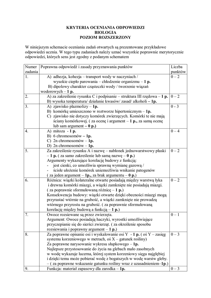 KRYTERIA OCENIANIA ODPOWIEDZI BIOLOGIA POZIOM ROZSZERZONY W niniejszym schemacie oceniania zadań otwartych są prezentowane przykładowe odpowiedzi ucznia. W tego typu zadaniach należy uznać wszystkie poprawnie merytorycznie odpowiedzi, których sens jest zgodny z podanym schematem Numer Poprawna odpowiedź i zasady przyznawania punktów zadania 1. A) adhezja, kohezja – transport wody w naczyniach / wysokie ciepło parowania – chłodzenie organizmu – 1 p. B) dipolowy charakter cząsteczki wody / tworzenie wiązań wodorowych – 1 p. 2. A) za zakreślenie rysunku C i podpisanie – struktura III rzędowa – 1 p. B) wysoka temperatura/ działanie kwasów/ zasad/ alkoholi – 1p. 3. A) zjawisko plazmolizy – 1p. B) komórkę umieszczono w roztworze hipertonicznym – 1p. C) zjawisko nie dotyczy komórek zwierzęcych. Komórki te nie mają ściany komórkowej. ( za ocenę i argument – 1 p., za samą ocenę lub sam argument – 0 p.) 4. A) mitoza - 1 p. B) 6 chromosomów – 1p. C) 2n chromosomów – 1p. D) 2n chromosomów – 1p. 5. Za zakreślenie rysunku A i nazwę – nabłonek jednowarstwowy płaski – 1 p. ( za samo zakreślenie lub samą nazwę – 0 p.) Argumenty wykazujące korelację budowy z funkcją: - jest cienki, co umożliwia sprawną wymianę gazową / - ścisłe ułożenie komórek uniemożliwia wnikanie patogenów ( za jeden argument – 1p., za brak argumentu – 0 p.) 6. Różnica: wiązki kolateralne otwarte posiadają między warstwą łyka i drewna komórki miazgi, a wiązki zamknięte nie posiadają miazgi. ( za poprawnie sformułowaną różnicę – 1 p.) Konsekwencja budowy: wiązki otwarte dzięki obecności miazgi mogą przyrastać wtórnie na grubość, a wiązki zamknięte nie prowadzą wtórnego przyrostu na grubość. ( za poprawnie sformułowaną korelację między budową a funkcją – 1 p.) 7. Owoce rozsiewane są przez zwierzęta. Argument: Owoce posiadają haczyki, wyrostki umożliwiające przyczepianie się do sierści zwierząt. ( za określenie sposobu rozsiewania i poprawny argument – 1 p.) 8. Za poprawne opisanie osi i wyskalowanie osi Y - 1 p. ( oś Y – zasięg systemu korzeniowego w metrach, oś X – gatunek rośliny) Za poprawne narysowanie wykresu słupkowego – 1p. Najlepsze przystosowanie do życia na glebach mało zasobnych w wodę wykazuje lucerna, której system korzeniowy sięga najgłębiej i dzięki temu może pobierać wodę z bogatszych w wodę warstw gleby. – ( za poprawne wskazanie gatunku rośliny wraz z uzasadnieniem–1p.) 9. Funkcja: materiał zapasowy dla zarodka – 1p. Liczba punktów 0–2 0–2 0-3 0–4 0–2 0–2 0–1 0–3 0–3 10. 11. 12. 13. 14. Bielmo pierwotne – 1n, bielmo wtórne – 3n, obielmo – 2n ( za trzy poprawne wskazania – 2 p., za dwa poprawne wskazania – 1 p.) Widłaki/ widłakowe – 1 p. Podlegają ochronie ze względu na bardzo wydłużony w czasie cykl rozwojowy – 1 p. Przykładowe łańcuchy pokarmowe: Rośliny wodne owady kaczka mandarynka ( konsument II rzędu) Roślina wodna owady małe ryby kaczka mandarynka (konsument III rzędu) Za każdy łańcuch pokarmowy zgodny z poleceniem - 1p. Kaktusy i rośliny gruboszowate pobierają CO2 w nocy, gdy mają otwarte aparaty szparkowe i gromadzą go w formie jabłczanu w wakuoli, w ciągu dnia odzyskują CO2 z jabłczanu. Za każdą wymienioną różnicę wraz z przystosowaniem – 1 p. Przykłady odpowiedzi: - mniejsza gęstość atmosfery niż wody - wykształcenie tkanki wzmacniającej - mniejsza zawartość wody w atmosferze – skórka pokryta kutykulą chroniącą przed nadmiernym parowaniem 16. 17. 18. 19. 0–2 0–1 0–2 0–3 - 1 p. sporofit zarodnik gametofit gamety zygota - 1 p. 2n 1n 1n 1n 2n - 1 p. (za prawidłowo podpisane wszystkie elementy w każdym wersie po 1 p.) ( uczeń może cykl rozwojowy rozpocząć od dowolnego stadium) A) Hipoteza: Szczepienie bakteriami brodawkowymi intensyfikuje 0–2 wzrost rośliny. – 1 p. B) Bakterie brodawkowe współżyjąc z roślinami motylkowymi, wiążą wolny azot atmosferyczny, który może być zużytkowany przez rośliny do budowy własnych białek. Efektem będą większe rozmiary rośliny. – 1 p. Mejoza 15. 0–2 zapłodnienie Im większa odległość tętnicy od serca tym większe ciśnienie krwi i mniejsza jej prędkość przepływu – 1 p. (zależność tylko pomiędzy odległością tętnicy od serca a ciśnieniem krwi lub tylko prędkością przepływu krwi – 0 p.) A) najbardziej wrażliwy jest korzeń, ponieważ reaguje przy najmniejszych stężeniach auksyn – 1 p. ( 1 p. za podanie nazwy organu i uzasadnienie, za samą nazwę lub uzasadnienie - 0p.) B) auksyny nasilają tworzenie korzeni bocznych, wykorzystano to zjawisko przy produkcji ukorzeniaczy – 1 p. Za każdą z poprawnie sformułowanych różnic 1 p. - Ryby słodkowodne narażone są na osmotyczny napływ wody do wnętrza organizmu, a ryby morskie kostnoszkieletowe na osmotyczny wypływ wody z organizmu - Ryby słodkowodne nie piją wody, a ryby morskie kostnoszkieletowe piją słoną wodę - Ryby słodkowodne wydalają dużo rozcieńczonego moczu, a ryby morskie kostnoszkieletowe małe ilości stężonego moczu. A) Za sformułowanie zależności wraz z wyjaśnieniem –1 p. (Za samą 0–1 0–2 0–3 0–3 20. 21. 22. 23. zależność lub samo wyjaśnienie – 0 p.) - wraz ze wzrostem temperatury rośnie szybkość śpiewu miecznika. Im wyższa temperatura , tym u zwierząt zmiennocieplnych szybsze tempo metabolizmu i szybsze tempo śpiewu. B) Wabienie partnerki do rozrodu - 1 p. C) Narządy tympanalne – 1 p. A) stekowce – 1 p. 0–4 B) Za poprawne wymienienie trzech cech – 1 p. Za dwie lub jedną cechę – 0 p. - szerokie rozstawienie kończyn - obecność kości kruczej w obręczy barkowej - obecność steku - jajorodność C) gruczoły mleczne – 1 p. D) Za poprawną definicję wraz z przykładem organizmu – 1 p. Endemity to gatunki występujące na jednym tylko, ogranicz
