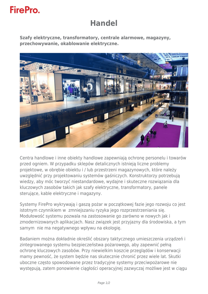 Handel Szafy elektryczne, transformatory, centrale alarmowe, magazyny, przechowywanie, okablowanie elektryczne. Centra handlowe i inne obiekty handlowe zapewniają ochronę personelu i towarów przed ogniem. W przypadku sklepów detalicznych istnieją liczne problemy projektowe, w obrębie obiektu i / lub przestrzeni magazynowych, które należy uwzględnić przy projektowaniu systemów gaśniczych. Konstruktorzy potrzebują wiedzy, aby móc tworzyć niestandardowe, wydajne i skuteczne rozwiązania dla kluczowych zasobów takich jak szafy elektryczne, transformatory, panele sterujące, kable elektryczne i magazyny. Systemy FirePro wykrywają i gaszą pożar w początkowej fazie jego rozwoju co jest istotnym czynnikiem w zmniejszaniu ryzyka jego rozprzestrzeniania się. Modułowość systemu pozwala na zastosowanie go zarówno w nowych jak i zmodernizowanych aplikacjach. Nasz związek jest przyjazny dla środowiska, a tym samym nie ma negatywnego wpływu na ekologię. Badaniem można dokładnie określić obszary taktycznego umieszczenia urządzeń i zintegrowanego systemu bezpieczeństwa pożarowego, aby zapewnić pełną ochronę kluczowych zasobów. Przy niewielkim koszcie przeglądów i konserwacji mamy pewność, że system będzie nas skutecznie chronić przez wiele lat. Skutki uboczne często spowodowane przez tradycyjne systemy przeciwpożarowe nie występują, zatem ponowienie ciągłości operacyjnej zazwyczaj możliwe jest w ciągu Page 1/2 kilku godzin. Page 2/2