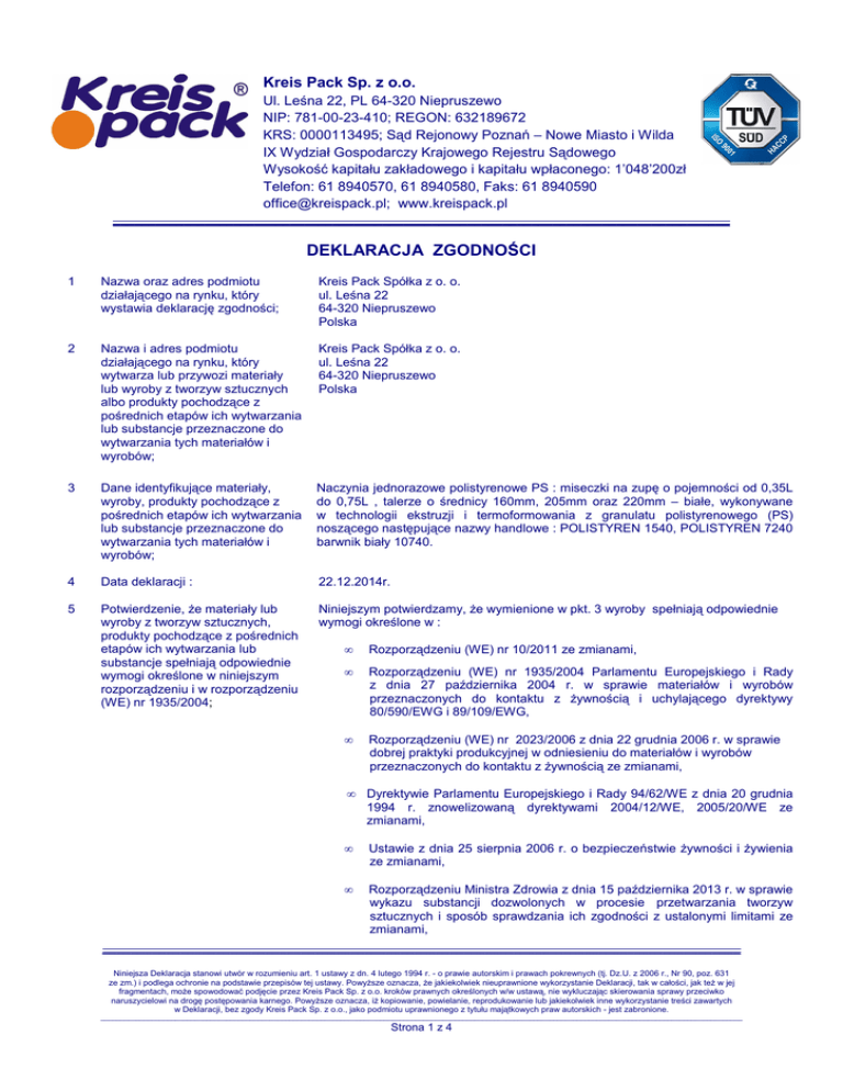 Kreis Pack Sp. z o.o. Ul. Leśna 22, PL 64-320 Niepruszewo NIP: 781-00-23-410; REGON: 632189672 KRS: 0000113495; Sąd Rejonowy Poznań – Nowe Miasto i Wilda IX Wydział Gospodarczy Krajowego Rejestru Sądowego Wysokość kapitału zakładowego i kapitału wpłaconego: 1’048’200zł Telefon: 61 8940570, 61 8940580, Faks: 61 8940590 [email protected]; www.kreispack.pl _______________________________________________________________________________________ DEKLARACJA ZGODNOŚCI 1 Nazwa oraz adres podmiotu działającego na rynku, który wystawia deklarację zgodności; Kreis Pack Spółka z o. o. ul. Leśna 22 64-320 Niepruszewo Polska 2 Nazwa i adres podmiotu działającego na rynku, który wytwarza lub przywozi materiały lub wyroby z tworzyw sztucznych albo produkty pochodzące z pośrednich etapów ich wytwarzania lub substancje przeznaczone do wytwarzania tych materiałów i wyrobów; Kreis Pack Spółka z o. o. ul. Leśna 22 64-320 Niepruszewo Polska 3 Dane identyfikujące materiały, wyroby, produkty pochodzące z pośrednich etapów ich wytwarzania lub substancje przeznaczone do wytwarzania tych materiałów i wyrobów; Naczynia jednorazowe polistyrenowe PS : miseczki na zupę o pojemności od 0,35L do 0,75L , talerze o średnicy 160mm, 205mm oraz 220mm – białe, wykonywane w technologii ekstruzji i termoformowania z granulatu polistyrenowego (PS) noszącego następujące nazwy handlowe : POLISTYREN 1540, POLISTYREN 7240 barwnik biały 10740. 4 Data deklaracji : 22.12.2014r. 5 Potwierdzenie, że materiały lub wyroby z tworzyw sztucznych, produkty pochodzące z pośrednich etapów ich wytwarzania lub substancje spełniają odpowiednie wymogi określone w niniejszym rozporządzeniu i w rozporządzeniu (WE) nr 1935/2004; Niniejszym potwierdzamy, że wymienione w pkt. 3 wyroby spełniają odpowiednie wymogi określone w : • Rozporządzeniu (WE) nr 10/2011 ze zmianami, • Rozporządzeniu (WE) nr 1935/2004 Parlamentu Europejskiego i Rady z dnia 27 października 2004 r. w sprawie materiałów i wyrobów przeznaczonych do kontaktu z żywnością i uchylającego dyrektywy 80/590/EWG i 89/109/EWG, • Rozporządzeniu (WE) nr 2023/2006 z dnia 22 grudnia 2006 r. w sprawie dobrej praktyki produkcyjnej w odniesieniu do materiałów i wyrobów przeznaczonych do kontaktu z żywnością ze zmianami, • Dyrektywie Parlamentu Europejskiego i Rady 94/62/WE z dnia 20 grudnia 1994 r. znowelizowaną dyrektywami 2004/12/WE, 2005/20/WE ze zmianami, • Ustawie z dnia 25 sierpnia 2006 r. o bezpieczeństwie żywności i żywienia ze zmianami, • Rozporządzeniu Ministra Zdrowia z dnia 15 października 2013 r. w sprawie wykazu substancji dozwolonych w procesie przetwarzania tworzyw sztucznych i sposób sprawdzania ich zgodności z ustalonymi limitami ze zmianami, __________________________________________________________________________________________ Niniejsza Deklaracja stanowi utwór w rozumieniu art. 1 ustawy z dn. 4 lutego 1994 r. - o prawie autorskim i prawach pokrewnych (tj. Dz.U. z 2006 r., Nr 90, poz. 631 ze zm.) i podlega ochronie na podstawie przepisów tej ustawy. Powyższe oznacza, że jakiekolwiek nieuprawnione wykorzystanie Deklaracji, tak w całości, jak też w jej fragmentach, może spowodować podjęcie przez Kreis Pack Sp. z o.o. kroków prawnych określonych w/w ustawą, nie wykluczając skierowania sprawy przeciwko naruszycielowi na drogę postępowania karnego. Powyższe oznacza, iż kopiowanie, powielanie, reprodukowanie lub jakiekolwiek inne wykorzystanie treści zawartych w Deklaracji, bez zgody Kreis Pack Sp. z o.o., jako podmiotu uprawnionego z tytułu majątkowych praw autorskich - jest zabronione. ___________________________________________________________________________________________________________________________________________________________________ Strona 1 z 4 Kreis Pack Sp. z o.o. Ul. Leśna 22, PL 64-320 Niepruszewo NIP: 781-00-23-410; REGON: 632189672 KRS: 0000113495; Sąd Rejonowy Poznań – Nowe Miasto i Wilda IX Wydział Gospodarczy Krajowego Rejestru Sądowego Wysokość kapitału zakładowego i kapitału wpłaconego: 1’048’200zł Telefon: 61 8940570, 61 8940580, Faks: 61 8940590 [email protected]; www.kreispack.pl _______________________________________________________________________________________ 6 7 8 • Ustawie z dnia 13 czerwca 2013 r. o opakowaniach i odpadami opakowaniowymi, • Rozporządzeniu Komisji (WE) nr 1895/2005 z dnia 18 listopada 2005 r. w sprawie ograniczenia wykorzystania niektórych pochodnych epoksydowych w materiałach i wyrobach przeznaczonych do kontaktu z żywnością Odpowiednie informacje dotyczące wykorzystywanych substancji lub produktów ich rozpadu, dla których w załączniku I i II niniejszego rozporządzenia określone zostały ograniczenia lub wymagania, aby umożliwić podmiotom działającym na rynku na dalszych etapach obrotu zapewnienie zgodności z tymi ograniczeniami; Monomery i substancje wchodzące w skład opisanych artykułów są umieszczone w wykazie w załączniku nr I do Rozporządzenia (WE) nr 10/2011 - Unijnym Wykazie dozwolonych monomerów, innych substancji wyjściowych, makrocząsteczek uzyskiwanych z fermentacji mikrobiologicznej, dodatków oraz substancji pomocniczych w produkcji polimerów. Odpowiednie informacje dotyczące substancji podlegających ograniczeniom w żywności, uzyskane z danych doświadczalnych lub w drodze teoretycznych obliczeń dotyczących poziomu ich migracji specyficznej oraz – w odpowiednich przypadkach – kryteria czystości zgodnie z dyrektywami 2008/60/WE, 95/45/WE i 2008/84/WE w celu umożliwienia użytkownikowi tych materiałów i wyrobów zgodności z odpowiednimi przepisami UE lub – w razie ich braku przepisami krajowymi mającymi zastosowanie do żywności; Ta deklaracja opiera się na wynikach testów przeprowadzonych przez niezależne, akredytowane i certyfikowane laboratoria. Wymagania dotyczące wykorzystania materiału lub wyrobu, takie jak: (