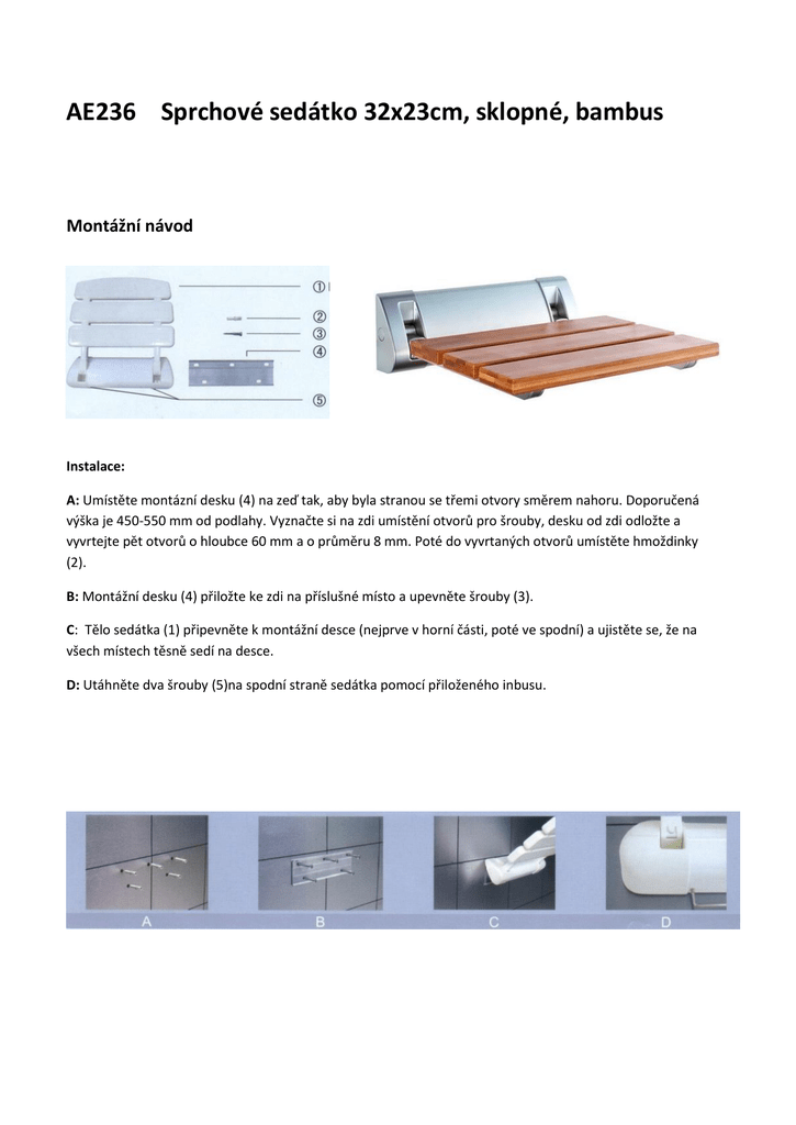 AE236 Sprchové sedátko 32x23cm, sklopné, bambus Montážní návod Instalace: A: Umístěte montázní desku (4) na zeď tak, aby byla stranou se třemi otvory směrem nahoru. Doporučená výška je 450-550 mm od podlahy. Vyznačte si na zdi umístění otvorů pro šrouby, desku od zdi odložte a vyvrtejte pět otvorů o hloubce 60 mm a o průměru 8 mm. Poté do vyvrtaných otvorů umístěte hmoždinky (2). B: Montážní desku (4) přiložte ke zdi na příslušné místo a upevněte šrouby (3). C: Tělo sedátka (1) připevněte k montážní desce (nejprve v horní části, poté ve spodní) a ujistěte se, že na všech místech těsně sedí na desce. D: Utáhněte dva šrouby (5)na spodní straně sedátka pomocí přiloženého inbusu. AE236 Shower seat 32x23 cm, folding, bamboo Installation manual Installing steps: A: Keep the plane of Fixing board (4) towards the wall and place it on the wall level, the edge with three holes of Fixing board (4) should be up. Recommended upright height from the floor is 450-550 mm. Mark down the screw holes and take down the Fixing board. Drill five holes with the depth of 60 mm and diameter of 8 mm and place the rawplug (2) into the holes. B: Put the Fixing board (4) onto the original place once again and screw down the expand screw (3) and fasten them. C: Button the Main body for shower seat (1) downwards absolutely from the upper part of Fixing board (4) until the inner side on the bottom of Main body for shower seat (1) touches the wall and keep the pedestal on the Main body for shower seat (1) and the two ends of Fixing board (4) orderly. D: Screw down two pcs of Hex socket Grub Screw (5) on the underside of Main body for the shower seat (1) with the supplied Hex socket spanner. AE236 Siedzisko prysznicowe 32x23cm, składane, bambus Instrukcja montażu Montaż: A: Przyłożyć płytkę montażową (4) do ściany tak, aby trzy otwory znajddowały się na górze. Zalecana wysokość montażu wynosi 450-550 mm od poziomu podłogi. Zaznaczyć na ścianie położenie otworów na śruby, odłożyć płytę i wywiercic pięc otworów o głębokości 60 mm i średnicy 8 mm. Następnie włożyć kołki do wywierconych otworów (2). B: Płytkę montażową (4) przyłożyć do ściany w odpowiednim miejscu i dokręcić śrubami (3). C: Zamontować siedzisko do przykręconej płytki montażowej, nakładając siedzisko zaczynając od górnych trzech śrub, następnie na dolne śruby. W celu przetestowania czy siedzisko zamontowane jest prawidlowo należy je przetestować siadając na nim. D: Dokręcić dwie śruby (5) na spodzie siedziska za pomocą dostarczonego imbusu. AE236 Duschklappsitz 32x23cm, mit Bambussitzfläche Montageanleitung Montage: A: Platzieren Sie die Montageplatte (4) an di Wand, so dass die Seite mit den 3 Löchern nach Oben zeigt. Die empfohlene Höhe beträgt 450-550 mm über dem Boden. Markieren Sie die Position der Schraubenlöcher an der Wand, nehmen Sie die Montageplatte ab und bohren Sie 5 Löcher mit einer Tiefe von 60mm und Durchschnitt von 8 mm. Setzen Sie die Dübel in die gebohrte Löcher ein (2). B: Platzieren Sie die Montageplatte (4) an die entsprechende Stelle an der Wand und befestigen Sie sie mit Schrauben (3). C: Befestigen Sie den Sitz (1) an die Montageplatte (erst oben, dann unten) und stellen Sie sicher, dass er an allen Stellen der Montageplatte fest ist. D: Ziehen Sie die zwei Sxchrauben (5) an der Unterseite des Sitzes mit dem mitgelieferten Imbusschlüssel. AE236 Sprchové sedátko 32x23cm, sklopné, bambus Montážny návod Inštalácia: A: Umiestnite montážnu dosku (4) na stenu tak, aby bola stranou s tromi otvormi smerom nahor. Odporúčaná výška je 450-550 mm od podlahy. Vyznačte si na stene umiestnenia otvorov pre skrutky, dosku od steny odložte a vyvŕtajte päť otvorov s hĺbkou 60 mm a s priemerom 8 mm. Potom do vyvŕtaných otvorov umiestnite hmoždinky (2). B: Montážnu dosku (4) priložte k stene na príslušné miesto a upevnite skrutkami (3). C: Telo sedátka (1) pripevnite k montážnej doske (najprv v hornej časti, potom v spodnej) a uistite sa, že na všetkých miestach tesne sedí na doske. D: Utiahnite dve skrutky (5) na spodnej strane sedátka pomocou priloženého inbusu. CZ Důležitá upozornění! Sklopná sedačka do sprchy je projektována pro montáž ve vlhkých prostorách. Montáž musí být v každém případě provedena na stabilní nosnou stěnu s hladkým povrchem. Osoba provádějící instalaci se musí ujistit, zda konstrukce stěny zaručuje bezpečné připevnění všech šroubů.Dodávaný standardní připevňovací materiál: nylonové hmoždinky 8 x 60 mm a šrouby z ušlechtilé oceli 5 x 60 mm určené pro armované stěny z betonu nebo plných cihel (M20).U jiných typů stěn musí být přizvána specializovaná fi rma zabývající se upevňovací technikou. Testovaná bezpečnost do 150 kg. Montážní výška sklopné sedačky závisí na tělesné výšce uživatelů. Za standardní výšku je považována vzdálenost 450 – 550 mm, měřeno od podlahy. Pokyny k čištění a ošetřování: 1. K ošetřování používejte výlučně běžné příslušné čisticí prostředky. 2. Nepoužívejte abrazivní, agresivní či rozpouštědla obsahující čisticí prostředky. PL Ważne informacja! Siedzisko prysznicowe, składane przeznaczone jest do montażu pod prysznicem lub w łazience. Siedzisko należy zamontować do stabilnej ściany o płaskiej powierzchni. Osoba instalująca musi sprawdzić, czy konstrukcja ściany gwarantuje odpowiednie mocowanie wszystkich śrub montażowych. Mocowanie standardowe można wykonać przy użyciu następujących elementów montażowych: - kołek nylonowy 8 x 60 mm - śruby ze stali nierdzewnej 5 x 60 mm. W przypadku ścian innego rodzaju montaż siedziska musi wykonać firma specjalizująca się w montażach. Maksymalne obciążenie: 100 kg. Wysokość montażu: wysokość montażu składanego sie