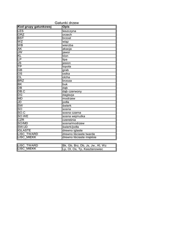 Gatunki drzew Kod grupy gatunkowej LES ORZ BST WZ WB AK JW KL LP JS TP GB OS OL BRZ BK DB DB.C DG MD JD SW SO SO.C SO.WE CZR SO/MD SW/JD IGLASTE LISC_TWARD LISC_MIEKK Opis leszczyna orzech brzost wiąz wierzba akacja jawor klon lipa jesion topola grab osika olcha brzoza buk dąb dąb czerwony daglezja modrzew jodła świerk sosna sosna czarna sosna wejmutka czereśnia sosna/modrzew świerk/jodła drewno iglaste drewno liściaste twarde drewno liściaste miękkie LISC_TWARD LISC_MIEKK Bk, Gb, Brz, Db, Js, Jw., Kl, Wz Lp, Ol, Os, Tp, Kasztanowiec