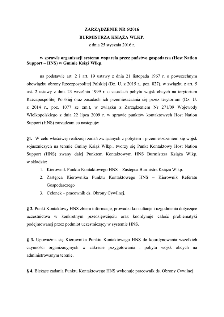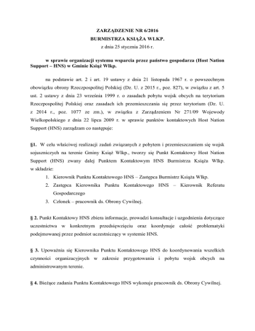 ZARZĄDZENIE NR 6/2016 BURMISTRZA KSIĄŻA WLKP. z dnia 25 stycznia 2016 r. w sprawie organizacji systemu wsparcia przez państwo gospodarza (Host Nation Support – HNS) w Gminie Książ Wlkp. na podstawie art. 2 i art. 19 ustawy z dnia 21 listopada 1967 r. o powszechnym obowiązku obrony Rzeczpospolitej Polskiej (Dz. U. z 2015 r., poz. 827), w związku z art. 5 ust. 2 ustawy z dnia 23 września 1999 r. o zasadach pobytu wojsk obcych na terytorium Rzeczpospolitej Polskiej oraz zasadach ich przemieszczania się przez terytorium (Dz. U. z 2014 r., poz. 1077 ze zm.), w związku z Zarządzeniem Nr 271/09 Wojewody Wielkopolskiego z dnia 22 lipca 2009 r. w sprawie punktów kontaktowych Host Nation Support (HNS) zarządzam co następuje: §1. W celu właściwej realizacji zadań związanych z pobytem i przemieszczaniem się wojsk sojuszniczych na terenie Gminy Książ Wlkp., tworzy się Punkt Kontaktowy Host Nation Support (HNS) zwany dalej Punktem Kontaktowym HNS Burmistrza Książa Wlkp. w składzie: 1. Kierownik Punktu Kontaktowego HNS – Zastępca Burmistrz Książa Wlkp. 2. Zastępca Kierownika Punktu Kontaktowego HNS – Kierownik Referatu Gospodarczego 3. Członek – pracownik ds. Obrony Cywilnej. § 2. Punkt Kontaktowy HNS zbiera informacje, prowadzi konsultacje i uzgodnienia dotyczące uczestnictwa w konkretnym przedsięwzięciu oraz koordynuje całość problematyki podejmowanej przez podmiot uczestniczący w systemie HNS. § 3. Upoważnia się Kierownika Punktu Kontaktowego HNS do koordynowania wszelkich czynności organizacyjnych w zakresie przygotowania i pobytu wojsk obcych na administrowanym terenie. § 4. Bieżące zadania Punktu Kontaktowego HNS wykonuje pracownik ds. Obrony Cywilnej. §5. Dla zapewnienia operatywnego kierowania całokształtem zadań wynikających z obowiązków państwa – gospodarza, wprowadza się do użytku: 1) Instrukcję Punktu Kontaktowego HNS Burmistrza Książa Wlkp. stanowiącą załącznik do zarządzenia. § 6. Zarządzenie wchodzi w życie z dniem podpisania. Załącznik do zarządzenia Nr 6/2016 Burmistrza Książa Wlkp. z dnia 25 stycznia 2016 r. Instrukcja Punktu Kontaktowego HNS 1. Niniejsza instrukcja została opracowana w celu sprawnego przygotowania i uruchomienia działalności Punktu Kontaktowego HNS Burmistrza Książ Wlkp. 2. Podstawowe przepisy normujące zasady pobytu i przemieszczania się wojsk sojuszniczych to: 1) umowa między Państwami – Stronami Traktatu Północnoatlantyckiego, dotycząca statusu ich sił zbrojnych, sporządzona w Londynie dnia 19 czerwca 1951 r. (Dz. U.z 2000 r. Nr 21, poz. 257 z późn. zm.); 2) umowa między Państwami – Stronami Traktatu Północnoatlantyckiego a innymi państwami uczestniczącymi w Partnerstwie dla Pokoju, dotycząca statusu ich sił zbrojnych, oraz jej Protokół dodatkowy, sporządzone w Brukseli dnia 19 czerwca 1995 r. (Dz. U. z 1998r. Nr 97, poz. 605 z późń. zm.); 3) ustawa z dnia 23 września 1999 r. o zasadach pobytu wojsk obcych na terytorium Rzeczypospolitej Polskiej oraz zasadach ich przemieszczania się przez to terytorium (Dz. U. 2014 poz. 1077 z późń. zm.) 4) ustawa z dnia 21 listopada 1967 r. o powszechnym obowiązku obrony Rzeczypospolitej Polskiej (Dz.U. z 2015r. , poz. 827) 5) rozporządzenie Ministra Zdrowia z dnia 11 sierpnia 2005 r. w sprawie szczegółowych warunków i trybu ponoszenia i regulowania opłat za świadczenia zdrowotne udzielane żołnierzom wojsk obcych i ich personelowi cywilnemu (Dz. U. z 2005 r. Nr 160, poz. 1357 z późn. zm.); 6) rozporządzenie Ministra Obrony Narodowej z dnia 14 grudnia 2004 r. w sprawie Komisji do rozpatrywania roszczeń z tytułu szkód wyrządzonych przez wojska obce (Dz. U.2015 poz. 256 z późn. zm) 7) rozporządzenie Ministra Finansów z dnia 22 grudnia 2011 r. w sprawie przypadków i trybu zwrotu podatku od towarów i usług siłom zbrojnym, wielonarodowym kwaterom i dowództwom oraz ich personelowi cywilnemu (Dz. U. z 2015r., poz.72 z późn. zm). 3. Do zadań Punktu Kontaktowego HNS należy: 1) koordynowanie prac w zakresie przygotowania i udzielania wsparcia wojskom sojuszniczym w celu skoordynowania planowanego pobytu i przemieszczenia określonych jednostek wojsk sojuszniczych na terenie Gminy Książ Wlkp.; 2) współdziałanie z osobami odpowiedzialnymi za funkcjonowanie punktów kontaktowych HNS, wojewody, powiatu śremskiego, sąsiednich gmin oraz utworzonych w innych jednostkach organizacyjnych na terenie Gminy Książ Wlkp.; 3) współdziałanie z Wojewodą Wielkopolskim w celu skoordynowania planowanego pobytu i przemieszczenia określonych jednostek wojsk sojuszniczych na terenie Gminy Książ Wlkp.; 4) współdziałanie z przedstawicielami wojsk sojuszniczych przebywających na terenie Gminy Książ Wlkp. lub przemieszczających się przez ten teren; 5) przekazywanie decyzji, poleceń i wniosków w ramach realizacji zadań wsparcia; 6) przyjmowanie informacji o uruchomieniu zadań operacyjnych HNS; 7) organizowanie współdziałania z sąsiednimi jednostkami administracji samorządowej; 8) wymiana danych teleadresowych z punktami kontaktowymi HNS rozmieszczonymi na terenie Gminy Książ Wlkp. oraz z sąsiednimi powiatami i gminami; 9) informowanie społeczności Gminy Książ Wlkp. o pobycie wojsk własnych oraz sojuszniczych; 10) uzgadnianie działania gminnych jednostek organizacyjnych; 11) udostępnianie miejsc postojów i odpoczynku; 12) pomoc w osłonie technicznej kolumn, ochronie przeciwpożarowej, ochronie środowiska i oszacowaniu strat i szkód. 4.Wykaz osób upoważnionych do pracy w ramach Punktu Kontaktowego HNS: Nazwa stanowiska służbowego Kierujący Punktem Kontaktowym HNS Zastępca Kierującego Członek Punktu Punktu Kontaktowego HNS Kontaktowego HNS Imię i nazwisko Mirela Grześkowiak Grzegorz Rabczewski Krzysztof Korasiak Nr telefonu 61 28 22 001 609 300 632 61 28 22 001 698 676 085 61 28 22 001 722 323 308 Nr faxu 61 28 22 724 61 28 22 724 61 28 22 724 Załącznik do instrukc