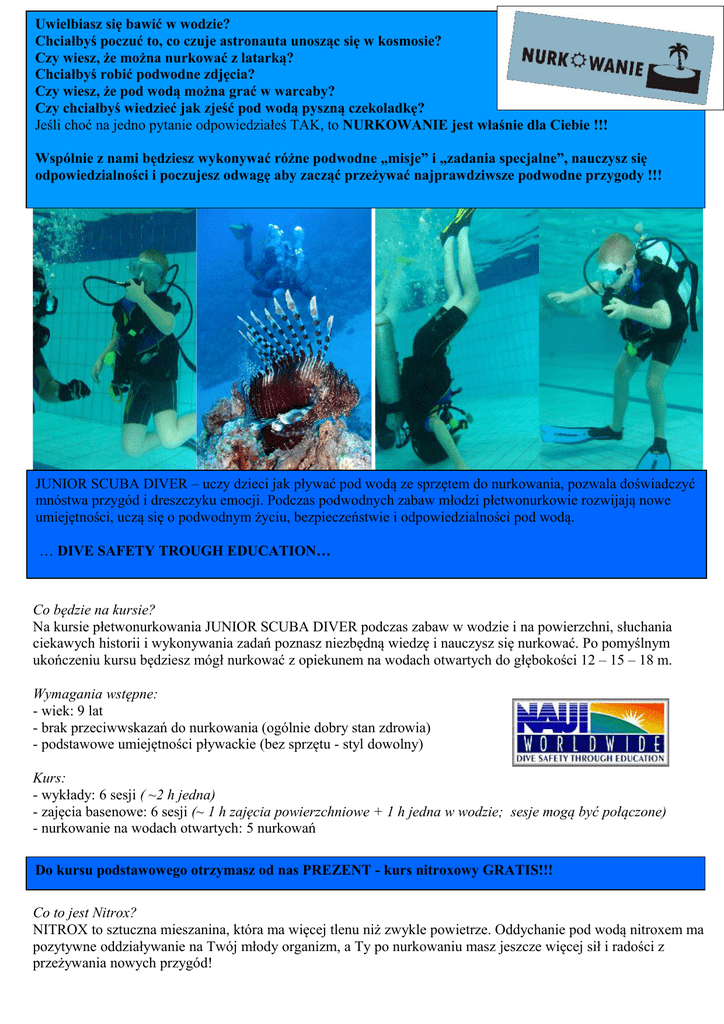 Uwielbiasz się bawić w wodzie? Chciałbyś poczuć to, co czuje astronauta unosząc się w kosmosie? Czy wiesz, że można nurkować z latarką? Chciałbyś robić podwodne zdjęcia? Czy wiesz, że pod wodą można grać w warcaby? Czy chciałbyś wiedzieć jak zjeść pod wodą pyszną czekoladkę? Jeśli choć na jedno pytanie odpowiedziałeś TAK, to NURKOWANIE jest właśnie dla Ciebie !!! Wspólnie z nami będziesz wykonywać różne podwodne „misje” i „zadania specjalne”, nauczysz się odpowiedzialności i poczujesz odwagę aby zacząć przeżywać najprawdziwsze podwodne przygody !!! JUNIOR SCUBA DIVER – uczy dzieci jak pływać pod wodą ze sprzętem do nurkowania, pozwala doświadczyć mnóstwa przygód i dreszczyku emocji. Podczas podwodnych zabaw młodzi płetwonurkowie rozwijają nowe umiejętności, uczą się o podwodnym życiu, bezpieczeństwie i odpowiedzialności pod wodą. … DIVE SAFETY TROUGH EDUCATION… Co będzie na kursie? Na kursie płetwonurkowania JUNIOR SCUBA DIVER podczas zabaw w wodzie i na powierzchni, słuchania ciekawych historii i wykonywania zadań poznasz niezbędną wiedzę i nauczysz się nurkować. Po pomyślnym ukończeniu kursu będziesz mógł nurkować z opiekunem na wodach otwartych do głębokości 12 – 15 – 18 m. Wymagania wstępne: - wiek: 9 lat - brak przeciwwskazań do nurkowania (ogólnie dobry stan zdrowia) - podstawowe umiejętności pływackie (bez sprzętu - styl dowolny) Kurs: - wykłady: 6 sesji ( ~2 h jedna) - zajęcia basenowe: 6 sesji (~ 1 h zajęcia powierzchniowe + 1 h jedna w wodzie; sesje mogą być połączone) - nurkowanie na wodach otwartych: 5 nurkowań Do kursu podstawowego otrzymasz od nas PREZENT - kurs nitroxowy GRATIS!!! Co to jest Nitrox? NITROX to sztuczna mieszanina, która ma więcej tlenu niż zwykle powietrze. Oddychanie pod wodą nitroxem ma pozytywne oddziaływanie na Twój młody organizm, a Ty po nurkowaniu masz jeszcze więcej sił i radości z przeżywania nowych przygód! Wykłady: na nich dowiesz się na ile wystarcza butla na plecach, dlaczego nie oddychamy tlenem, co dzieje się z Twoim organizmem pod wodą, dlaczego możesz poczuć się tak jak w kosmosie, dlaczego ryby są Twoimi przyjaciółmi, jak chronić środowisko, jak nurkować bezpiecznie, dlaczego nurkowanie jest tak wciągające, w co można bawić się pod wodą i …. wielu innych ciekawych rzeczy !!! Baseny: poznasz ważne i przydatne umiejętności, które sprawią, że pod wodą poczujesz się bezpiecznie i komfortowo. W przyjaznych warunkach nauczysz się podstaw nurkowania i ratownictwa. Oswoisz się z przebywaniem w podwodnym świecie i przygotujesz się do nurkowań w wodach otwartych… Wody otwarte: ponownie odkryjesz radość z przebywania pod wodą. Oprócz powtórzenia ćwiczeń, które wykonywałeś już na basenie - nauczysz się prawdziwego nurkowania. Pooglądasz podwodny świat, zmierzysz się z planowaniem nurkowania i rozwiązywaniem sytuacji awaryjnych. Poczujesz smak prawdziwej przygody! Część praktyczną możesz dokończyć w Polsce (jeziora, kamieniołomy) lub w pachnącej piniami Chorwacji (latem) czy urzekającym soczystymi kolorami Morzu Czerwonym w Egipcie (przez cały rok)… Cena: 1450 pln zawiera: szkolenie, materiały kursanta, tabele nurkowe, logbook, wypożyczenie kompletnego sprzętu na czas kursu, wstęp na basen; nie zawiera: certyfikatu (150 pln) i kosztów wyjazdu na wody otwarte. Minimalna grupa: 3 osoby. Tryb indywidualny: 2500 pln MOŻLIWOŚĆ PŁATNOŚCI NA RATY kontakt: [email protected] + 48 501 013 413 pozdrawiamy serdecznie Margita Ślizowska „Syrenka” & Xdivers Team