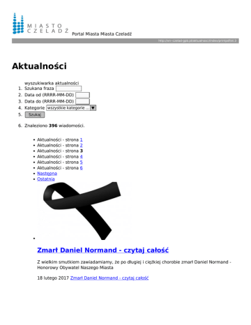 Portal Miasta Miasta Czeladź http://xn--czelad-gpb.pl/aktualnosci/index/printpdf/st:3 Aktualności wyszukiwarka aktualności 1. Szukana fraza 2. Data od (RRRR-MM-DD) 3. Data do (RRRR-MM-DD) 4. Kategorie wszystkie kategorie ... ▼ 5. Szukaj 6. Znaleziono 396 wiadomości. Aktualności - strona 1 Aktualności - strona 2 Aktualności - strona 3 Aktualności - strona 4 Aktualności - strona 5 Aktualności - strona 6 Następna Ostatnia Zmarł Daniel Normand - czytaj całość Z wielkim smutkiem zawiadamiamy, że po długiej i ciężkiej chorobie zmarł Daniel Normand Honorowy Obywatel Naszego Miasta 18 lutego 2017 Zmarł Daniel Normand - czytaj całość III Turniej Grand Prix Czeladzi w Badmintonie - czytaj całość Miejski Szkolny Związek Sportowy zaprasza mieszkańców w niedzielę 19 lutego na III Turniej Grand Prix Czeladzi w Badmintonie. 17 lutego 2017 III Turniej Grand Prix Czeladzi w Badmintonie - czytaj całość "Muzyczna randka z Jackiem Kawalcem" w Kopalni Kultury - czytaj całość Wyjątkowo romantyczny nastrój zagościł w Kopalni Kultury. Wszystko za sprawą Walentynek, dzięki którym sceną zawładnęła miłość w niemal wszystkich odcieniach czerwieni. 16 lutego 2017 "Muzyczna randka z Jackiem Kawalcem" w Kopalni Kultury - czytaj całość Jak się żyje w Czeladzi? - czytaj całość 22 lutego 2017 roku o godzinie 16.30 w Kopalni Kultury przy ul. Trznadla 1 odbędzie się spotkanie pod hasłem: „Jak się żyje w Czeladzi?”. 15 lutego 2017 Jak się żyje w Czeladzi? - czytaj całość Uwaga smog! - czytaj całość Jak podaje Wojewódzki Inspektorat Ochrony Środowiska w Katowicach w środę 15 lutego i czwartek 16 lutego jakość powietrza w województwie śląskim będzie bardzo zła. 15 lutego 2017 Uwaga smog! - czytaj całość Bilety są jeszcze dostępne! - czytaj całość Muzyczne Randka z Jackiem Kawalcem to dobry pomysł na walentynkowy wieczór. Kopalnia Kultury dysponuje jeszcze biletami na to wydarzenie. 14 lutego 2017 Bilety są jeszcze dostępne! - czytaj całość Każde dziecko - duże, małe - lubi bale w karnawale! - czytaj całość W niedzielne przedpołudnie, 12 lutego w Muzeum Saturn odbyło się pierwsze w tym roku i długo oczekiwane spotkanie sympatyków Muzealnego Klubu Juniora. 14 lutego 2017 Każde dziecko - duże, małe - lubi bale w karnawale! - czytaj całość Jak chronić się przed ptasią grypą - czytaj całość Zachęcamy do zapoznanie się z broszurami informacyjnymi, które przedstawiają najważniejsze zasady ochrony przed ptasią grypą. 13 lutego 2017 Jak chronić się przed ptasią grypą - czytaj całość Ostatnie pożegnanie śp. Krystyny Górnej - czytaj całość Z głębokim żalem zawiadamiamy, że dnia 10 lutego 2017 r. odeszła śp. Krystyna Górna. Wieloletnia ceniona nauczycielka historii czeladzkich szkół - Szkoły Podstawowej nr 2 oraz Gimnazjum nr 1. Oddany pracownik merytoryczny Muzeum Saturn. 13 lutego 2017 Ostatnie pożegnanie śp. Krystyny Górnej - czytaj całość Zimowe zajęcia dla dzieci - czytaj całość Miejska Biblioteka Publiczna serdecznie zaprasza dzieci w wieku 4-8 lat na kolejne zajęcia z cyklu Czytanki-niespodzianki pt. Zima u Królowej Śniegu. 09 lutego 2017 Zimowe zajęcia dla dzieci - czytaj całość Aktualności - strona 1 Aktualności - strona 2 Aktualności - strona 3 Aktualności - strona 4 Aktualności - strona 5 Aktualności - strona 6 Następna Ostatnia