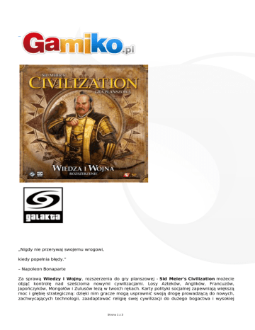 „Nigdy nie przerywaj swojemu wrogowi, kiedy popełnia błędy.” – Napoleon Bonaparte Za sprawą Wiedzy i Wojny, rozszerzenia do gry planszowej - Sid Meier's Civilization możecie objąć kontrolę nad sześcioma nowymi cywilizacjami. Losy Azteków, Anglików, Francuzów, Japończyków, Mongołów i Zulusów lezą w twoich rękach. Karty polityki socjalnej zapewniają większą moc i głębię strategiczną: dzięki nim gracze mogą usprawnić swoją drogę prowadzącą do nowych, zachwycających technologii, zaadaptować religię swej cywilizacji do dużego bogactwa i wysokiej Strona 1 z 3 kultury czy też poprowadzić agresywną ekspansję popartą tradycją militarną. Niezależnie od obranej ścieżki, konflikt będzie nieunikniony, a nowy system walki sprawia, że bitwy są bardziej taktyczne i zapewniają jeszcze więcej emocji. Rozszerzenie to wprowadza także nowe kafelki mapy, zabytki, nowy rodzaj budynków oraz wiele innych elementów. Zawartość pudełka: instrukcja 6 arkuszy cywilizacji 2 znaczniki zabytków 6 domowych kafelków mapy 6 wskaźników ekonomii 6 wskaźników wymiany handlowej 5 znaczników chatek 6 plastikowych łączników 6 neutralnych kafelków mapy 5 znaczników wiosek 6 znaczników cudów świata 6 znaczników poziomu kultury 5 znaczników państw-miast 5 znaczników Stoczni 7 znaczników programu budowy 94 małe karty 55 kwadratowe karty nakładka na planszę rynku Uwaga! To nie jest samodzielna gra. Do rozgrywki wymagana jest gra planszowa - Sid Meier’s Civilization. Wiek 13+ Liczba graczy 2-4 graczy Czas gry ok. 3 godzin Instrukcja Strona 2 z 3 polska Wydanie polskie Wydawca Galakta Strona 3 z 3
