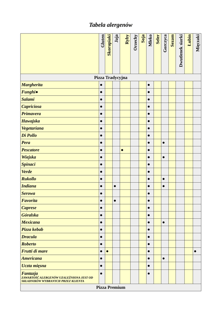 Mięczaki Łubin Dwutlenek siarki Sezam Gorczyca Seler Mleko Soja Orzechy Ryby Jaja Gluten Skorupiaki Tabela alergenów Pizza Tradycyjna Margherita ● ● Funghi● ● ● Salami ● ● Capriciosa ● ● Primavera ● ● Hawajska ● ● Vegetariana ● ● Di Pollo ● ● Pera ● ● Pescatore ● Wiejska ● ● Spinaci ● ● Verde ● ● Rukollo ● ● ● Indiana ● ● ● Serowa ● Favorita ● Caprese ● ● Góralska ● ● Mexicana ● ● Pizza kebab ● ● Dracula ● ● Roberto ● ● Frutti di mare ● ● ● Americana ● ● Uczta mięsna ● ● Fantazja ● ● ● ● ● ● ● ● ● ZAWARTOŚĆ ALERGENÓW UZALEŻNIONA JEST OD SKŁADNIKÓW WYBRANYCH PRZEZ KLIENTA Pizza Premium ● ● ● ● Tri colore ● ● Di carne ● ● Pronto ● ● Siciliana ● ● Nachos muchachos ● ● Kwadratowy zawrót głowy ● ● ● Pizza sezonowa Kwadratowe Calzone Wegetariańskie ● ● Kwadratowe Calzone Mięsne ● ● Makarony Carbonara ● ● ● Bolognese ● ● ● Pene Basil ● ● ● Fungi Creme ● ● ● Aglio Olio ● ● ● Spinaci ● ● ● Sałatki Grecka ● Cesar ● Pesco ● ● ● ● ● Lunche dnia Zupa ● Kotlet schabowy ● ● ● Grillowany filet z kurczaka Shoarma ● Filet z mintaja zapiekany z serem mozzarella ● ● ● Filet premium ● ● ● Frytki Ziemniaki opiekane ● Mięczaki Łubin Dwutlenek siarki Sezam Gorczyca Seler Mleko Soja Orzechy Ryby Jaja Gluten Skorupiaki Tabela alergenów Frytki belgijskie Pieczywo czosnkowe z serem ● Nachos + sos salsa ● ● ● Napoje Cola/Pepsi Sok Woda mineralna Sosy Keczup Czosnkowy ● Pomidorowy Piekielnie ostry SAMBAL ● Salsa ● BBQ ● Mięczaki Łubin Dwutlenek siarki Sezam Gorczyca Seler Mleko Soja Orzechy Ryby Jaja Gluten Skorupiaki Tabela alergenów