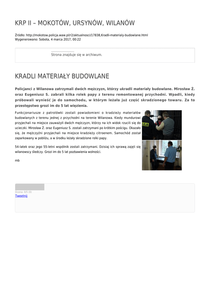KRP II – MOKOTÓW, URSYNÓW, WILANÓW Źródło: http://mokotow.policja.waw.pl/r2/aktualnosci/17838,Kradli-materialy-budowlane.html Wygenerowano: Sobota, 4 marca 2017, 00:22 Strona znajduje się w archiwum. KRADLI MATERIAŁY BUDOWLANE Policjanci z Wilanowa zatrzymali dwóch mężczyzn, którzy ukradli materiały budowlane. Mirosław Ż. oraz Eugeniusz S. zabrali kilka rolek papy z terenu remontowanej przychodni. Wpadli, kiedy próbowali wynieść je do samochodu, w którym leżała już część skradzionego towaru. Za to przestępstwo grozi im do 5 lat więzienia. Funkcjonariusze z patrolówki zostali powiadomieni o kradzieży materiałów budowlanych z terenu jednej z przychodni na terenie Wilanowa. Kiedy mundurowi przyjechali na miejsce zauważyli dwóch mężczyzn, którzy na ich widok rzucili się do ucieczki. Mirosław Ż. oraz Eugeniusz S. zostali zatrzymani po krótkim pościgu. Okazało się, że mężczyźni przyjechali na miejsce kradzieży citroenem. Samochód został zaparkowany w pobliżu, a w środku leżały skradzione rolki papy. 54-latek oraz jego 55-letni wspólnik zostali zatrzymani. Dzisiaj ich sprawą zajęli się wilanowscy śledczy. Grozi im do 5 lat pozbawienia wolności. mb Ocena: 0/5 (0) Tweetnij