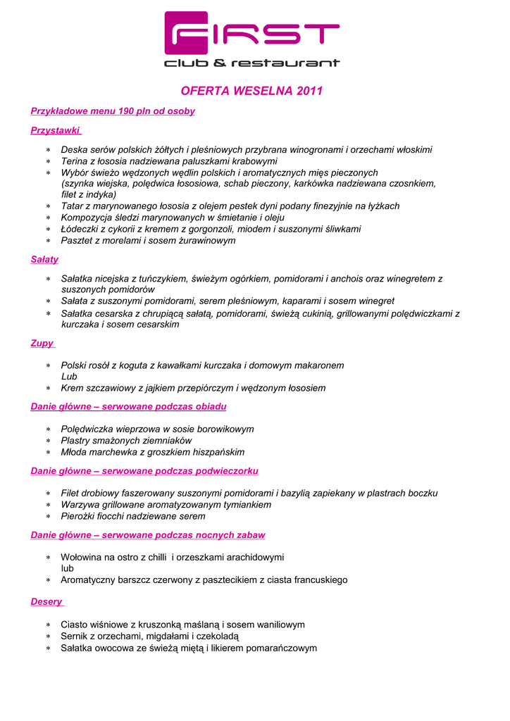 OFERTA WESELNA 2011 Przykładowe menu 190 pln od osoby Przystawki ∗ ∗ ∗ ∗ ∗ ∗ ∗ Deska serów polskich żółtych i pleśniowych przybrana winogronami i orzechami włoskimi Terina z łososia nadziewana paluszkami krabowymi Wybór świeżo wędzonych wędlin polskich i aromatycznych mięs pieczonych (szynka wiejska, polędwica łososiowa, schab pieczony, karkówka nadziewana czosnkiem, filet z indyka) Tatar z marynowanego łososia z olejem pestek dyni podany finezyjnie na łyżkach Kompozycja śledzi marynowanych w śmietanie i oleju Łódeczki z cykorii z kremem z gorgonzoli, miodem i suszonymi śliwkami Pasztet z morelami i sosem żurawinowym Sałaty ∗ ∗ ∗ Sałatka nicejska z tuńczykiem, świeżym ogórkiem, pomidorami i anchois oraz winegretem z suszonych pomidorów Sałata z suszonymi pomidorami, serem pleśniowym, kaparami i sosem winegret Sałatka cesarska z chrupiącą sałatą, pomidorami, świeżą cukinią, grillowanymi polędwiczkami z kurczaka i sosem cesarskim Zupy ∗ ∗ Polski rosół z koguta z kawałkami kurczaka i domowym makaronem Lub Krem szczawiowy z jajkiem przepiórczym i wędzonym łososiem Danie główne – serwowane podczas obiadu ∗ ∗ ∗ Polędwiczka wieprzowa w sosie borowikowym Plastry smażonych ziemniaków Młoda marchewka z groszkiem hiszpańskim Danie główne – serwowane podczas podwieczorku ∗ ∗ ∗ Filet drobiowy faszerowany suszonymi pomidorami i bazylią zapiekany w plastrach boczku Warzywa grillowane aromatyzowanym tymiankiem Pierożki fiocchi nadziewane serem Danie główne – serwowane podczas nocnych zabaw ∗ ∗ Wołowina na ostro z chilli i orzeszkami arachidowymi lub Aromatyczny barszcz czerwony z pasztecikiem z ciasta francuskiego Desery ∗ ∗ ∗ Ciasto wiśniowe z kruszonką maślaną i sosem waniliowym Sernik z orzechami, migdałami i czekoladą Sałatka owocowa ze świeżą miętą i likierem pomarańczowym Pakiet napoi zimnych i gorących w cenie 30pln/os Do ceny pakietu doliczamy 10% Servisu Przykładowe menu 220 pln od osoby Przystawki ∗ ∗ ∗ ∗ ∗ ∗ ∗ Płatki marynowanego tuńczyka z soją i sezamem Tatar wołowy podany z domowymi marynatami oraz chrupiącym paluchem bekonowym, skropiony świeżo wyciskanym olejem z rzepaku Carpaccio z marynowanej polędwicy wołowej w towarzystwie płatków parmezanu, owoców kaparowca i sosu musztardowo-miodowego, posypane świeżą rukolą Delikatesy śródziemnomorskie: szynka parmeńska, delikatna mortadela, polędwica bresaola, coppa di Parma w towarzystwie serów: pecorino, romano, provolone, taleggio, podane ze świeżym melonem, owocami kaparowca i oliwkami marynowanymi w oliwie truflowej Filet z kurczaka faszerowany musem z borowików Ruloniki z wędzonego łososia z kremem serowo-chrzanowym Wybór ryb wędzonych: łosoś, pstrąg, śledź, halibut Pasztet z kaczki ze śliwką podany z sosem żurawinowym Polędwiczka wieprzowa marynowana z sosie teriyaki nadziewana morelami ∗ ∗ ∗ ∗ Sałatka z krewetkami Black Tiger marynowanymi w soku z limonki z papryczkami peperocino Sałata z pikantnymi chrupiącymi wątróbkami z malinami Sałąta z mozzarelli ze smażoną cukinią i pomidorami oraz sosem czosnkowym Sałatka brokułowa z jajkami, pomidorami, szczypiorkiem i sosem majonezowo-jogurtowym ∗ Aromatyczny krem z leśnych grzybów w towarzystwie pęczaku i smażonych rydzów lub Polski rosół z koguta z kawałkami kurczaka i domowym makaronem ∗ ∗ Sałaty Zupa ∗ Danie główne – serwowane podczas obiadu ∗ ∗ ∗ Polędwica wołowa na sosie z suszonych pomidorów z cebulkami cipolini Plastry smażonych ziemniaków Słodkie buraczki z zasmażaną cebulą Danie główne – serwowane podczas podwieczorku ∗ ∗ ∗ Sandacz duszony w sosie polskim Puree ziemniaczane Aromatyczne warzywa gotowane na parze z migdałami Danie główne – serwowane podczas nocnych zabaw ∗ ∗ Doskonały strogonoff z soczystego kurczaka Aromatyczny barszcz czerwony z pasztecikiem z ciasta francuskiego Desery ∗ ∗ ∗ ∗ Desery lodowe z owocami i bitą śmietaną z polewą karmelową z dojrzałej jarzębiny i starego koniaku. Sałatka owocowa ze świeżą miętą i likierem pomarańczowym Ciasto wiśniowe z kruszonką maślaną i sosem waniliowym Sernik z orzechami, migdałami i czekoladą ∗ Mini Brownie z sosem malinowym Pakiet napoi zimnych i gorących w cenie 30pln/os Do ceny pakietu doliczamy 10% Servisu Przykładowe menu 260 pln od osoby Przystawki ∗ ∗ ∗ ∗ ∗ ∗ ∗ ∗ Deska serów polskich żółtych i pleśniowych przybrana winogronami i orzechami włoskimi Terina z łososia nadziewana paluszkami krabowymi Wybór świeżo wędzonych wędlin polskich i aromatycznych mięs pieczonych (szynka wiejska, polędwica łososiowa, schab pieczony, karkówka nadziewana czosnkiem, filet z indyka) Tatar z marynowanego łososia z olejem pestek dyni podany finezyjnie na łyżkach Kompozycja śledzi marynowanych w śmietanie i oleju Łódeczki z cykorii z kremem z gorgonzoli, miodem i suszonymi śliwkami Pasztet z morelami i sosem żurawinowym Delikatesy śródziemnomorskie: szynka parmeńska, delikatna mortadela, polędwica bresaola, coppa di Parma w towarzystwie serów: pecorino, romano, provolone, taleggio, podane ze świeżym melonem, owocami kaparowca i oliwkami marynowanymi w oliwie truflowej Melon zawijany w szynce parmeńskiej Gorgonzola zapiekana w cieniutkich plasterkach szynki ser rano ∗ ∗ Sałaty ∗ Sałatka grecka z sałatą pekińską, fetą, oliwkami, ogórkiem, pomidorami i sosem vinaigrette ∗ Sałata z far fali, tuńczyka, jajek z brokułami i czarnymi oliwkami i domowym winegret ∗ Sałatka nicejska z tuńczykiem, świeżym ogórkiem, pomidorami i anchois oraz winegretem z suszonych pomidorów ∗ Sałata z suszonymi pomidorami, serem pleśniowym, kaparami i sosem winegret ∗ Sałatka cesarska z chrupiącą sałatą, pomidorami, świeżą cukinią, grillowanymi polędwiczkami z kurczaka i sosem cesarskim ∗ Sałatka z k