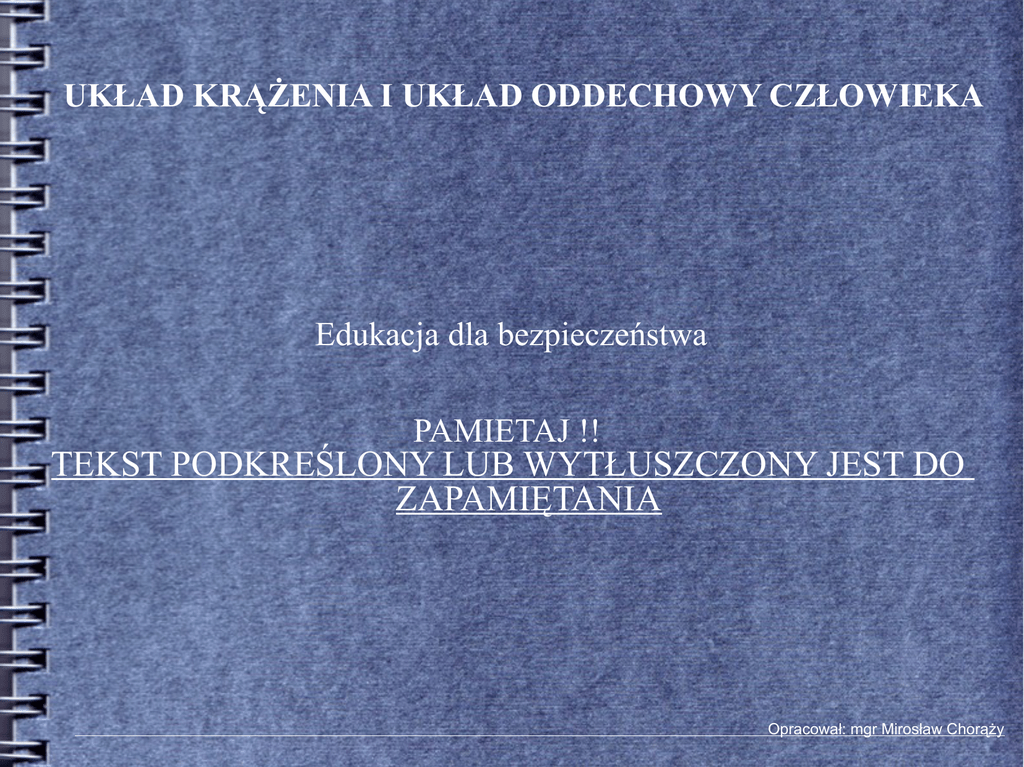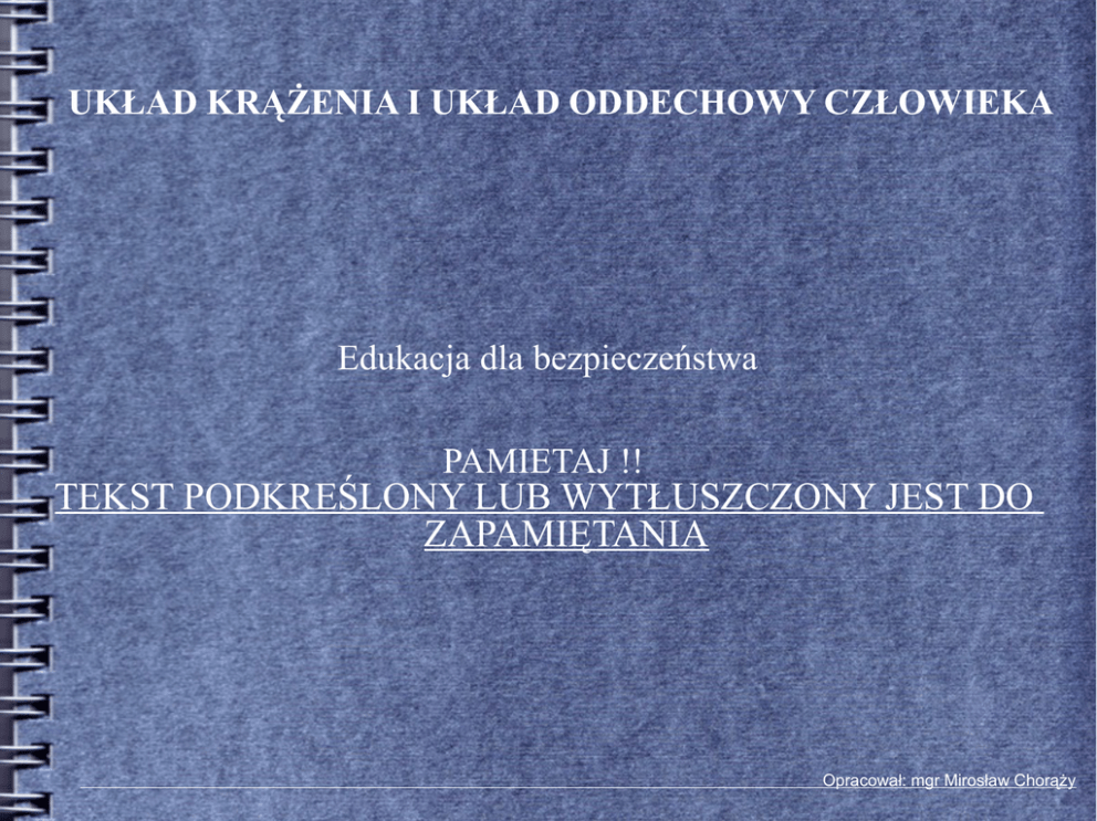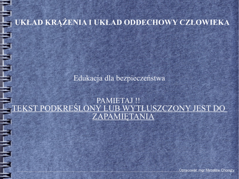 UKŁAD KRĄŻENIA I UKŁAD ODDECHOWY CZŁOWIEKA Edukacja dla bezpieczeństwa PAMIETAJ !! TEKST PODKREŚLONY LUB WYTŁUSZCZONY JEST DO ZAPAMIĘTANIA Opracował: mgr Mirosław Chorąży Układu krążenia to droga, którą płynie krew w organizmie człowieka. Zbudowany jest z zamkniętego systemu naczyń krwionośnych, transportujących nieustannie krew przez organizm, pod wpływem rytmicznych impulsów serca. W skład układu krwionośnego wchodzą: - żyły, - tętnice, - serce, - naczynia włosowate (włośniczki), Funkcje elementów składowych układu krwionośnego: - naczynia włoskowate -wymiennik gazów, substancji odżywczych między krwią, a tkanką, - serce (pompa ssąco – tłocząca), - naczynia krwionośne, drogi rozprowadzające krew, zmieszaną z tlenem, substancjami odżywczymi po organizmie człowieka. Krew, wypływa z serca tętnicami, a wraca żyłami . Im dalej od serca tym ciśnienie krwi jest mniejsze, a w żyłach jest nawet bliskie zeru. Ciśnienie wytwarzane przez pulsowanie serca nie wystarcza do przepchnięcia krwi przez cały krwiobieg z powrotem do serca, zwłaszcza wtedy gdy krew musi przebywać drogę w górę. W trakcie przemieszczania się krwi serce, wspomaga pulsowanie tętnic, wyposażone we własną mięśniówkę. Cofaniu się krwi zapobiegają natomiast znajdujące się w żyłach zastawki. ODDYCHANIE Oddychanie to jeden z najistotniejszych przejawów życia, dlatego jedną z pierwszych rzeczy sprawdzanych np. po wypadku jest zbadanie czy dana osoba jeszcze oddycha. Oddychać, czyli pobierać z atmosfery tlen, a oddawać do niej dwutlenek węgla musi każda żywa istota. Prawie każdy organizm potrzebuje tlenu do pozyskania energii życiowej. ,,Oddychanie zewnętrzne” - wymiana gazowa, tzn. pobieranie ze środowiska tlenu (poprzez narządy oddechowe), rozprowadzanie go po komórkach (dzięki krwi) i jednocześnie odbieranie z nich dwutlenku węgla, w celu usunięcia go na zewnątrz. ,,Oddychanie wewnętrzne” utlenianie częściowo przetworzonego pokarmu, w celu pozyskania energii niezbędnej do życia. UKŁAD ODDECHOWY to system narządów i ich funkcji u człowieka, który w sprawny sposób dostarcza tlen do wszystkich jego tkanek ciała oraz zabiera stamtąd dwutlenek węgla, wydalając go do atmosfery. Elementy układu oddechowego człowieka: - jama nosowa - ustna - gardło - krtań - oskrzela - płuca Pytania kontrolne: 1. Czym jest układ krążenia w organizmie człowieka i w jaki sposób on działa. 2. Wymień co wchodzi w skład budowy układu krążenia (krwionośnego). 3. Co nazywamy naczyniami krwionośnymi u człowieka. 4. Czym jest oddychanie człowieka – opisz własnymi słowami. 5. Wymień elementy składowe układu oddechowego człowieka. Zadanie domowe 1) Wyjaśnij korzystając z Internetu lub innych źródeł co należy rozumieć poprzez sformułowanie: drożne drogi oddechowe. 2) Opisz w trzech zdaniach jakbyś rozpoznał u osoby nieprzytomnej, że ona oddycha ? (skorzystaj w poszukiwaniu z wiedzy zawartej w Internecie).