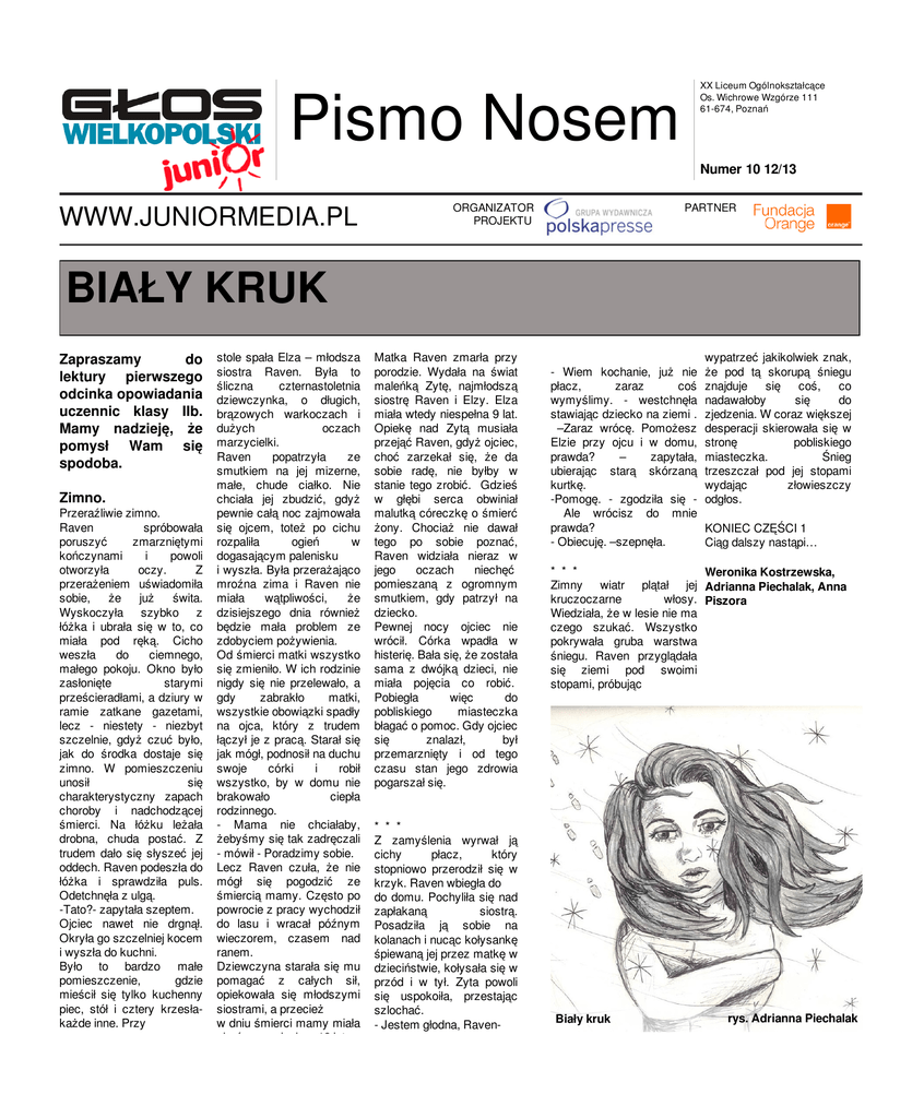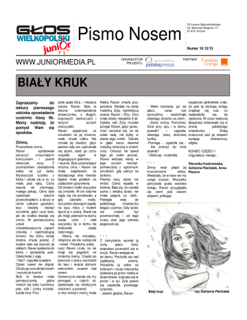 XX Liceum Ogólnokształcące Os. Wichrowe Wzgórze 111 61-674, Poznań Pismo Nosem Numer 10 12/13 WWW.JUNIORMEDIA.PL ORGANIZATOR PROJEKTU PARTNER BIAŁY KRUK Zapraszamy do lektury pierwszego odcinka opowiadania uczennic klasy IIb. Mamy nadzieję, że pomysł Wam się spodoba. Zimno. Przeraźliwie zimno. Raven spróbowała poruszyć zmarzniętymi kończynami i powoli otworzyła oczy. Z przerażeniem uświadomiła sobie, że już świta. Wyskoczyła szybko z łóżka i ubrała się w to, co miała pod ręką. Cicho weszła do ciemnego, małego pokoju. Okno było zasłonięte starymi prześcieradłami, a dziury w ramie zatkane gazetami, lecz - niestety - niezbyt szczelnie, gdyż czuć było, jak do środka dostaje się zimno. W pomieszczeniu unosił się charakterystyczny zapach choroby i nadchodzącej śmierci. Na łóżku leżała drobna, chuda postać. Z trudem dało się słyszeć jej oddech. Raven podeszła do łóżka i sprawdziła puls. Odetchnęła z ulgą. -Tato?- zapytała szeptem. Ojciec nawet nie drgnął. Okryła go szczelniej kocem i wyszła do kuchni. Było to bardzo małe pomieszczenie, gdzie mieścił się tylko kuchenny piec, stół i cztery krzesłakażde inne. Przy stole spała Elza – młodsza siostra Raven. Była to śliczna czternastoletnia dziewczynka, o długich, brązowych warkoczach i dużych oczach marzycielki. Raven popatrzyła ze smutkiem na jej mizerne, małe, chude ciałko. Nie chciała jej zbudzić, gdyż pewnie całą noc zajmowała się ojcem, toteż po cichu rozpaliła ogień w dogasającym palenisku i wyszła. Była przerażająco mroźna zima i Raven nie miała wątpliwości, że dzisiejszego dnia również będzie mała problem ze zdobyciem pożywienia. Od śmierci matki wszystko się zmieniło. W ich rodzinie nigdy się nie przelewało, a gdy zabrakło matki, wszystkie obowiązki spadły na ojca, który z trudem łączył je z pracą. Starał się jak mógł, podnosił na duchu swoje córki i robił wszystko, by w domu nie brakowało ciepła rodzinnego. - Mama nie chciałaby, żebyśmy się tak zadręczali - mówił - Poradzimy sobie. Lecz Raven czuła, że nie mógł się pogodzić ze śmiercią mamy. Często po powrocie z pracy wychodził do lasu i wracał późnym wieczorem, czasem nad ranem. Dziewczyna starała się mu pomagać z całych sił, opiekowała się młodszymi siostrami, a przecież w dniu śmierci mamy miała skończone dopiero 12 lat. Matka Raven zmarła przy porodzie. Wydała na świat maleńką Zytę, najmłodszą siostrę Raven i Elzy. Elza miała wtedy niespełna 9 lat. Opiekę nad Zytą musiała przejąć Raven, gdyż ojciec, choć zarzekał się, że da sobie radę, nie byłby w stanie tego zrobić. Gdzieś w głębi serca obwiniał malutką córeczkę o śmierć żony. Chociaż nie dawał tego po sobie poznać, Raven widziała nieraz w jego oczach niechęć pomieszaną z ogromnym smutkiem, gdy patrzył na dziecko. Pewnej nocy ojciec nie wrócił. Córka wpadła w histerię. Bała się, że została sama z dwójką dzieci, nie miała pojęcia co robić. Pobiegła więc do pobliskiego miasteczka błagać o pomoc. Gdy ojciec się znalazł, był przemarznięty i od tego czasu stan jego zdrowia pogarszał się. * * * Z zamyślenia wyrwał ją cichy płacz, który stopniowo przerodził się w krzyk. Raven wbiegła do do domu. Pochyliła się nad zapłakaną siostrą. Posadziła ją sobie na kolanach i nucąc kołysankę śpiewaną jej przez matkę w dzieciństwie, kołysała się w przód i w tył. Zyta powoli się uspokoiła, przestając szlochać. - Jestem głodna, Ravenwymamrotała próbując powstrzymać się od dalszego płaczu. – Tak - Wiem kochanie, już nie płacz, zaraz coś wymyślimy. - westchnęła stawiając dziecko na ziemi . –Zaraz wrócę. Pomożesz Elzie przy ojcu i w domu, prawda? – zapytała, ubierając starą skórzaną kurtkę. -Pomogę. - zgodziła się Ale wrócisz do mnie prawda? - Obiecuję. –szepnęła. wypatrzeć jakikolwiek znak, że pod tą skorupą śniegu znajduje się coś, co nadawałoby się do zjedzenia. W coraz większej desperacji skierowała się w stronę pobliskiego miasteczka. Śnieg trzeszczał pod jej stopami wydając złowieszczy odgłos. KONIEC CZĘŚCI 1 Ciąg dalszy nastąpi… * * * Weronika Kostrzewska, Zimny wiatr plątał jej Adrianna Piechalak, Anna kruczoczarne włosy. Piszora Wiedziała, że w lesie nie ma czego szukać. Wszystko pokrywała gruba warstwa śniegu. Raven przyglądała się ziemi pod swoimi stopami, próbując Biały kruk rys. Adrianna Piechalak Głos Wielkopolski | Numer 10 12/2013 | Strona 2 www.gloswielkopolski.pl Pismo Nosem WWW.JUNIORMEDIA.PL Solidarne oblicza prawdy ŚWIĄTECZNA PACZKA DLA KOMBATANTÓW NA WSCHODZIE Maciej Antokolski Wywiad z panią prof. M. Bialik W dniu szkolnego wyjścia do kina nie spodziewałem się super produkcji, filmu trzymającego w napięciu, lecz szybkiej reprodukcji zdarzeń, w którą pchnięto stosunkowo - jak na polskie warunki -duże kwoty. Na sali panowała luźna atmosfera sporadycznie zakłócana przez głośniejsze zachowania zadowolonych uczniów. Kamera, akcja start! Zaczęło sie! Już w pierwszych scenach możemy zauważyć genialny warsztat aktorski Roberta Więckiewicza, który wciela się w rolę samego Wałęsy i Marii Rosarii Omaggie, grającej Orianę Fallaci – włoską dziennikarkę, słynącą z nieprzychylnych poglądów względem radzieckiego aparatu władzy. Swoim zachowaniem pokazują wielką klasę, jak i umiejętność mówienia prostym językiem oraz nazywania rzeczy po imieniu. Film ogląda się przyjemnie, nie dłuży się, co chwilę retrospekcje są przerywane często zabawnymi dialogami Włoszki z elektrykiem. Ponadto scenariusz wydaje się być w 100 procentach prawdziwy niczym film czystko dokumentalny, a do tego jego wątki przeplatają się jak w filmie Woody’ego Allena. Tak więc Janusz Głowacki może spodziewać się kolejnych kontraktów na coraz to poważniejsze propozycje, zar
