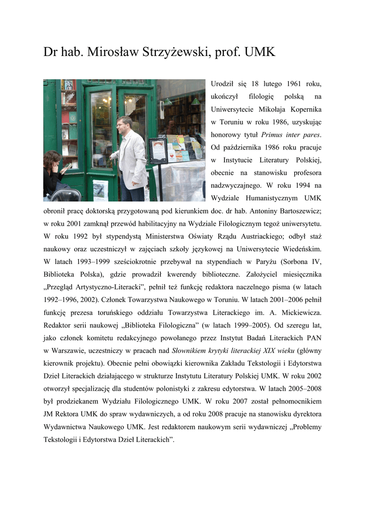 Dr hab. Mirosław Strzyżewski, prof. UMK Urodził się 18 lutego 1961 roku, ukończył filologię polską na Uniwersytecie Mikołaja Kopernika w Toruniu w roku 1986, uzyskując honorowy tytuł Primus inter pares. Od października 1986 roku pracuje w Instytucie Literatury Polskiej, obecnie na stanowisku profesora nadzwyczajnego. W roku 1994 na Wydziale Humanistycznym UMK obronił pracę doktorską przygotowaną pod kierunkiem doc. dr hab. Antoniny Bartoszewicz; w roku 2001 zamknął przewód habilitacyjny na Wydziale Filologicznym tegoż uniwersytetu. W roku 1992 był stypendystą Ministerstwa Oświaty Rządu Austriackiego; odbył staż naukowy oraz uczestniczył w zajęciach szkoły językowej na Uniwersytecie Wiedeńskim. W latach 1993–1999 sześciokrotnie przebywał na stypendiach w Paryżu (Sorbona IV, Biblioteka Polska), gdzie prowadził kwerendy biblioteczne. Założyciel miesięcznika „Przegląd Artystyczno-Literacki”, pełnił też funkcję redaktora naczelnego pisma (w latach 1992–1996, 2002). Członek Towarzystwa Naukowego w Toruniu. W latach 2001–2006 pełnił funkcję prezesa toruńskiego oddziału Towarzystwa Literackiego im. A. Mickiewicza. Redaktor serii naukowej „Biblioteka Filologiczna” (w latach 1999–2005). Od szeregu lat, jako członek komitetu redakcyjnego powołanego przez Instytut Badań Literackich PAN w Warszawie, uczestniczy w pracach nad Słownikiem krytyki literackiej XIX wieku (główny kierownik projektu). Obecnie pełni obowiązki kierownika Zakładu Tekstologii i Edytorstwa Dzieł Literackich działającego w strukturze Instytutu Literatury Polskiej UMK. W roku 2002 otworzył specjalizację dla studentów polonistyki z zakresu edytorstwa. W latach 2005–2008 był prodziekanem Wydziału Filologicznego UMK. W roku 2007 został pełnomocnikiem JM Rektora UMK do spraw wydawniczych, a od roku 2008 pracuje na stanowisku dyrektora Wydawnictwa Naukowego UMK. Jest redaktorem naukowym serii wydawniczej „Problemy Tekstologii i Edytorstwa Dzieł Literackich”. Zainteresowania badawcze: – historia literatury i kultury XIX wieku – historia krytyki literackiej – historia idei i nauki – pogranicza literatury i filozofii oraz literatury i muzyki – krytyka tekstu i edytorstwo naukowe – literatura współczesna Tematyka seminariów magisterskich z lat 2001–2011: − historia literatury okresów: oświecenia, romantyzmu, pozytywizmu, ze szczególnym uwzględnieniem problematyki estetycznej; analiza i interpretacja wybranych tekstów literackich i publicystycznych; − interpretacje literatury polskiej po roku 1956 oraz literatury najnowszej (proza i poezja); − historia krytyki literackiej wszystkich okresów literackich (programy krytyczne, działalność krytyków, język krytyki literackiej); − pogranicza literatury: związki literatury z muzyką, związki literatury z filozofią w XIX i XX wieku (zwłaszcza tematy i wątki muzyczne w utworach literackich); − krytyka literacka wobec literatury współczesnej (krytycznoliteracka recepcja dzieł współczesnych); − edytorstwo i tekstologia (przygotowanie wybranego tekstu literackiego do druku, dzieje tekstu wybranego utworu, analiza porównawcza różnych wydań tego samego dzieła). Tematyka wykładów monograficznych i kursowych z lat 2001–2011: – Literatura a muzyka (semestr zimowy 2001/2002, semestr zimowy i letni 2002/2003, semestr letni 2003/2004); – Wstęp do edytorstwa i tekstologii (semestr zimowy i letni 2001/2002 studia podyplomowe); – Edytorstwo i tekstologia dzieł literackich. Wybrane zagadnienia (semestr zimowy 2002/2003); – Literatura polskiego romantyzmu. Wybrane zagadnienia (semestr zimowy 2001/2002); – Problemy genologiczne polskiego romantyzmu (semestr zimowy 2002/2003); – Biografie romantyków (Podczaszyński, Mochnacki, Mickiewicz) (semestr zimowy 2003/2004); – Gry, pozy i gesty romantyków (semestr zimowy 2004/2005); – Zarys historii edytorstwa polskiego (2003/2004, 2004/2005); − Motywy muzyczne w literaturze epoki romantyzmu (2005/2006); − Wstęp do edytorstwa i tekstologii (2006/2007; 2007/2008 i n); – Arcydzieła romantyków (2007/8 i n.); – Motywy muzyczne w literaturze od starożytności po wiek XIX (2009/2010). Wybrane publikacje książkowe i opracowania autorskie: Działalność krytycznoliteracka Maurycego Mochnackiego, Toruń 1994. Michał Podczaszyński. Zapomniany romantyk, Toruń 1999. Maurycy Mochnacki. Rozprawy literackie, seria BN I nr 297, Wrocław 2000. Mickiewicz wśród krytyków. Studia o przemianach i formach romantycznej krytyki w Polsce, Toruń 2001. Elzenberg i literatura, Toruń 2003. Maurycy Mochnacki, Rozprawy Literackie, wyd. II w serii: „Skarby Biblioteki Narodowej” (pierwotnie: „Biblioteka Narodowa”, seria I nr 297), wyd. Ossolineum, DeAgostini, Wrocław 2004. Romantyczna nieskończoność. Studium identyfikacji pojęcia, Toruń 2010. Romantyczne sfery muzykalne. Literackie konteksty idei „musica instrumentalis”, Toruń 2010. Publikacje najnowsze: Adama Mickiewicza gra z zoilami warszawskimi. (Wokół rozprawy „O krytykach i recenzentach warszawskich”), w: Gra z czytelnikiem. Między konwencją a strategią, pod red. M. Jakitowicz i R. Moczkodana, Toruń 2001 (wyd. 2002), s. 99–124. Zygmunta Krasińskiego „Kilka słów o Juliuszu Słowackim”, w: Zygmunt Krasiński – nowe spojrzenia, pod red. G. Halkiewicz-Sojak i B. Burdzieja, Toruń 2001 (wyd. 2002), s. 409–430. O związkach filozofii z literaturą. Casus Henryka Elzenberga, w: W kręgu folkloru, literatury i języka, pod red. Marii Jakitowicz i Violetty Wróblewskiej, Toruń 2003, s. 331–342. Nowa edycja korespondencji rodzinnej Maurycego i Kamila Mochnackich, w: Z warsztatów badawczych historyków literatury polskiej, Wrocław 2002, pod red. K. Bilińskiego, Wrocław 2004, s. 37–80. Biblioteka romantyka – problem złożony, „Poznańskie Studia Polonistyczne”, Seria Literacka, XI (XXXI): Autokreacje pisarzy i czytelnik