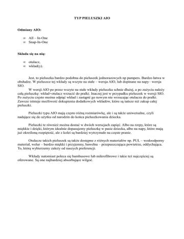 TYP PIELUSZKI AIO Odmiany AIO: • • All – In-One Snap-In-One Składa się na nią: • • otulacz, wkład(y). Jest, to pieluszka bardzo podobna do pieluszek jednorazowych np pampers. Bardzo łatwa w obsłudze. W pieluszce tej wkłady są wszyte na stałe – wersja AIO, lub dopinane na napy– wersja SIO. W wersji AIO po przez wszyte na stałe wkłady pieluszka schnie dłużej, a po zużyciu należy całą pieluszkę: wkład+otulacz wrzucić do pralki. Inaczej jest w przypadku pieluszek w wersji SIO. Po zużyciu często można odpiąć wkład i zastąpić go nowym nie wrzucając otulacza do pralki. Zawsze istnieje możliwość dokupienia dodatkowych wkładów, które są tańsze niż zakup całej pieluszki. Pieluszki typu AIO mają często różną rozmiarówkę, ale i są także uniwersalne, czyli nadające się do użytku od narodzin do końca pieluszkowania dziecka. Pieluszki te również można dostać w dwóch werscjach zapięć. Albo na rzepy, które są miękkie i dzięki, którym idealnie dopasujemy pieluszkę w pasie dziecka, albo na napy, które mają już określoną rozpiętość, ale z kolei są bardziej wytrzymałe na częste pranie. Otulacze takich pieluszek są także dostępne z różnych materiałów np. PUL – wodoodporny materiał, welur – bardzo miękki i przyjemny, bawełna – przepuszczająca powietrze, oddychająca. To, którą wybierzemy zależy od naszych preferencji. Wkłady natomiast poleca się bambusowe lub mikrofibrowe i takie też najczęściej są oferowane. Są one najbardziej absorbujące wilgoć.