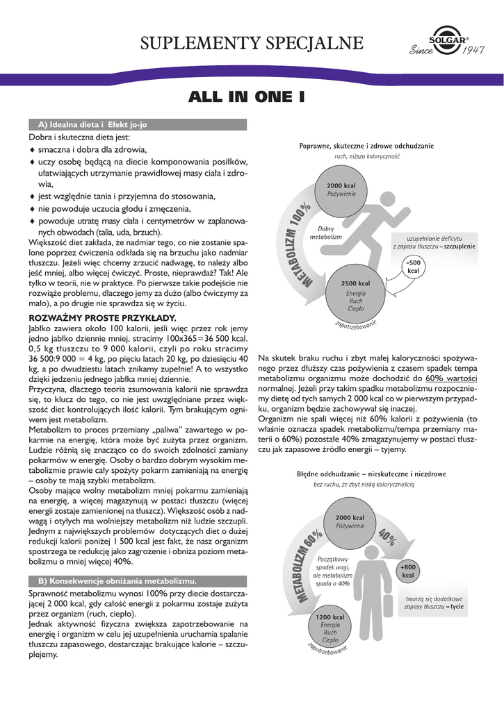 SUPLEMENTY SPECJALNE ALL IN ONE I A) Idealna dieta i Efekt jo-jo Dobra i skuteczna dieta jest: ♦♦smaczna i dobra dla zdrowia, ♦♦uczy osobę będącą na diecie komponowania posiłków, ułatwiających utrzymanie prawidłowej masy ciała i zdrowia, ♦♦jest względnie tania i przyjemna do stosowania, ♦♦nie powoduje uczucia głodu i zmęczenia, ♦♦ powoduje utratę masy ciała i centymetrów w zaplanowanych obwodach (talia, uda, brzuch). Większość diet zakłada, że nadmiar tego, co nie zostanie spalone poprzez ćwiczenia odkłada się na brzuchu jako nadmiar tłuszczu. Jeżeli więc chcemy zrzucić nadwagę, to należy albo jeść mniej, albo więcej ćwiczyć. Proste, nieprawdaż? Tak! Ale tylko w teorii, nie w praktyce. Po pierwsze takie podejście nie rozwiąże problemu, dlaczego jemy za dużo (albo ćwiczymy za mało), a po drugie nie sprawdza się w życiu. ROZWAŻMY PROSTE PRZYKŁADY. Jabłko zawiera około 100 kalorii, jeśli więc przez rok jemy jedno jabłko dziennie mniej, stracimy 100x365=36 500 kcal. 0,5 kg tłuszczu to 9 000 kalorii, czyli po roku stracimy 36 500:9 000 = 4 kg, po pięciu latach 20 kg, po dziesięciu 40 kg, a po dwudziestu latach znikamy zupełnie! A to wszystko dzięki jedzeniu jednego jabłka mniej dziennie. Przyczyna, dlaczego teoria zsumowania kalorii nie sprawdza się, to klucz do tego, co nie jest uwzględniane przez większość diet kontrolujących ilość kalorii. Tym brakującym ogniwem jest metabolizm. Metabolizm to proces przemiany „paliwa” zawartego w pokarmie na energię, która może być zużyta przez organizm. Ludzie różnią się znacząco co do swoich zdolności zamiany pokarmów w energię. Osoby o bardzo dobrym wysokim metabolizmie prawie cały spożyty pokarm zamieniają na energię – osoby te mają szybki metabolizm. Osoby mające wolny metabolizm mniej pokarmu zamieniają na energię, a więcej magazynują w postaci tłuszczu (więcej energii zostaje zamienionej na tłuszcz). Większość osób z nadwagą i otyłych ma wolniejszy metabolizm niż ludzie szczupli. Jednym z największych problemów dotyczących diet o dużej redukcji kalorii poniżej 1 500 kcal jest fakt, że nasz organizm spostrzega te redukcję jako zagrożenie i obniża poziom metabolizmu o mniej więcej 40%. B) Konsekwencje obniżania metabolizmu. Sprawność metabolizmu wynosi 100% przy diecie dostarczającej 2 000 kcal, gdy całość energii z pokarmu zostaje zużyta przez organizm (ruch, ciepło). Jednak aktywność fizyczna zwiększa zapotrzebowanie na energię i organizm w celu jej uzupełnienia uruchamia spalanie tłuszczu zapasowego, dostarczając brakujące kalorie – szczuplejemy. Na skutek braku ruchu i zbyt małej kaloryczności spożywanego przez dłuższy czas pożywienia z czasem spadek tempa metabolizmu organizmu może dochodzić do 60% wartości normalnej. Jeżeli przy takim spadku metabolizmu rozpoczniemy dietę od tych samych 2 000 kcal co w pierwszym przypadku, organizm będzie zachowywał się inaczej. Organizm nie spali więcej niż 60% kalorii z pożywienia (to właśnie oznacza spadek metabolizmu/tempa przemiany materii o 60%) pozostałe 40% zmagazynujemy w postaci tłuszczu jak zapasowe źródło energii – tyjemy. SUPLEMENTY SPECJALNE C) Efekt jo-jo Nie można dopuszczać do spadku metabolizmu – pomogą w tym ćwiczenia, właściwa dieta, odpowiednio dobrane składniki pokarmowe w myśl zasady „All in one”. Gdy nie zadbamy o odpowiedni poziom metabolizmu, zadba o nas efekt jo-jo. Efekt jo-jo polega na tym, że im częściej podejmujemy próby odchudzania się, tym bardziej wydłuża się okres, w którym dochodzimy do zaplanowanej wagi, a skraca się okres, w którym następuje powrót do poprzedniej wagi. Przypomina to zasadę działania jo-jo. Tu niezbyt odkrywcza, ale z drugiej strony sensacyjna wiadomość! Efekt jo-jo nie zależy od zastosowanego preparatu na odchudzanie, ale wyłącznie od tempa utrzymywanego metabolizmu (wzajemnej relacji pomiędzy dietą a wysiłkiem). D) Elementy odżywcze. Regulacyjne składniki odżywcze programu „All in one” Grejpfrut Podnosi on odporność, zapobiega miażdżycy, pielęgnuje ściany naczyń krwionośnych, zwiększa przyswajalność wielu witamin, działa przeciwdrożdżakowo i kontroluje apetyt. Badania dowiodły, że skutecznie zwalcza około 800 gatunków bakterii i wirusów i ponad 100 gatunków grzybów. Mechanizm działania polega na niszczeniu przez czynne składniki wyciągu z grejpfruta błony komórkowej i przez to trwale uszkadza łańcuchy oddechowe wielu mikroorganizmów chorobotwórczych. Wyciąg z grejpfruta zwalcza bakterie Helicobacter pylori towarzyszącym wrzodom żołądka i dwunastnicy. Stosowany jest w typowych infekcjach układu oddechowego (bakteryjnych i wirusowych). Działa również bardzo dobrze na drożdże z gatunku Candida albicans. Stosowany w zalecanych dawkach nie osłabia przyjaznej flory bakteryjnej. Duża zawartość bioflawonoidów i witaminy C czyni preparaty z grejpfruta silnymi przeciwutleniaczami. Ocet winny – aktywizacja przemiany materii Znany od tysiącleci ocet winny poprawia formę i utrzymuje w zdrowiu. Ostry aromat octu kojarzy się z pachnącymi ziołami, przypomina zapach szczawiu i mniszka. Przypomina te beztroskie spokojne czasy, kiedy to zmysły reagowały w pierwszej kolejności bardzo intensywnie i pozytywnie na to, co dawała natura. Już po paru dniach spożywania produktów z tym „kwaśnym składnikiem czujemy się lepiej i mamy więcej energii”. Odbiera on w sposób definitywny odczuwalny apetyt na słodycze i zmniejsza łaknienie. Ocet winny stymuluje naszą przemianę materii, co jest bardzo zdrowe nie tylko dla przewodu pokarmowego i trawienia, ale również dodaje energii i wzmacnia cały organizm. Ocet winny pobudza wzmożone wydzielanie śliny (myśl o czymś kwaśnym powoduje ślinotok). W ślinie znajdują się enzymy, które są niezbędne do rozkładu cząstek cukru i skrobi na łatwe 