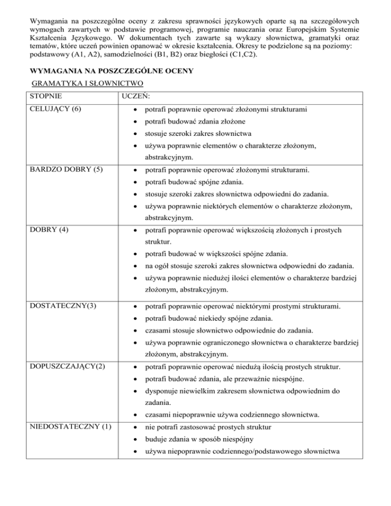Wymagania na poszczególne oceny z zakresu sprawności językowych oparte są na szczegółowych wymogach zawartych w podstawie programowej, programie nauczania oraz Europejskim Systemie Kształcenia Językowego. W dokumentach tych zawarte są wykazy słownictwa, gramatyki oraz tematów, które uczeń powinien opanować w okresie kształcenia. Okresy te podzielone są na poziomy: podstawowy (A1, A2), samodzielności (B1, B2) oraz biegłości (C1,C2). WYMAGANIA NA POSZCZEGÓLNE OCENY GRAMATYKA I SŁOWNICTWO STOPNIE CELUJĄCY (6) UCZEŃ: potrafi poprawnie operować złożonymi strukturami potrafi budować zdania złożone stosuje szeroki zakres słownictwa używa poprawnie elementów o charakterze złożonym, abstrakcyjnym. BARDZO DOBRY (5) potrafi poprawnie operować złożonymi strukturami. potrafi budować spójne zdania. stosuje szeroki zakres słownictwa odpowiedni do zadania. używa poprawnie niektórych elementów o charakterze złożonym, abstrakcyjnym. DOBRY (4) potrafi poprawnie operować większością złożonych i prostych struktur. potrafi budować w większości spójne zdania. na ogół stosuje szeroki zakres słownictwa odpowiedni do zadania. używa poprawnie niedużej ilości elementów o charakterze bardziej złożonym, abstrakcyjnym. DOSTATECZNY(3) potrafi poprawnie operować niektórymi prostymi strukturami. potrafi budować niekiedy spójne zdania. czasami stosuje słownictwo odpowiednie do zadania. używa poprawnie ograniczonego słownictwa o charakterze bardziej złożonym, abstrakcyjnym. DOPUSZCZAJĄCY(2) potrafi poprawnie operować niedużą ilością prostych struktur. potrafi budować zdania, ale przeważnie niespójne. dysponuje niewielkim zakresem słownictwa odpowiednim do zadania. NIEDOSTATECZNY (1) czasami niepoprawnie używa codziennego słownictwa. nie potrafi zastosować prostych struktur buduje zdania w sposób niespójny używa niepoprawnie codziennego/podstawowego słownictwa MÓWIENIE STOPNIE CELUJĄCY (6) BARDZO DOBRY (5) DOBRY (4) UCZEŃ: przekazuje z powodzeniem wiadomość. mówi spójnie, bez wahań. posługuje się poprawnym językiem. dysponuje bogatym zakresem słownictwa dla wyrażania myśli i idei. potrafi w naturalny sposób uczestniczyć w rozmowie/dyskusji. potrafi z powodzeniem przekazać wiadomość. potrafi mówić spójnie bez wahań. posługuje się poprawnym językiem, popełniając niewiele błędów. dysponuje dużym zakresem słownictwa dla wyrażania myśli i idei. umie w naturalny sposób zabierać głos w rozmowie. można go zrozumieć bez trudu. potrafi z powodzeniem przekazać wiadomość. potrafi mówić spójnie z lekkim wahaniem. posługuje się w miarę poprawnym językiem, popełniając niekiedy zauważalne błędy. dysponuje odpowiednim zakresem słownictwa dla wyrażania myśli i idei. umie zazwyczaj w naturalny sposób zabierać głos w rozmowie. można go zazwyczaj zrozumieć. czasem potrafi z powodzeniem przekazać wiadomość. potrafi mówić spójnie, ale z wyraźnym wahaniem. posługuje się częściowo poprawnym językiem, popełniając zauważalne błędy. dysponuje ograniczonym zakresem słownictwa dla wyrażania myśli i idei. czasami umie w naturalny sposób zabierać głos w rozmowie. można go zazwyczaj zrozumieć. czasem potrafi przekazać wiadomość, ale z trudnościami. potrafi czasami mówić spójnie, ale z częstym wahaniem. posługuje się czasami poprawnym językiem, popełniając wiele zauważalnych błędów. dysponuje bardzo ograniczonym zakresem słownictwa dla wyrażania myśli i idei. rzadko próbuje zabierać głos w rozmowie. można go zrozumieć, ale z dużą trudnością. DOSTATECZNY(3) DOPUSZCZAJĄCY(2) NIEDOSTATECZNY (1) nie potrafi przekazać wiadomości. mówi niespójnie. posługuje się niepoprawnym językiem popełniając zauważalne błędy nie zabiera głosu w rozmowie. dysponuje bardzo ograniczonym słownictwem do wyrażania myśli i idei. SŁUCHANIE STOPNIE CELUJĄCY (6) UCZEŃ: potrafi zrozumieć sens różnorodnych tekstów i rozmów. potrafi zrozumieć informacje w różnorodnych tekstach i rozmowach. potrafi wydobyć potrzebne informacje i przekształcić je w formę pisemną. BARDZO DOBRY (5) potrafi rozpoznać uczucia i reakcje mówiącego. potrafi z łatwością rozróżnić dźwięki. potrafi z łatwością zrozumieć polecenia nauczyciela. potrafi zrozumieć ogólny sens różnorodnych tekstów i rozmów. potrafi zrozumieć kluczowe informacje w różnorodnych tekstach i rozmowach. potrafi wydobyć potrzebne informacje i przekształcić je w formę pisemną. DOBRY (4) potrafi rozpoznać uczucia i reakcje mówiącego. potrafi z łatwością rozróżnić dźwięki. potrafi z łatwością zrozumieć polecenia nauczyciela. potrafi zazwyczaj zrozumieć ogólny sens różnorodnych tekstów i rozmów. potrafi zrozumieć większość kluczowych informacji w różnorodnych tekstach i rozmowach. potrafi wydobyć większość potrzebnych informacji i przekształcić je w formę pisemną. DOSTATECZNY(3) potrafi zwykle rozpoznać uczucia i reakcje mówiącego. potrafi rozróżnić dźwięki. potrafi zrozumieć polecenia nauczyciela. potrafi zazwyczaj zrozumieć ogólny sens różnorodnych tekstów i rozmów. potrafi zrozumieć część kluczowych informacji w różnorodnych tekstach i rozmowach. potrafi wydobyć część potrzebnych informacji i przekształcić je w formę pisemną. potrafi czasami rozpoznać uczucia i reakcje mówiącego. potrafi rozróżnić większość dźwięków. potrafi zazwyczaj zrozumieć polecenia nauczyciela. DOPUSZCZAJĄCY(2) potrafi od czasu do czasu zrozumieć ogólny sens różnorodnych tekstów i rozmów. potrafi zrozumieć kilka kluczowych informacji w różnorodnych tekstach i rozmowach. potrafi wydobyć niedużą część potrzebnych informacji i przekształcić je w formę pisemną. rzadko potrafi rozpoznać uczucia i reakcje mówiącego. potrafi rozróżnić niektóre dźwięki. potrafi zazwyczaj zrozumieć polecenia nauczyciela, ale może 