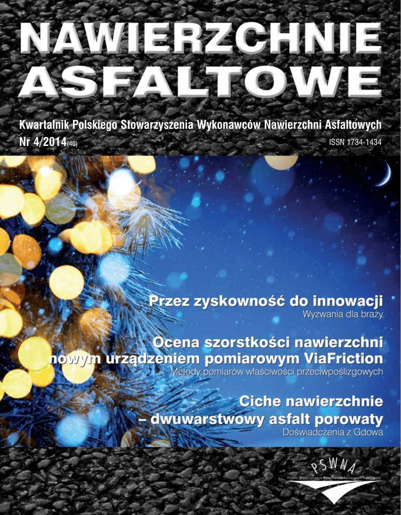 Kwartalnik Polskiego Stowarzyszenia Wykonawców Nawierzchni Asfaltowych ISSN 1734-1434 Nr 4/2014(40) Spis treści NAWIERZCHNIE A S FA LT O W E Kwartalnik Nawierzchnie Asfaltowe nr 4/2014(40) 4 . . . . . . . . . . . . . . . . . . . . . . . . . . . . . . . . . . . . . . . . . . Przez zyskowność do innowacji Rozmowa z Andrzejem Wyszyńskim, prezesem Polskiego Stowarzyszenia Wykonawców Nawierzchni Asfaltowych Polskiego Stowarzyszenia Wykonawców Nawierzchni Asfaltowych ASPHALT PAVEMENTS 6 . . . . . . . . . . . . . . . . . . . . . . . . . . . . Ciche nawierzchnie – dwuwarstwowy asfalt porowaty HALINA SARLIŃSKA Quarterly of the Polish Asphalt Pavements Association 10 . . . . . . . . . . . Ocena szorstkości nawierzchni nowym urządzeniem pomiarowym ViaFriction WACŁAW MICHALSKI, MAREK DANOWSKI 17 . . . . . . . . . . . . . . . . . . . . . . . . . . . . . . . . . . . . . . . . . . . . Doświadczenia i innowacje ANNA KRAWCZYK Z okazji zbliżających się świąt Bożego Narodzenia życzymy Państwu spokoju i zdrowia a w Nowym 2015 roku wszelkiej pomyślności zarząd i pracownicy PSWNA Polskie Stowarzyszenie Wykonawców Nawierzchni Asfaltowych działa od 1999 r., a od 2000 r. jest członkiem EAPA (Europejskiego Stowarzyszenia Nawierzchni Asfaltowych). Celem PSWNA jest promowanie nawierzchni asfaltowych, rozwój technologii nawierzchni podatnych, a także transfer wiedzy i informacji w środowisku drogowym w Polsce. Stowarzyszenie zrzesza osoby prawne i fizyczne zainteresowane rozwojem nawierzchni asfaltowych w Polsce. WYDAWCA Polskie Stowarzyszenie Wykonawców Nawierzchni Asfaltowych Skład zarządu Andrzej Wyszyński, prezes Adam Wojczuk, wiceprezes Tomasz Przeradzki, sekretarz Zbigniew Brzeziński, skarbnik Waldemar Merski, członek zarządu Igor Ruttmar, członek zarządu Zbigniew Krupa, pełnomocnik zarządu REDAKCJA Misja Polskiego Stowarzyszenia Wykonawców Nawierzchni Asfaltowych „Efektywne wspieranie wszelkich działań służących rozwojowi branży drogownictwa w Polsce, a w szczególności propagowanie nowoczesnych technologii, racjonalizacja przepisów prawnych i wytycznych technicznych, działalność edukacyjna i informacyjna”. Czasopismo wspierane finansowo przez: Anna Krawczyk, redaktor naczelna Joanna Reszko-Wróblewska, adiustacja Ewa Popławska, korekta DTP Tadeusz Krupa Zdjęcie na okładce: Fotolia.com Biuro zarządu, adres redakcji Jolanta Szulhaniuk Polskie Stowarzyszenie Wykonawców Nawierzchni Asfaltowych ul. Trojańska 7, 02-261 Warszawa, tel./fax: + 48 22 57 44 374 tel. + 48 22 57 44 352 e-mail: [email protected] www.pswna.pl ISSN 1734-1434 Koniec roku zmusza do podsumo- pracy i partnerskich relacji na budowie. wań i refleksji. Jaki był 2014 dla branży Mam wrażenie, że ten dialog pomiędzy dorgowej? W moim odczuciu był to ko- zamawiającym a wykonawcą ostatnio lejny trudny rok. Trudność ta objawiała jest bardzo cichy, jeśli nie zamiera. Po- się mizerią robót drogowych i oczekiwa- służę się pewnym przykładem. Proszę niem na nową perspektywę unijną. Co sobie wyobrazić położoną dziewiątkę. prawda sytuację uratowały wybory sa- Na jednym jej krańcu stoi jeden czło- morządowe i roboty na tej sieci dróg, wiek i widzi 9, na drugim drugi i widzi 6. ale to wciąż mało. Branża potrzebuje Za nic nie dają się przekonać, że jest kapitału, aby wprowadzać innowacje. Te inaczej. Do czasu, gdy zamienią się są nieuchronnie potrzebne w drogo- miejscami. Czy to tak trudno postawić wnictwie, wobec wymogu coraz to dłu- się na miejscu drugiej strony? Dlaczego ższych gwarancji. Widziałbym kilka kie- tego nie zrobić? W imieniu Polskiego runków rozwoju i do tego zachęcam Stowarzyszenia branże. Po pierwsze w końcu uporanie wierzchni Asfaltowych chciałbym prze- się z problemami, które psują nasz wi- kazać apel do aministracji: jesteśmy go- zerunek, czyli trwałość nawierzchni. towi do rozmów z wami, na wszelkie te- Czas budować je długowieczne, tylko maty, poczynając od technologii a koń- wówczas będziemy w stanie konkuro- cząc na międzynarodowych doświdcze- wać i udowadniać, że asfalt jest najlep- niach firm, które skupiamy, zaproście szy do budowy dróg. Kolejna kwestia to nas tylko do rozmów. Wykonawców Na- recykling. Istnieją już możliwości wyko- Życzę Państwu, aby święta upłynę- rzystania 100% materiałów użytych ły w rodzinnej, pełnej ciepła atmosfe- do konstrukcji nawierzchni drogi. Roz- rze, a Nowy Rok okazał się przełomowy wijajmy te technologie także w Polsce. dla branży drogowej. Następnie – ciche nawierzchnie. Mamy już doskonały przykład budowy obwod- Z życzeniami miłej lektury nicy Gdowa. Jest to też przykład współ- Andrzej Wyszyński www.pswna.pl FOT. PSWNA OD REDAKCJI NAWIERZCHNIE ASFALTOWE FOT. PSWNA Przez zyskowność do innowacji Jakie wyzwania ma przed sobą branża asfaltowa? Podstawowe wyzwanie to problemy dotyczące technologii. W dużej części uporaliśmy się już z tymi zagadnieniami, mamy bardzo du- 4 żo różnych rozwiązań i osiągnięć, natomiast trzeba tę kwestię dokończyć. Pozostały jeszcze do wdrożenia technologie rozwiązujące problemy z koleinowaniem, problemy z długowiecznością oraz technologią napraw. Drugim wy- Branża drogowa potrzebuje nowych technologii, a firmy z branży generowania zysków, które pozwolą na wdrażanie innowacji. O wyzwaniach stojących przed drogowcami z Andrzejem Wyszyńskim, prezesem Polskiego Stowarzyszenia Wykonawców Nawierzchni Asfaltowych, rozmawia Anna Krawczyk. zwaniem są wszystkie techniki związane z recyklingiem, o których w Polsce mówimy już od dłuższego czasu i jest to również pole do popisu dla rodzimych firm. Za granicą szeroko stosuje się już materiały z recyklingu. U nas to do- Nr 4/2014 piero raczkuje i zamawiający wciąż maja obiekcje co do ich stosowania. Dlaczego Pana zdaniem tak się dzieje? Moim zdaniem dzieje się tak z dwóch powodów. Po pierwsze ograniczenia 