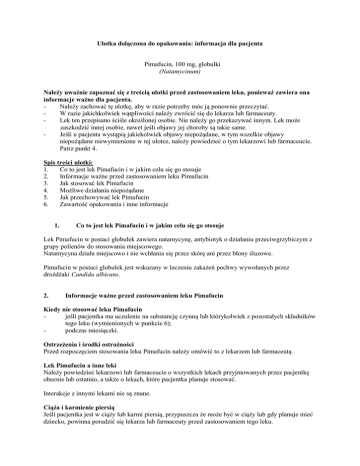 Ulotka dołączona do opakowania: informacja dla pacjenta Pimafucin, 100 mg, globulki (Natamycinum) Należy uważnie zapoznać się z treścią ulotki przed zastosowaniem leku, ponieważ zawiera ona informacje ważne dla pacjenta. Należy zachować tę ulotkę, aby w razie potrzeby móc ją ponownie przeczytać. W razie jakichkolwiek wątpliwości należy zwrócić się do lekarza lub farmaceuty. Lek ten przepisano ściśle określonej osobie. Nie należy go przekazywać innym. Lek może zaszkodzić innej osobie, nawet jeśli objawy jej choroby są takie same. Jeśli u pacjenta wystąpią jakiekolwiek objawy niepożądane, w tym wszelkie objawy niepożądane niewymienione w tej ulotce, należy powiedzieć o tym lekarzowi lub farmaceucie. Patrz punkt 4. Spis treści ulotki: 1. Co to jest lek Pimafucin i w jakim celu się go stosuje 2. Informacje ważne przed zastosowaniem leku Pimafucin 3. Jak stosować lek Pimafucin 4. Możliwe działania niepożądane 5. Jak przechowywać lek Pimafucin 6. Zawartość opakowania i inne informacje 1. Co to jest lek Pimafucin i w jakim celu się go stosuje Lek Pimafucin w postaci globulek zawiera natamycynę, antybiotyk o działaniu przeciwgrzybiczym z grupy polienów do stosowania miejscowego. Natamycyna działa miejscowo i nie wchłania się przez skórę ani przez błony śluzowe. Pimafucin w postaci globulek jest wskazany w leczeniu zakażeń pochwy wywołanych przez drożdżaki Candida albicans. 2. Informacje ważne przed zastosowaniem leku Pimafucin Kiedy nie stosować leku Pimafucin jeśli pacjentka ma uczulenie na substancję czynną lub którykolwiek z pozostałych składników tego leku (wymienionych w punkcie 6); podczas miesiączki. Ostrzeżenia i środki ostrożności Przed rozpoczęciem stosowania leku Pimafucin należy omówić to z lekarzem lub farmaceutą. Lek Pimafucin a inne leki Należy powiedzieć lekarzowi lub farmaceucie o wszystkich lekach przyjmowanych przez pacjentkę obecnie lub ostatnio, a także o lekach, które pacjentka planuje stosować. Interakcje z innymi lekami nie są znane. Ciąża i karmienie piersią Jeśli pacjentka jest w ciąży lub karmi piersią, przypuszcza że może być w ciąży lub gdy planuje mieć dziecko, powinna poradzić się lekarza lub farmaceuty przed zastosowaniem tego leku. Prowadzenie pojazdów i obsługiwanie maszyn Pimafucin nie ma wpływu na zdolność prowadzenia pojazdów i obsługiwania maszyn. 3. Jak stosować lek Pimafucin Ten lek należy zawsze stosować zgodnie z zaleceniami lekarza. W razie wątpliwości należy zwrócić się do lekarza lub farmaceuty. Stosuje się jedną globulkę raz na dobę, na noc. Leczenie trwa od 3 do 6 dni. Globulkę należy umieścić jak najgłębiej w pochwie, najlepiej w pozycji leżącej, przed snem. Zastosowanie większej niż zalecana dawki leku Pimafucin Dotychczas nie stwierdzono przedawkowania leku. Ponieważ natamycyna działa miejscowo i nie wchłania się przez skórę ani błony śluzowe, nawet przypadkowe połknięcie zawartości całego opakowania nie wywołuje zwykle żadnych objawów. W razie jakichkolwiek dalszych wątpliwości związanych ze stosowaniem tego leku należy zwrócić się do lekarza lub farmaceuty. 4. Możliwe działania niepożądane Jak każdy lek, lek ten może powodować działania niepożądane, chociaż nie u każdego one wystąpią. Niekiedy może wystąpić: reakcja nadwrażliwości na substancję pomocniczą - alkohol cetylowy; niewielkie uczucie pieczenia w okolicy narządów płciowych po założeniu globulki. Zgłaszanie działań niepożądanych Jeśli wystąpią jakiekolwiek objawy niepożądane, w tym wszelkie objawy niepożądane niewymienione w ulotce, należy powiedzieć o tym lekarzowi. Działania niepożądane można zgłaszać bezpośrednio do Departamentu Monitorowania Niepożądanych Działań Produktów Leczniczych Urzędu Rejestracji Produktów Leczniczych, Wyrobów Medycznych i Produktów Biobójczych Al. Jerozolimskie 181C PL-02 222 Warszawa Tel.: +48 22 49 21 301 Faks: +48 22 49 21 309 e-mail: [email protected] Dzięki zgłaszaniu działań niepożądanych można będzie zgromadzić więcej informacji na temat bezpieczeństwa stosowania leku. 5. Jak przechowywać lek Pimafucin Lek należy przechowywać w miejscu niewidocznym i niedostępnym dla dzieci. Nie stosować tego leku po upływie terminu ważności zamieszczonego na pudełku i blistrze po: {EXP}. Termin ważności oznacza ostatni dzień podanego miesiąca. Nie przechowywać w temperaturze powyżej 25oC. Leków nie należy wyrzucać do kanalizacji ani domowych pojemników na odpadki. Należy zapytać farmaceutę, jak usunąć leki, których już się nie używa. Takie postępowanie pomoże chronić środowisko. 6. Zawartość opakowania i inne informacje Co zawiera lek Pimafucin - Substancją czynną leku jest natamycyna. Pozostałe składniki to: alkohol cetylowy, tłuszcz stały, sorbitanu trioleinian, polisorbat 80, sodu wodorowęglan, kwas adypinowy. Jak wygląda lek Pimafucin i co zawiera opakowanie Pimafucin to globulki w kolorze od bladożółtego do jasnożółtego. Blister zawiera 3 globulki. Opakowanie zawiera 3 globulki (1 blister) lub 6 globulek (2 blistry). Podmiot odpowiedzialny i wytwórca Podmiot odpowiedzialny: LEO Pharma A/S Industriparken 55 DK-2750 Ballerup Dania Wytwórca: 1. Astellas Pharma Europe B.V. Sylviusweg 62 2333 BE Leiden Holandia 2. Temmler Italia S.R.L. Via Delle Industrie 2 20061 Carugate (MI) Włochy W celu uzyskania bardziej szczegółowych informacji należy zwrócić się do przedstawiciela podmiotu odpowiedzialnego: LEO Pharma Sp. z o.o. Ul. Marynarska 15 02-674 Warszawa Tel: 22 244 18 40 Data ostatniej aktualizacji ulotki : Lipiec 2016