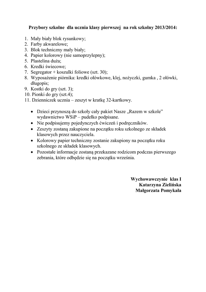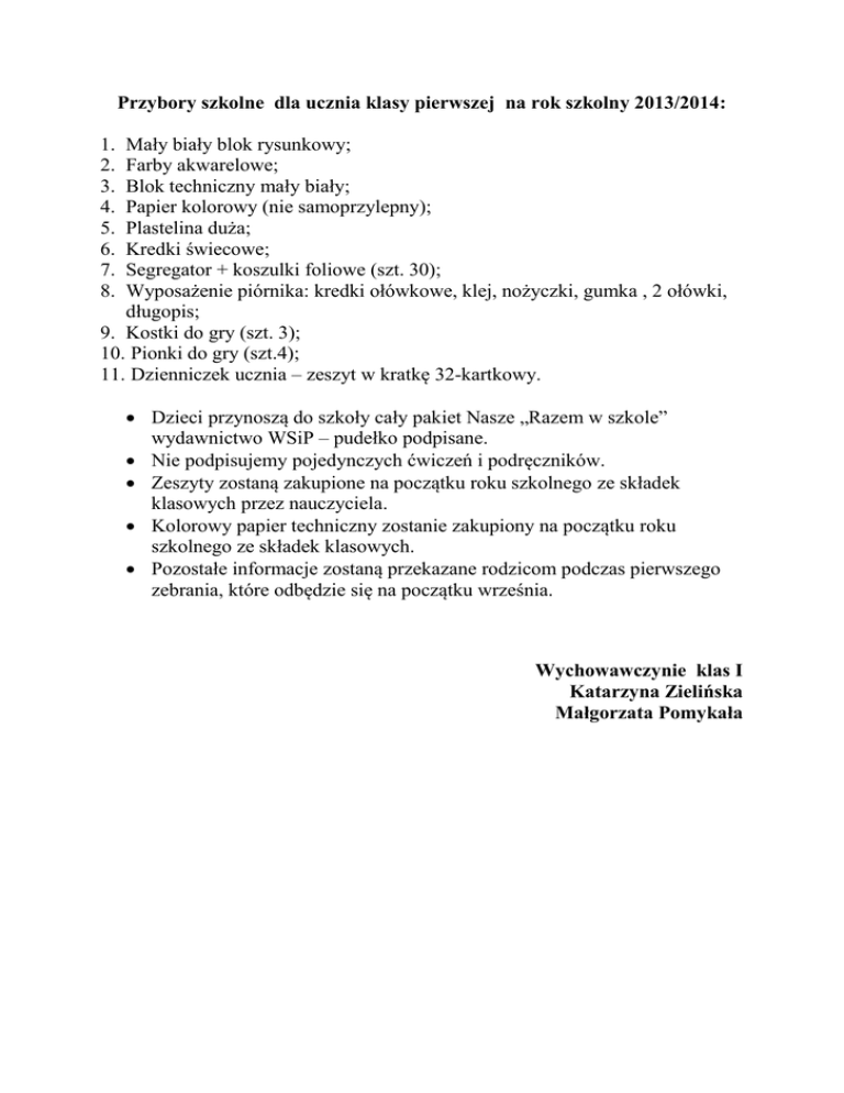 Przybory szkolne dla ucznia klasy pierwszej na rok szkolny 2013/2014: Mały biały blok rysunkowy; Farby akwarelowe; Blok techniczny mały biały; Papier kolorowy (nie samoprzylepny); Plastelina duża; Kredki świecowe; Segregator + koszulki foliowe (szt. 30); Wyposażenie piórnika: kredki ołówkowe, klej, nożyczki, gumka , 2 ołówki, długopis; 9. Kostki do gry (szt. 3); 10. Pionki do gry (szt.4); 11. Dzienniczek ucznia – zeszyt w kratkę 32-kartkowy. 1. 2. 3. 4. 5. 6. 7. 8. Dzieci przynoszą do szkoły cały pakiet Nasze „Razem w szkole” wydawnictwo WSiP – pudełko podpisane. Nie podpisujemy pojedynczych ćwiczeń i podręczników. Zeszyty zostaną zakupione na początku roku szkolnego ze składek klasowych przez nauczyciela. Kolorowy papier techniczny zostanie zakupiony na początku roku szkolnego ze składek klasowych. Pozostałe informacje zostaną przekazane rodzicom podczas pierwszego zebrania, które odbędzie się na początku września. Wychowawczynie klas I Katarzyna Zielińska Małgorzata Pomykała