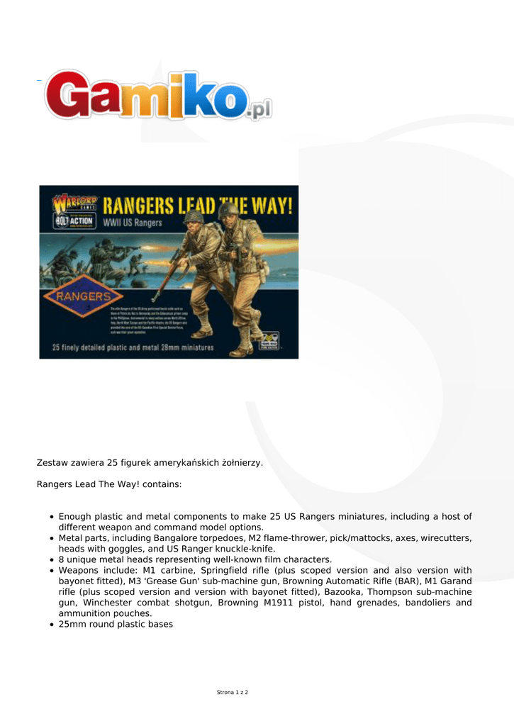 Zestaw zawiera 25 figurek amerykańskich żołnierzy. Rangers Lead The Way! contains: Enough plastic and metal components to make 25 US Rangers miniatures, including a host of different weapon and command model options. Metal parts, including Bangalore torpedoes, M2 flame-thrower, pick/mattocks, axes, wirecutters, heads with goggles, and US Ranger knuckle-knife. 8 unique metal heads representing well-known film characters. Weapons include: M1 carbine, Springfield rifle (plus scoped version and also version with bayonet fitted), M3 'Grease Gun' sub-machine gun, Browning Automatic Rifle (BAR), M1 Garand rifle (plus scoped version and version with bayonet fitted), Bazooka, Thompson sub-machine gun, Winchester combat shotgun, Browning M1911 pistol, hand grenades, bandoliers and ammunition pouches. 25mm round plastic bases Strona 1 z 2 Producent Warlord Games Strona 2 z 2