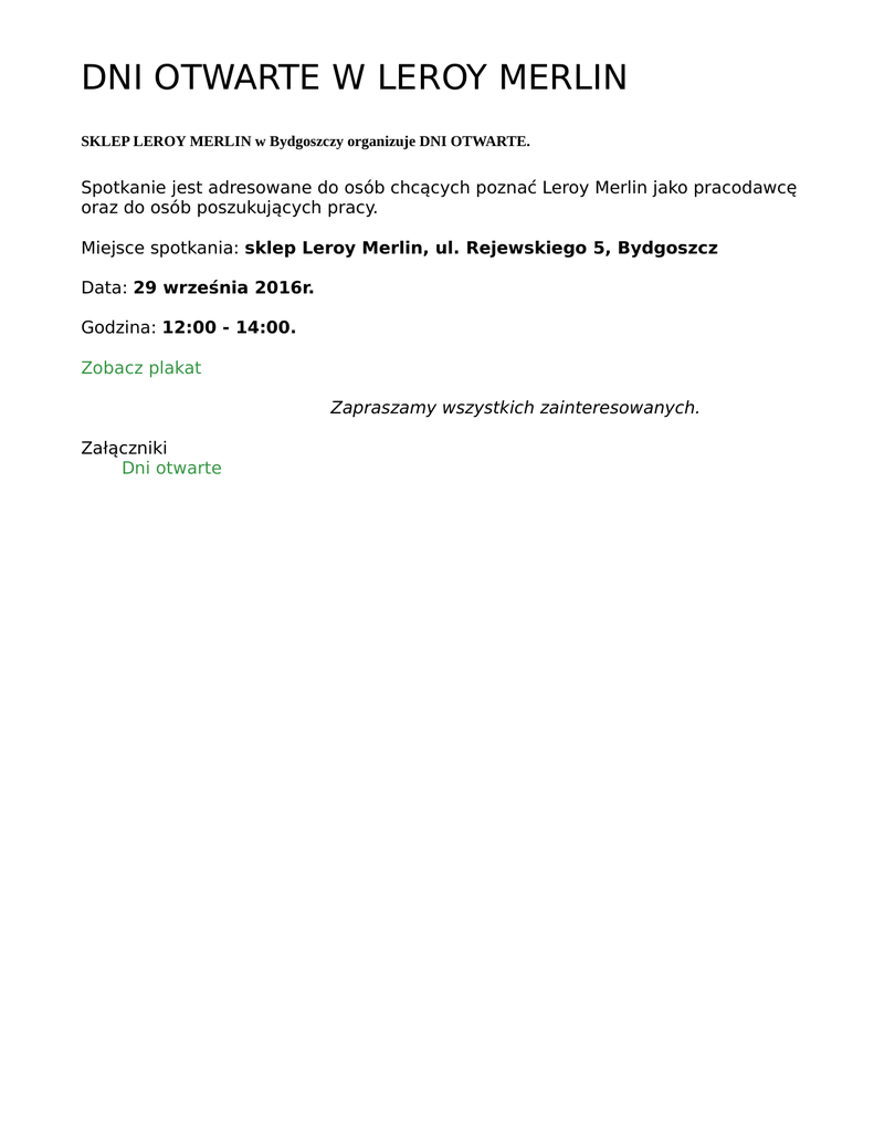 DNI OTWARTE W LEROY MERLIN SKLEP LEROY MERLIN w Bydgoszczy organizuje DNI OTWARTE. Spotkanie jest adresowane do osób chcących poznać Leroy Merlin jako pracodawcę oraz do osób poszukujących pracy. Miejsce spotkania: sklep Leroy Merlin, ul. Rejewskiego 5, Bydgoszcz Data: 29 września 2016r. Godzina: 12:00 - 14:00. Zobacz plakat Zapraszamy wszystkich zainteresowanych. Załączniki Dni otwarte