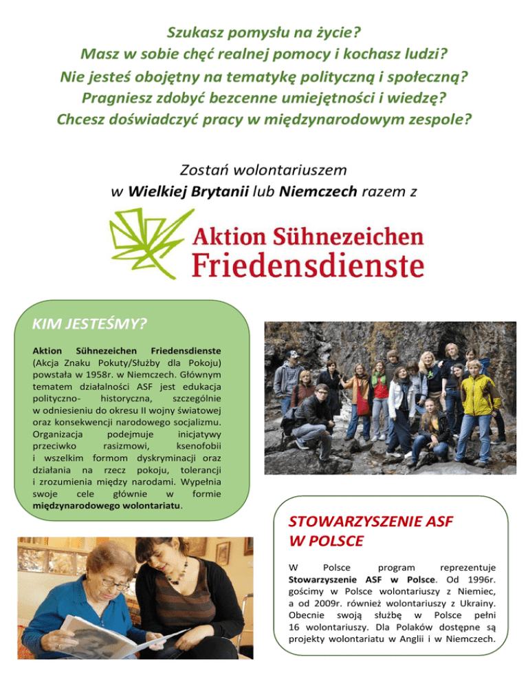 Szukasz pomysłu na życie? Masz w sobie chęd realnej pomocy i kochasz ludzi? Nie jesteś obojętny na tematykę polityczną i społeczną? Pragniesz zdobyd bezcenne umiejętności i wiedzę? Chcesz doświadczyd pracy w międzynarodowym zespole? Zostań wolontariuszem w Wielkiej Brytanii lub Niemczech razem z KIM JESTEŚMY? Aktion Sühnezeichen Friedensdienste (Akcja Znaku Pokuty/Służby dla Pokoju) powstała w 1958r. w Niemczech. Głównym tematem działalności ASF jest edukacja politycznohistoryczna, szczególnie w odniesieniu do okresu II wojny światowej oraz konsekwencji narodowego socjalizmu. Organizacja podejmuje inicjatywy przeciwko rasizmowi, ksenofobii i wszelkim formom dyskryminacji oraz działania na rzecz pokoju, tolerancji i zrozumienia między narodami. Wypełnia swoje cele głównie w formie międzynarodowego wolontariatu. STOWARZYSZENIE ASF W POLSCE W Polsce program reprezentuje Stowarzyszenie ASF w Polsce. Od 1996r. gościmy w Polsce wolontariuszy z Niemiec, a od 2009r. również wolontariuszy z Ukrainy. Obecnie swoją służbę w Polsce pełni 16 wolontariuszy. Dla Polaków dostępne są projekty wolontariatu w Anglii i w Niemczech. WOLONTARIAT Wolontariusze ASF pracują z osobami znajdującymi się w trudnej sytuacji społecznej, poszkodowanymi w okresie II wojny światowej, niepełnosprawnymi, uchodźcami, w projektach edukacyjnych z dziedziny historycznej i politycznej, w miejscach pamięci oraz w organizacjach antyrasistowskich. Wolontariat trwa 12 miesięcy. Rozpoczyna się we wrześniu, a kooczy się w sierpniu następnego roku. W czasie trwania wolontariatu ASF organizuje seminaria dla wolontariuszy. ASF ponosi koszty podróży wolontariusza na początku i na koocu wolontariatu, a także dojazdu na wszystkie seminaria. Wolontariusze otrzymują kieszonkowe na wyżywienie i własne wydatki, mają zagwarantowane ubezpieczenie. ASF opłaca także mieszkanie. Kandydaci do wolontariatu powinni przesłać na adres Stowarzyszenia ASF w Polsce następujące dokumenty (w języku niemieckim lub angielskim – zależnie od kraju, w którym chcą pracować): - życiorys, - aplikacja (formularz →www.asf-ev.de) - dwa listy polecające - 4 zdjęcia Obowiązkową częścią procesu rekrutacyjnego jest spotkanie zaproszonych kandydatów na seminarium wyboru. Szczegóły zostaną podane osobom zainteresowanym na koocu stycznia. JESTEŚ ZAINTERESOWANY? Napisz do nas lub zadzwoo, żeby zapytad o szczegóły! e-mail: [email protected], tel.: 012 280 62 87 Stowarzyszenie ASF w Polsce, Piekary 2, 32-060 Liszki Więcej informacji na temat projektów, raporty wolontariuszy oraz galerie zdjęd można znaleźd na www.asf-ev.de Termin aplikowania upływa 15 lutego 2015r.