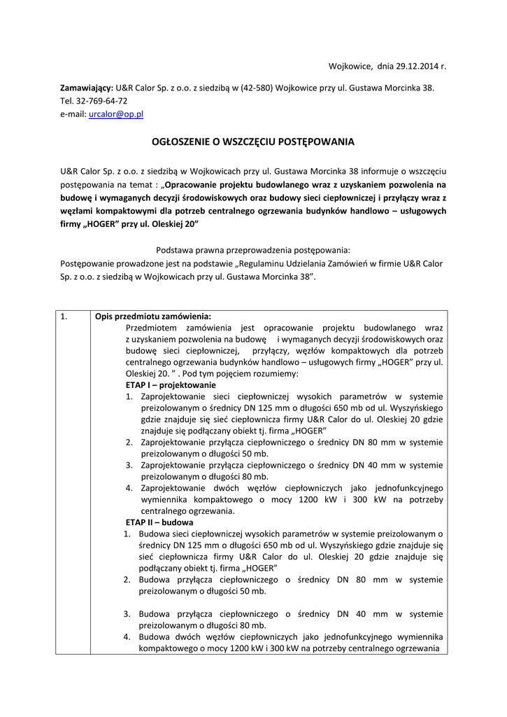 Wojkowice, dnia 29.12.2014 r. Zamawiający: U&R Calor Sp. z o.o. z siedzibą w (42-580) Wojkowice przy ul. Gustawa Morcinka 38. Tel. 32-769-64-72 e-mail: [email protected] OGŁOSZENIE O WSZCZĘCIU POSTĘPOWANIA U&R Calor Sp. z o.o. z siedzibą w Wojkowicach przy ul. Gustawa Morcinka 38 informuje o wszczęciu postępowania na temat : „Opracowanie projektu budowlanego wraz z uzyskaniem pozwolenia na budowę i wymaganych decyzji środowiskowych oraz budowy sieci ciepłowniczej i przyłączy wraz z węzłami kompaktowymi dla potrzeb centralnego ogrzewania budynków handlowo – usługowych firmy „HOGER” przy ul. Oleskiej 20” Podstawa prawna przeprowadzenia postępowania: Postępowanie prowadzone jest na podstawie „Regulaminu Udzielania Zamówień w firmie U&R Calor Sp. z o.o. z siedzibą w Wojkowicach przy ul. Gustawa Morcinka 38”. 1. Opis przedmiotu zamówienia: Przedmiotem zamówienia jest opracowanie projektu budowlanego wraz z uzyskaniem pozwolenia na budowę i wymaganych decyzji środowiskowych oraz budowę sieci ciepłowniczej, przyłączy, węzłów kompaktowych dla potrzeb centralnego ogrzewania budynków handlowo – usługowych firmy „HOGER” przy ul. Oleskiej 20. ” . Pod tym pojęciem rozumiemy: ETAP I – projektowanie 1. Zaprojektowanie sieci ciepłowniczej wysokich parametrów w systemie preizolowanym o średnicy DN 125 mm o długości 650 mb od ul. Wyszyńskiego gdzie znajduje się sieć ciepłownicza firmy U&R Calor do ul. Oleskiej 20 gdzie znajduje się podłączany obiekt tj. firma „HOGER” 2. Zaprojektowanie przyłącza ciepłowniczego o średnicy DN 80 mm w systemie preizolowanym o długości 50 mb. 3. Zaprojektowanie przyłącza ciepłowniczego o średnicy DN 40 mm w systemie preizolowanym o długości 80 mb. 4. Zaprojektowanie dwóch węzłów ciepłowniczych jako jednofunkcyjnego wymiennika kompaktowego o mocy 1200 kW i 300 kW na potrzeby centralnego ogrzewania. ETAP II – budowa 1. Budowa sieci ciepłowniczej wysokich parametrów w systemie preizolowanym o średnicy DN 125 mm o długości 650 mb od ul. Wyszyńskiego gdzie znajduje się sieć ciepłownicza firmy U&R Calor do ul. Oleskiej 20 gdzie znajduje się podłączany obiekt tj. firma „HOGER” 2. Budowa przyłącza ciepłowniczego o średnicy DN 80 mm w systemie preizolowanym o długości 50 mb. 3. Budowa przyłącza ciepłowniczego o średnicy DN 40 mm w systemie preizolowanym o długości 80 mb. 4. Budowa dwóch węzłów ciepłowniczych jako jednofunkcyjnego wymiennika kompaktowego o mocy 1200 kW i 300 kW na potrzeby centralnego ogrzewania 5. . Wykonanie wymaganych prób ciśnieniowych i prześwietleń spawów w ilości 100% oraz odbiorów powykonawczych. 6. Wykonanie planów geodezyjnych powykonawczych. 7. Uzyskanie pozwolenia na użytkowanie. Zakres prac od pkt 1 do pkt 4 należy wykonać wraz z systemem alarmowym i niezbędną armaturą oraz odtworzeniem nawierzchni i doprowadzeniem terenu do stanu pierwotnego. 2. 3. 4. 5. 6 7. Warunki udziału w postępowaniu oraz dokumenty potwierdzające spełnienie wymagań Zamawiającego: O udzielenie zamówienia mogą ubiegać się Wykonawcy, którzy spełniają poniższe warunki: a) Posiadają odpowiednie uprawnienia do w/w działalności gospodarczej -przedstawienie aktualnego odpisu KRS. b) Projekt sieci i przyłączy ciepłowniczych powinien być opracowany według niniejszych wytycznych zgodnie z: „Warunkami technicznymi przyłączenia do sieci ciepłowniczej nowych obiektów” wydawanymi indywidualnie dla określonego zadania przez firmę U&R Calor Sp. z o.o. Obowiązującymi przepisami prawa, w tym w szczególności: Prawo budowlane, Prawo energetyczne, Prawo o miarach, Ustawa o dozorze technicznym, Ustawa o wyrobach budowlanych. c) Przedstawienie wzoru umowy na zaprojektowanie oraz wykonanie niniejszego zadania. Termin realizacji zamówienia: Termin wykonania przedmiotu zamówienie: 22.01.2015– 30.06.2015 Warunki gwarancji: Sieć ciepłownicza – 5 lat ; węzły ciepłownicze – 5 lat. Warunki płatności: Termin płatności - 30 dni po otrzymaniu prawidłowo wystawionej faktury za I etap zadania; 30 dni po otrzymaniu faktury prawidłowo wystawionej faktury za II etap zadania. Termin związania ofertą: Ustala się, że składający ofertę pozostaje nią związany przez 30 dni. Bieg terminu związania ofertą rozpoczyna się wraz z upływem terminu składania ofert. Zamawiający może przed upływem terminu związania ofertą zwrócić się do Wykonawców o wyrażenie zgody na przedłużenie tego terminu o oznaczony okres. Kryteria wyboru oferty: Przy wyborze najkorzystniejszej oferty Zamawiający kierował się będzie następującymi kryteriami i ich wagą: Lp Kryterium Cena Waga (punkty) 90 1 Warunki gwarancji 2 10 W trakcie oceny ofert, kolejno ocenianym ofertom, zostaną przyznane dla poszczególnych kryteriów punkty, według następujących zasad: Cn C0 = ------------------- x waga kryterium Cob C0 = ocena punktowa Cn = cena najniższa wśród złożonych ofert Cob = cena oferty badanej Gob G0 = ------------------- x waga kryterium Gm G0 = ocena punktowa Gm = minimalny okres gwarancji wymagany przez Zamawiającego - 5 lat Gob = okres gwarancji w badanej ofercie Punkty wyliczone w każdym kryterium zostaną zaokrąglone do 2 miejsc po przecinku, a następnie zsumowane. Zamawiający wybierze ofertę, która uzyska największą ilość punktów. W przypadku, gdy złożone zostaną w postępowaniu oferty o tej samej wartości (cenie) Zamawiający zastrzega sobie możliwość wezwania Wykonawców, którzy złożyli te oferty, do złożenia ofert dodatkowych. 8. Wykaz dokumentów które należy dołączyć do składanej oferty: 1. Odpis z właściwego rejestru lub centralnej ewidencji i informacji o działalności gospodarczej wystawiony nie wcześniej niż 6 miesięcy przed upływem terminu składania ofert. 2. Pełnomocnictwo osób upoważnionych do podpisywania oferty oraz do zawarcia umowy, o ile w imieniu Wykonawcy będzie 