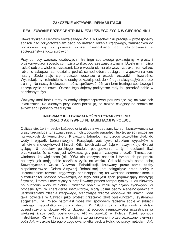 ZAŁOŻENIE AKTYWNEJ REHABILITACJI REALIZOWANE PRZEZ CENTRUM NIEZALEŻNEGO ŻYCIA W CIECHOCINKU Stowarzyszenie Centrum Niezależnego Życia w Ciechocinku pracuje w profesjonalny sposób nad przygotowaniem osób po urazach rdzenia kręgowego, zmuszonych do poruszania się za pomocą wózka inwalidzkiego, do funkcjonowania w społeczeństwie ludzi zdrowych. Przy pomocy wzorców osobowych i treningu sportowego pokazujemy w prosty i przekonywujący sposób, co można zyskać poprzez zajęcia z nami. Dzięki nim można radzić sobie z wieloma rzeczami, które wydają się na pierwszy rzut oka niemożliwe: robienie zakupów, samodzielna podróż samochodem, pociągiem, wyprawa na łono natury. Życie staje się prostsze, weselsze a przede wszystkim niezależne. Wyszukujemy i rekrutujemy te osoby pokazując cel, do którego należy dążyć poprzez trening. Na naszych obozach można spróbować różnych form treningu sportowego i zacząć życie od nowa. Oprócz tego dajemy praktyczne rady jak poradzić sobie w codziennym życiu. Wszyscy nasi instruktorzy to osoby niepełnosprawne poruszające się na wózkach inwalidzkich. Na własnym przykładzie pokazują, co można osiągnąć na drodze do aktywnego i pełnego treści życia. INFORMACJE O DZIAŁALNOŚCI STOWARZYSZENIA ORAZ O AKTYWNEJ REHABILITACJI W POLSCE Oblicza się, że 3-4 osoby każdego dnia ulegają wypadkom, których konsekwencją są urazy kręgosłupa. Znaczna część z nich z powodu paraplegii lub tetraplegii pozostaje na wózkach do końca życia. Przyczyną tetraplegii są przede wszystkim skoki do wody i wypadki komunikacyjne. Paraplegia zaś bywa skutkiem wypadków w rolnictwie, motocyklowych i innych. Ofiar takich zdarzeń żyje w naszym kraju kilkaset tysięcy. U podstaw polskiego modelu postępowania z tymi osobami tkwi przekonanie, że sukces jest wówczas, gdy pacjent zaczyna chodzić. Tymczasem wiadomo, że większość (ok. 90%) nie zaczyna chodzić i trzeba ich po prostu nauczyć, jak mają sobie radzić w życiu na wózku. Cel taki stawia przed sobą Stowarzyszenie Grupa Aktywnej Rehabilitacji, kreowany przez same osoby niepełnosprawne. Celem Aktywnej Rehabilitacji jest osiągnięcie przez osoby z uszkodzeniem rdzenia kręgowego poruszające się na wózkach samodzielności i niezależności. Metodą prowadzącą do tego celu jest sport poprawiający kondycję fizyczną, któremu towarzyszy skomplikowany proces terapeutyczny ukierunkowany na budzenie wiary w siebie i radzenie sobie w wielu sytuacjach życiowych. W procesie tym, w charakterze instruktorów, biorą udział osoby niepełnosprawne z uszkodzeniami rdzenia kręgowego, stanowiące wzorce osobowe dla innych. Idea taka powstała w Szwecji jako protest przeciwko zbyt opiekuńczemu systemowi socjalnemu. W Polsce natomiast może być sposobem radzenia sobie w sytuacji wielkiego niedostatku usług socjalnych. W 1986 i 87 r. kilka osób z Polski uczestniczyło w obozie AR w Szwecji. Z powodu niemożliwości uczestniczenia większej liczby osób postanowiono AR wprowadzić w Polsce. Dzięki pomocy instruktorów RG w 1988 r. w Lublinie zorganizowano i przeprowadzono pierwszy obóz AR, w trakcie którego przygotowano kilka osób z Polski do pracy metodami AR. Przez następne kilka lat wspólnie z RG prowadzono tego typu obozy na terenie Polski oraz Szwecji. Przeprowadzono wiele imprez integracyjno - sportowych, mających na celu podniesienie sprawności i aktywności osób po urazach rdzenia kręgowego, m.in. Igrzyska AR, największą imprezę, nie tylko w Polsce, dla osób poruszających się na wózkach. Na dzień dzisiejszy, korzystając z przekazanych nam doświadczeń przez Rekryteringsgruppen, sami organizujemy i prowadzimy działalność Aktywnej Rehabilitacji. Obecnie co roku organizujemy kilkanaście obozów pn. „Warsztaty Niezależnego Życia”. Głównym miejscem organizacji tych obozów jest Ośrodek Szkolenia Pourazowego i Wolontariatu – Centrum Niezależnego Życia w Ciechocinku. Dodatkowo Stowarzyszenie CNŻ organizuje liczne szkolenia i imprezy, w których członkowie naszego Stowarzyszenie biorą udział zarówno jako kadra instruktorska, jak również jako uczestnicy. W metodzie Aktywnej Rehabilitacji zainteresowani mają świadomość, że nie lekarz, rehabilitant czy placówka służby zdrowia, ale oni sami - niepełnosprawni odpowiadają za proces ich rehabilitacji. To oni powinni wiedzieć, jakie stawiać sobie cele i jak chcą je osiągnąć. Muszą mieć wiedzę i świadomość tego, jak funkcjonuje ich organizm, co jest potrzebne do poprawy jego funkcjonowania oraz jak trzeba dbać o utrzymanie kondycji. Na tym polega podmiotowość człowieka niepełnosprawnego w procesie aktywnej rehabilitacji. Tymczasem wielu z nich przeżyło na wózkach kilka lub kilkanaście lat nie robiąc ze sobą nic. Dla wielu nie istnieją żadne rygory czasowe. Tym ludziom trzeba uświadomić, że żyją w społeczeństwie i mimo koniecznego wysiłku muszą się do niego zbliżyć. Muszą wiedzieć, że społeczeństwo nie lubi gorszych. Jeśli ktoś, kto jeździ na wózku, nie nawiązuje kontaktów, żyje w ukryciu, to inni po prostu go omijają lub nawet są agresywni. Rodzi się więc problem kształtowania osobowości tych ludzi. W tradycyjnie pojmowanym procesie rehabilitacji zakłada się stosunkowo małe uczestnictwo osoby rehabilitowanej. To tę osobę się rehabilituje nie dając jej do końca możliwości decydowania o sobie. My staramy się tak działać aby nasi koledzy będący w podobnej sytuacji życiowej zdawali sobie sprawę z tego, że rehabilitacja jest ich sprawą i oni ponoszą odpowiedzialność za jej wyniki. Wcześniej jednak trzeba ich nauczyć co i jak powinni ze sobą zrobić, a więc dać im świadomość, co to jest za schorzenie, któremu ulegli, jakie mogą być następstwa oraz jak im zapobiegać i jak sobie z nimi radzić. Następnym zadaniem jest nauczyć zainteresowanych jak doprowadzić do maksymalnej wydolności w środ